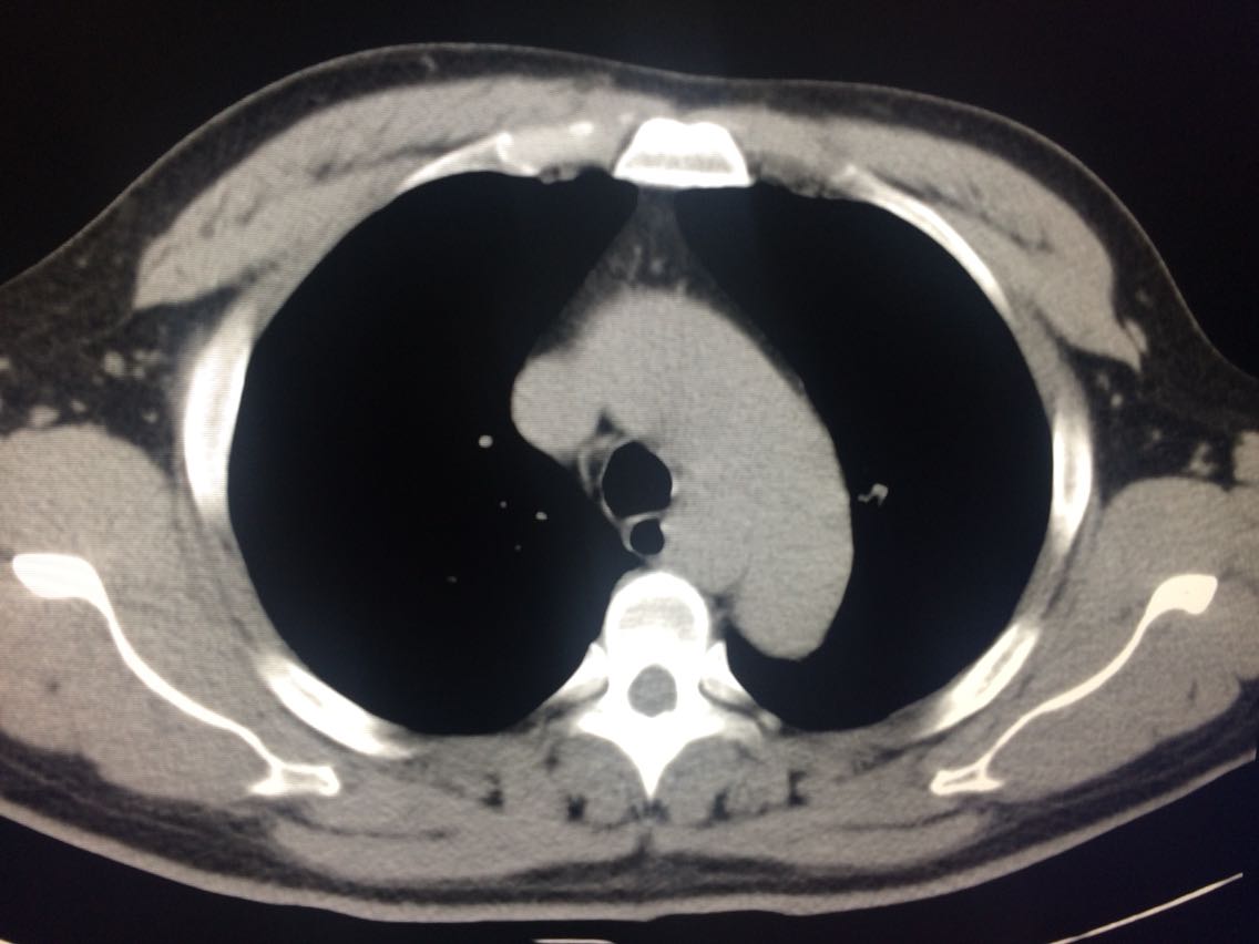 入院后做上消化道造影及CT如图。 门诊胃镜提示距门齿26cm处见食管左壁分叶状粘膜下肿物,表面光滑。