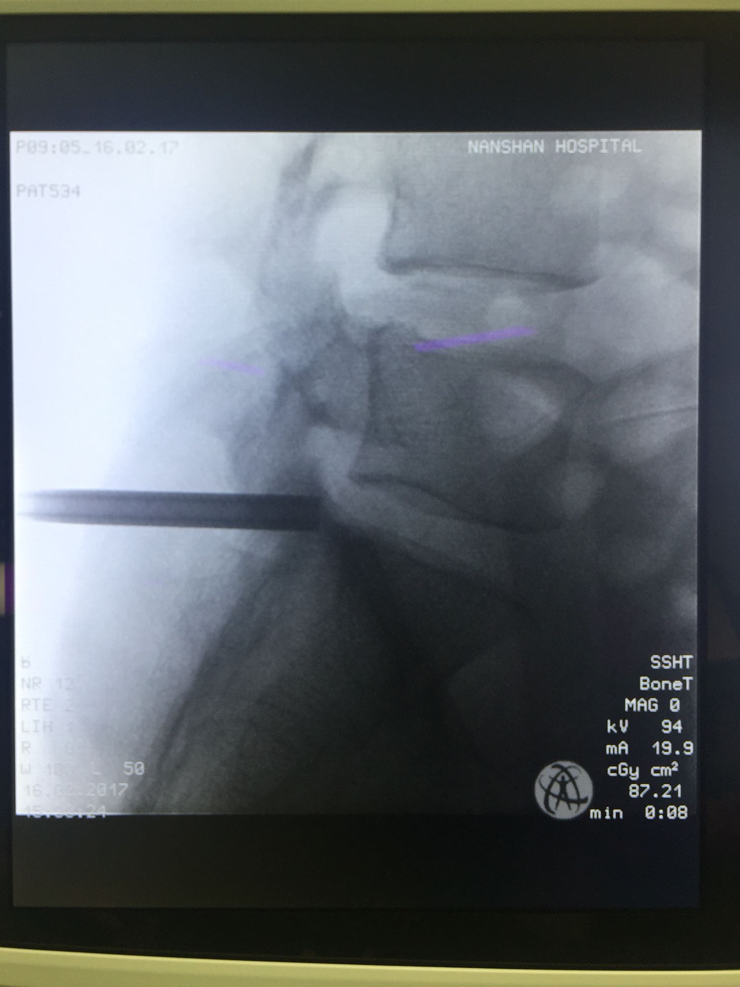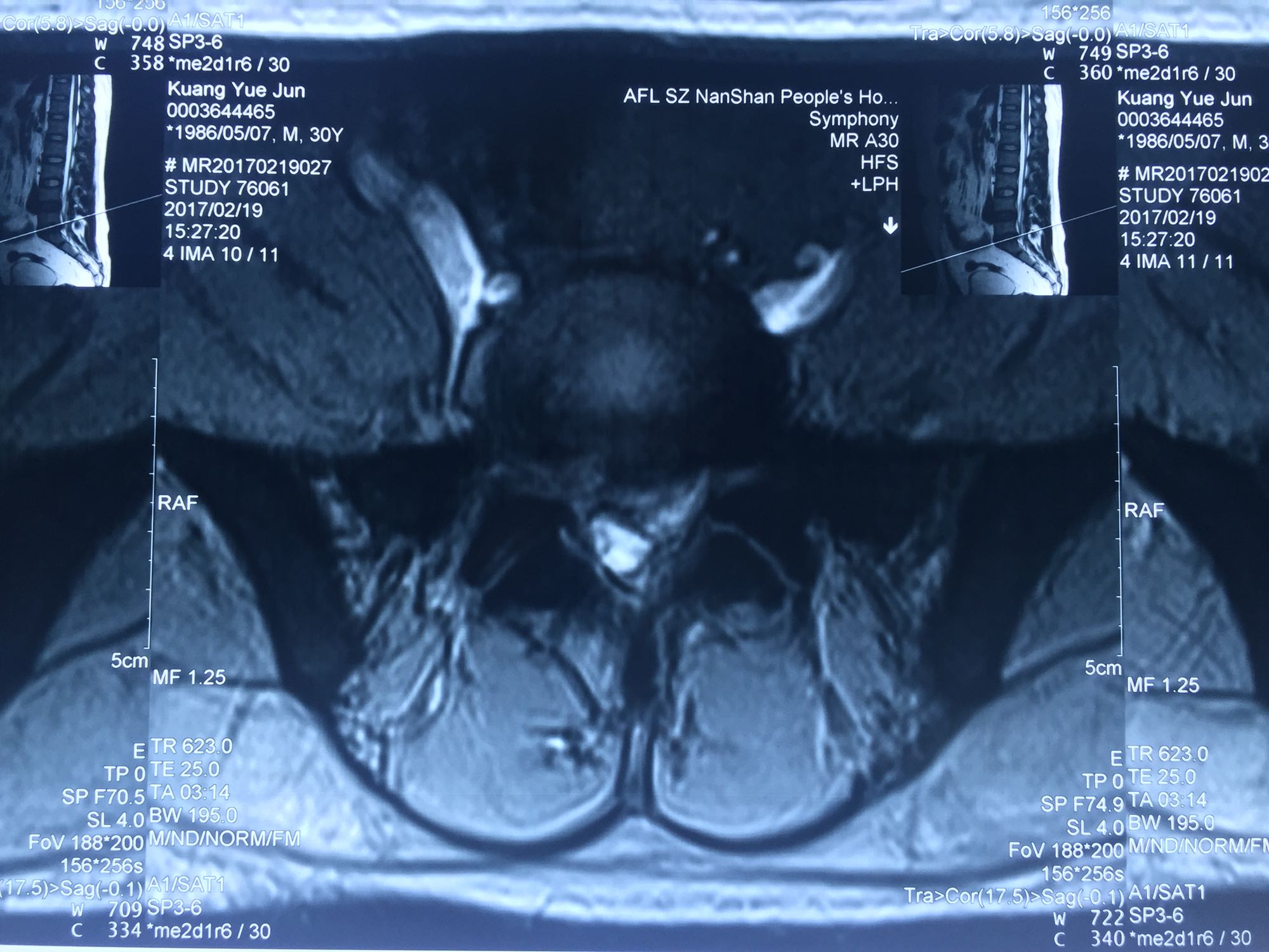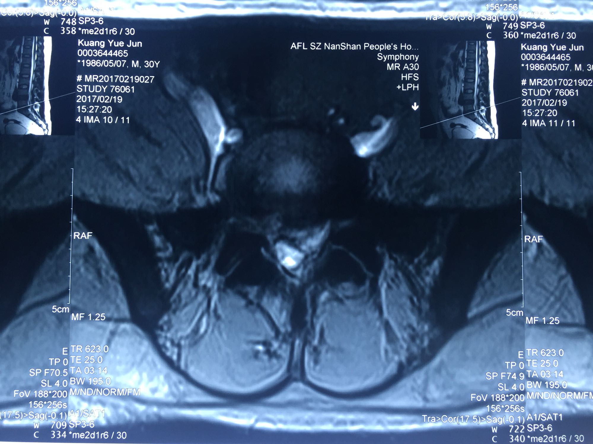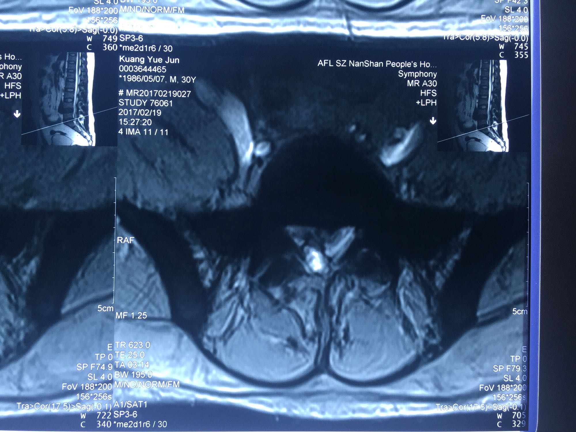 诊断:腰5骶1椎间盘突出症 治疗方案:椎间孔镜下经椎板间入路髓核摘除术