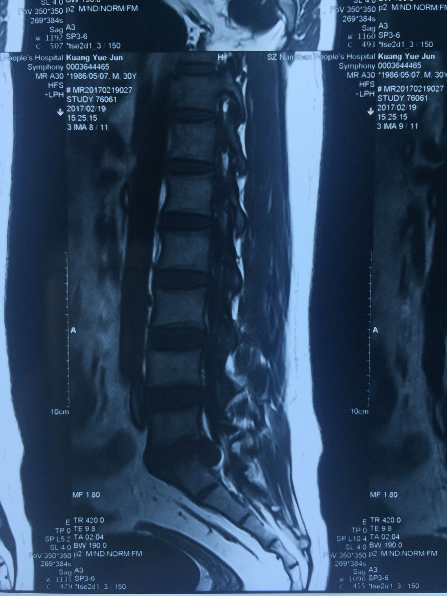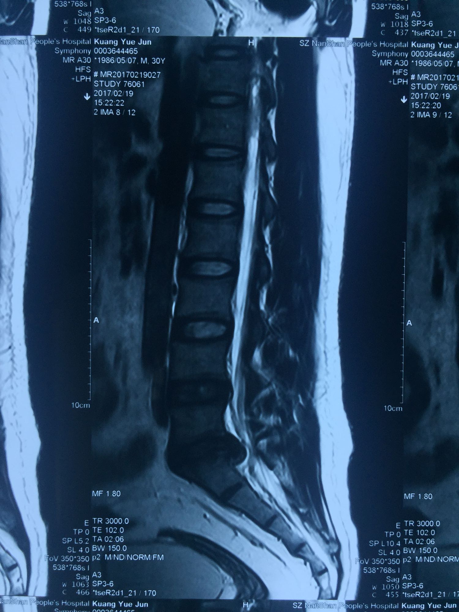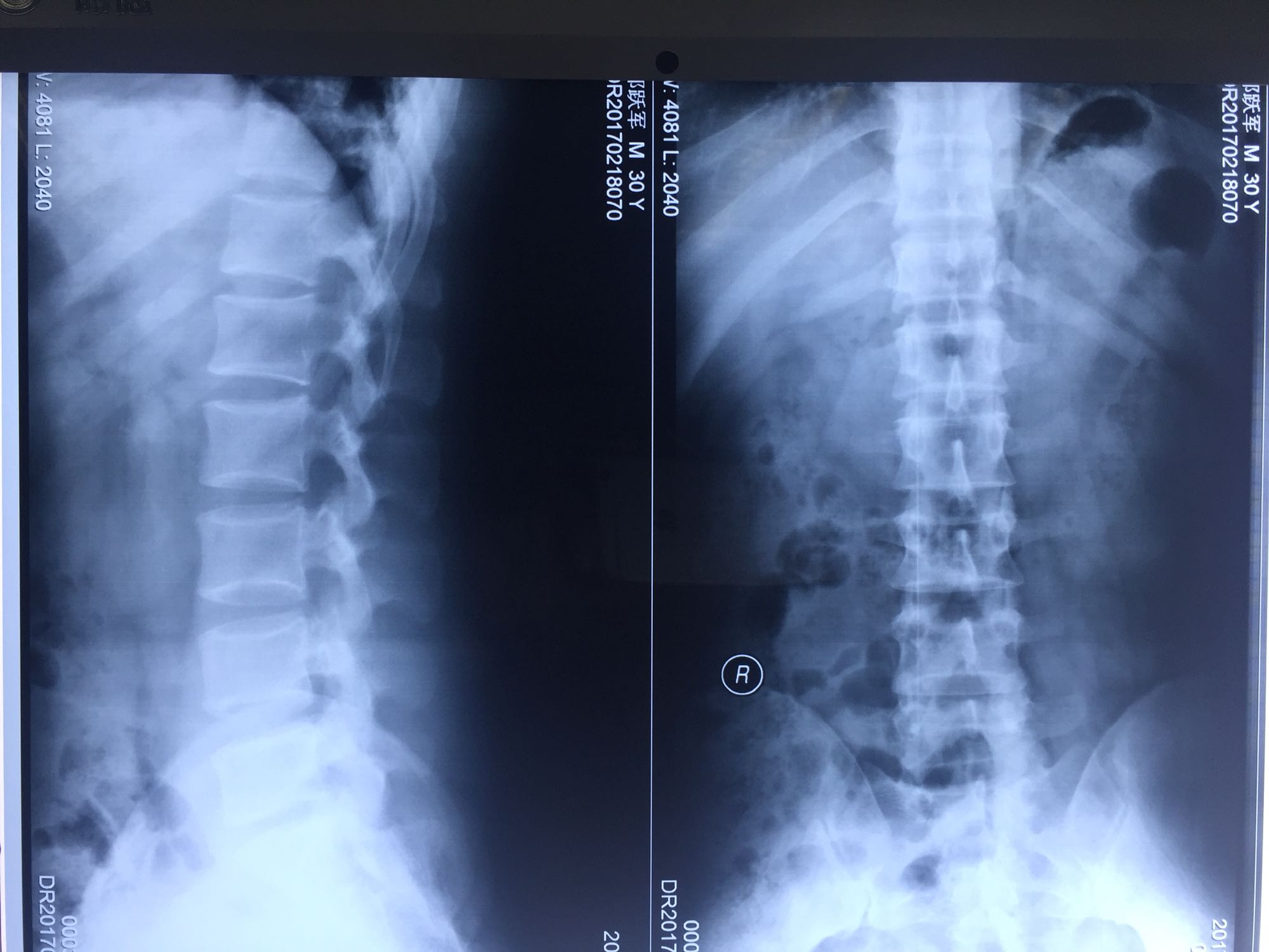 腰骶部肌紧张,腰5骶1棘间及左侧椎旁有压痛及放散痛,左侧坐骨神经出孔处有压痛及放散痛,左侧足背外侧及足底部皮肤感觉麻木,左侧直腿抬高试验阳性(30度)。