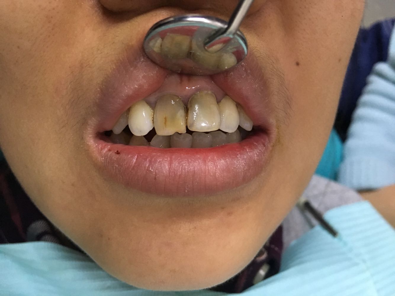 上前牙变色数年 数年前前牙龋齿充填脱落反复继而神经坏死根治后牙体逐渐变色愈加严重