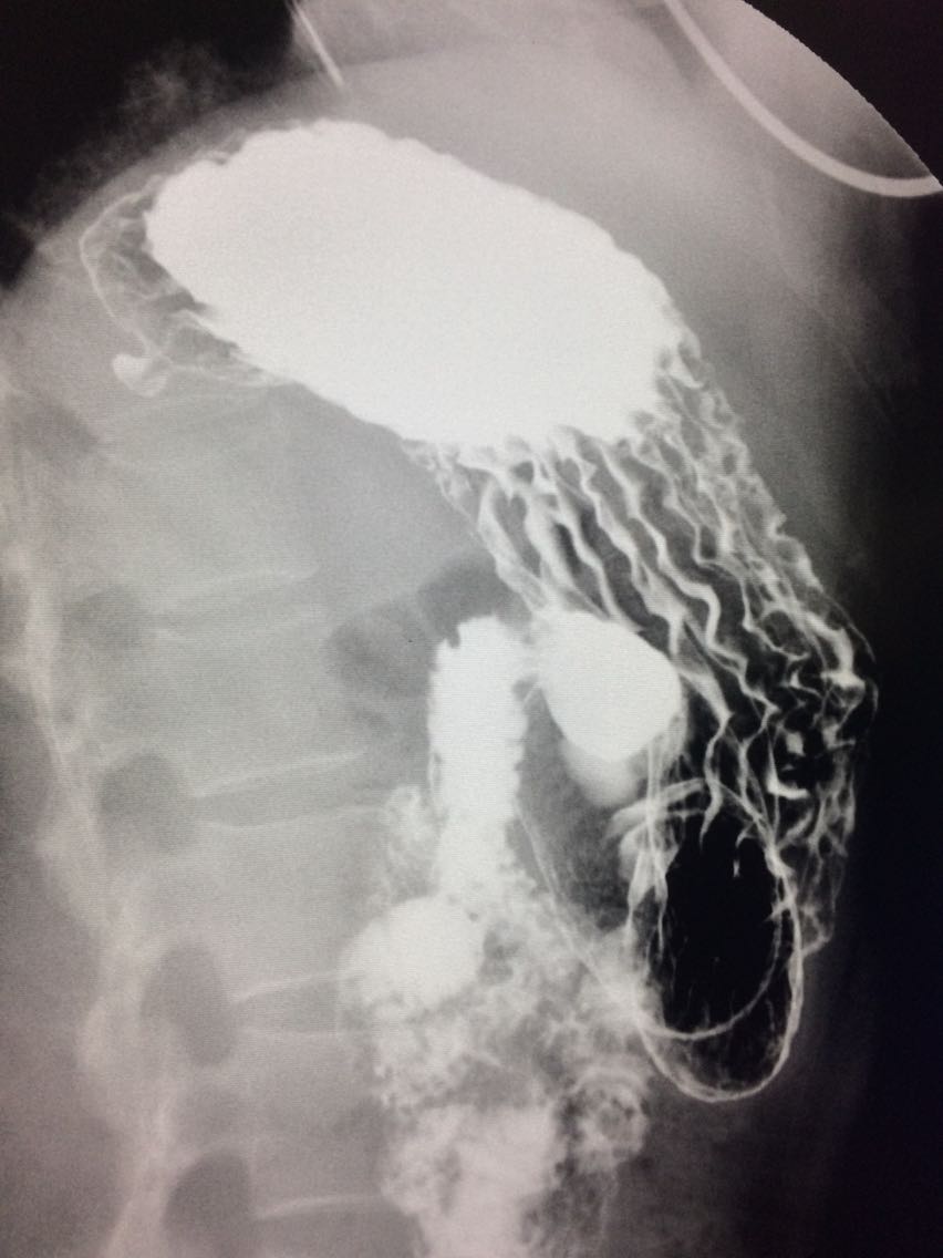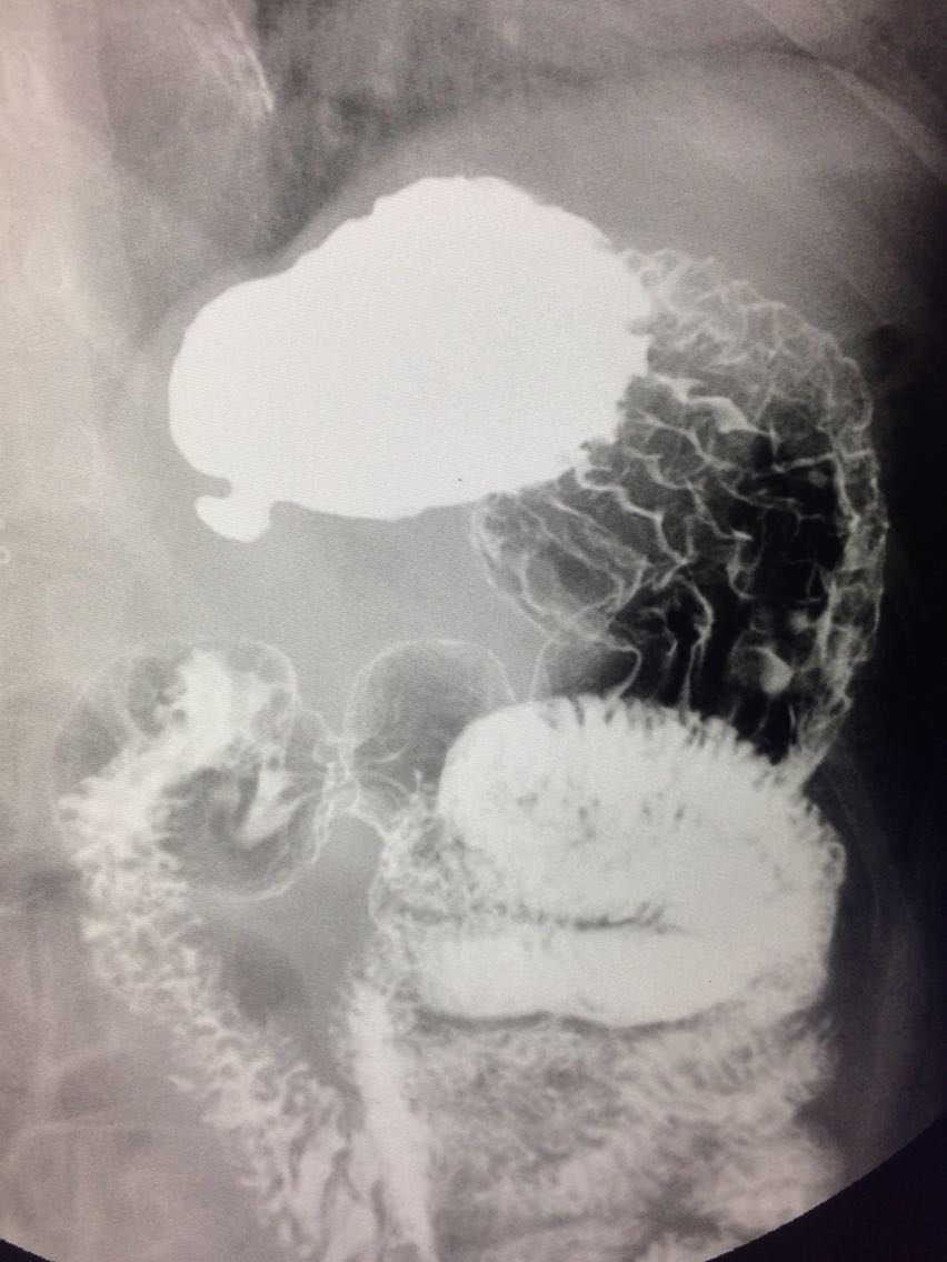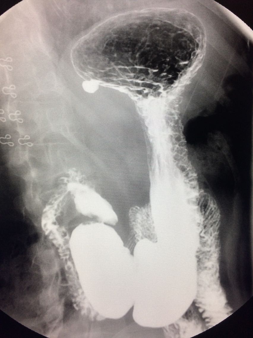 女.47岁 体检来诊。 平素体健,无明显症状。 做上消化道造影如图。