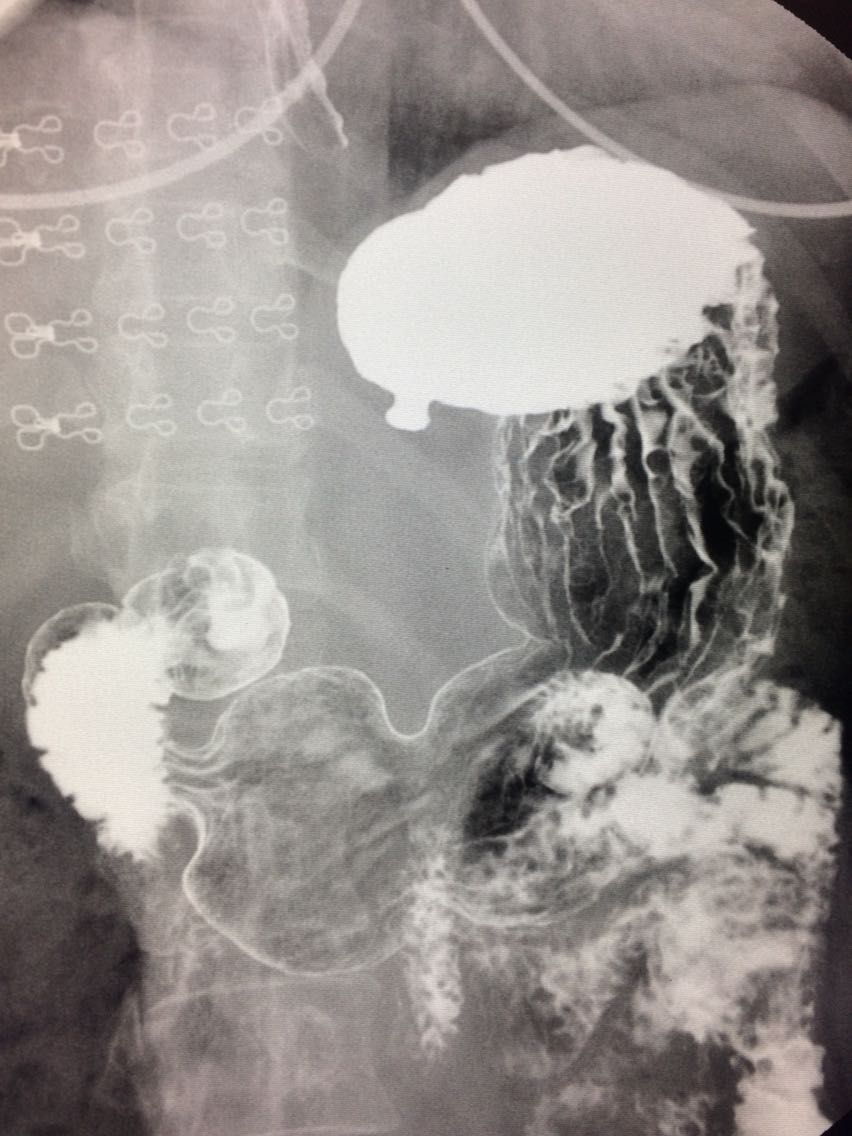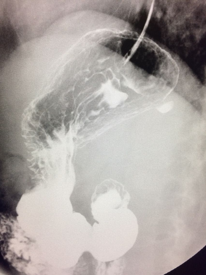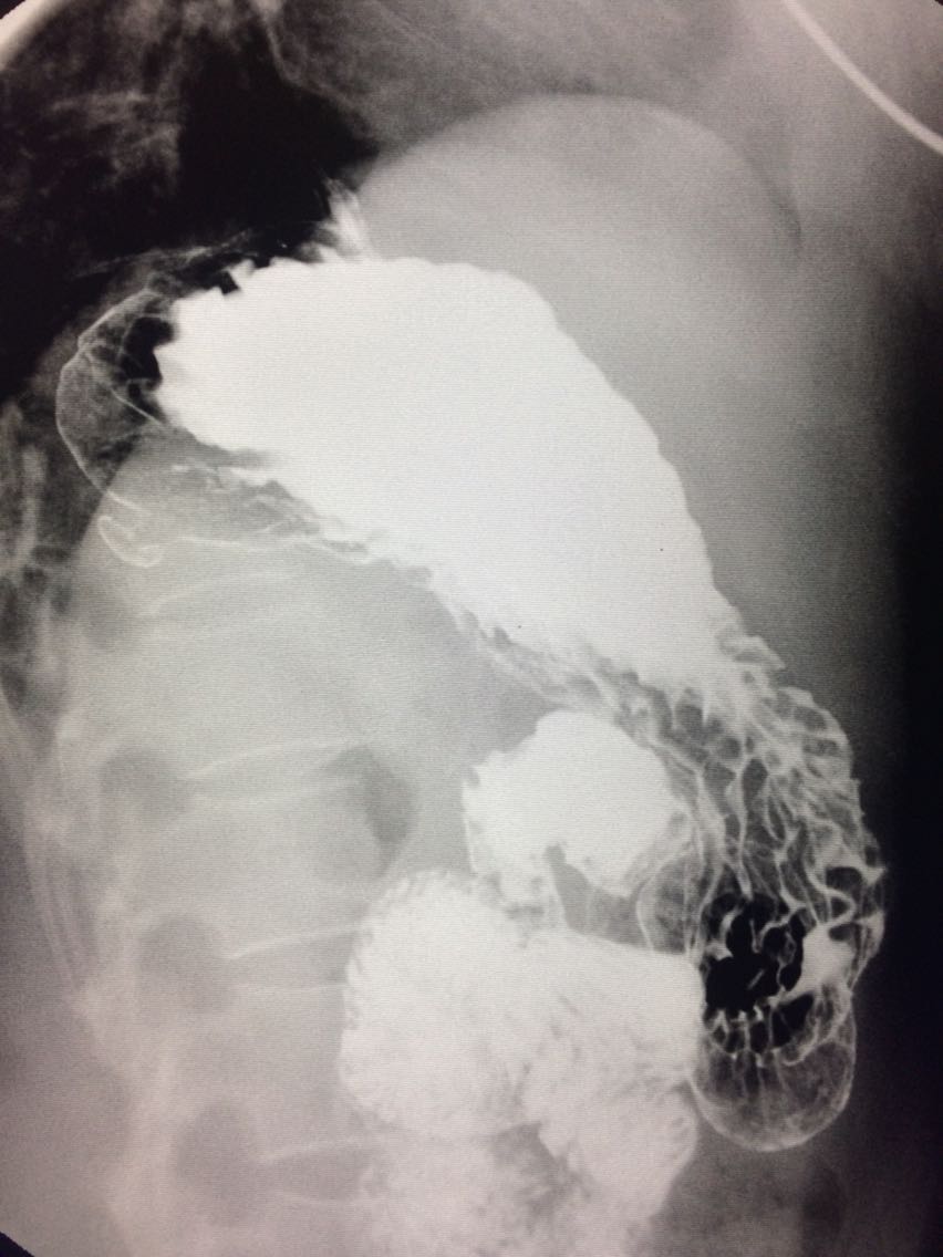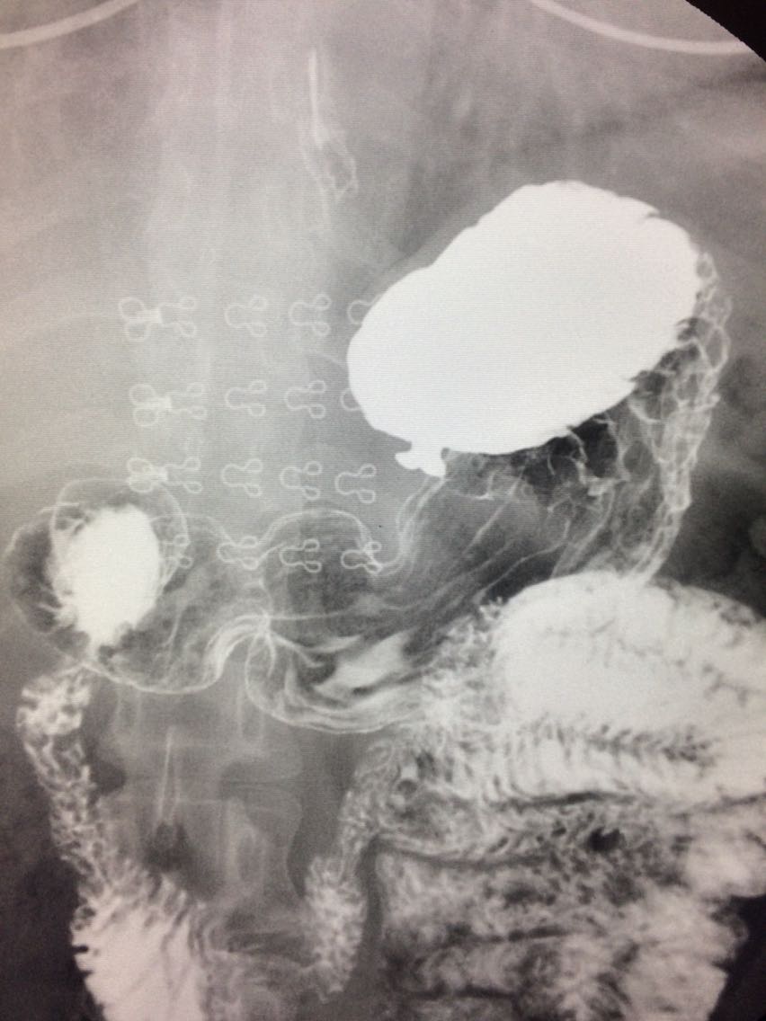 女.47岁 体检来诊。 平素体健,无明显症状。 做上消化道造影如图。