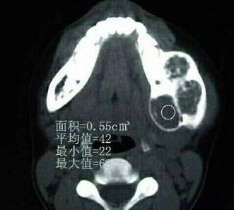 检查及结果: 颌面部左右不对称,左下颌后1|3明显膨隆,可触及鸡蛋大肿物,质硬,局部黏膜无红肿,张口度及张口型正常,CT提示:良性肿物