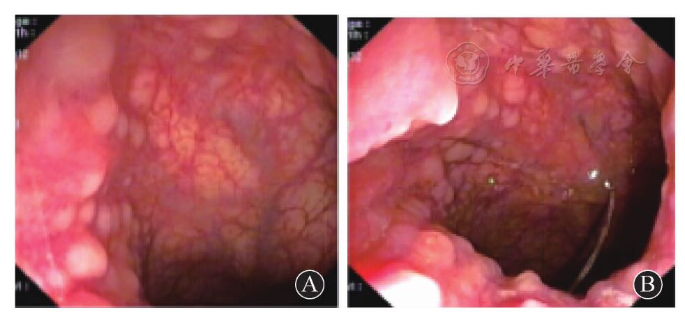 图2治疗后结肠镜检查发现直肠近肛门端息肉消失 A 近肛门近端 B 近肛门远端