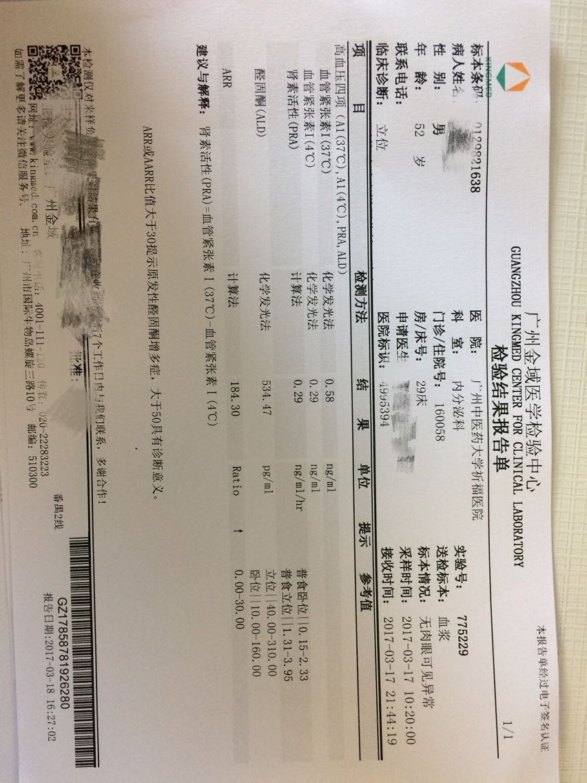查体:全身皮肤未见紫纹、痤疮,无多毛,无“水牛背”、“满月脸”。 心肺腹阴性。 辅查:2015年外院“醛固酮” 800+(具体不详)。 2016年10月冠脉CTA:1.左冠状动脉前降支近中段血管壁见多处偏心性混合密度斑块,伴近段局部管腔轻度狭窄,中段管腔局限性中度狭窄。2.回旋支近段血管壁见偏心性钙化斑,伴局部管腔轻度狭窄;中段血管壁见非钙化斑块,局限性管腔呈中-重度狭窄。3.右侧冠状动脉近段血管壁见偏心性钙化及非钙化斑块,管腔轻度狭窄。后降支局部管腔明显狭窄。前降支中段肌桥(纵深型)。5.主动脉硬化。 入院查:肝功:谷丙转氨酶:ALT 63U/L,谷草转氨酶:AST 46U/L。 电解质:钾:K 3.06mmol/L,二氧化碳结合力:CO2 33.3mmol/L。 肾功、血常规未见明显异常。 立位高血压四项(初筛):醛固酮(ALD):680.54,ARR:138.89,血管紧张素I(37℃):0.88,血管紧张素I(4℃):0.39。 皮质醇(0:00):55.90 nmol/L,皮质醇(08:00):293.50 nmol/L,皮质醇(16:00):140.50 nmol/L。促肾上腺皮质激素(00:00):1.23 pmol/L,促肾上腺皮质激素(08:00):4.70 pmol/L,促肾上腺皮质激素(16:00):3.25 pmol/L。17-羟皮质类固醇(17-OHCS):9.96 mg/24h尿,17-酮皮质类固醇(17-KS):15.92 mg/24h尿。尿香草扁桃酸(VMA):5.42 mg/24h尿,尿液醛固酮(ALD):25.58↑ ug/day。卡托普利试验:立位高血压四项(服药前)固酮(ALD):664.33↑ pmol/L。ARR:265.73↑;立位高血压四项服药后(2小时):醛固酮(ALD):534.47↑ pmol/L,ARR:184.30↑。胸部正侧位: 左侧膈面改变不除外膈下病变,建议CT检查。肾上腺CT平扫+增强:1、左侧肾上腺外侧支结节,考虑腺瘤。 2、左肾小结石。(左侧肾上腺外侧支局部增粗,见小结节状密度影,大小约1.5cm×1.2cm,病灶内可见少许脂肪密度影,增强后轻度强化) 。双侧颈动脉(含颈总、颈内、颈外)彩超:右侧颈动脉内中膜增厚。 肝、胆、胰、脾B超、肾动脉、肾内小动脉(双侧)彩超未见明显