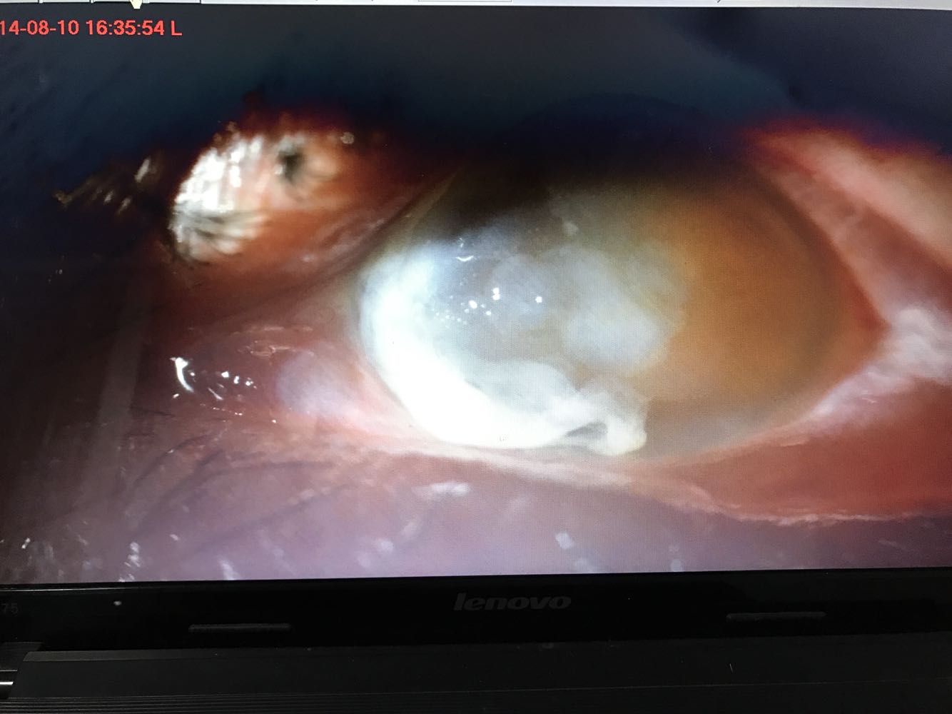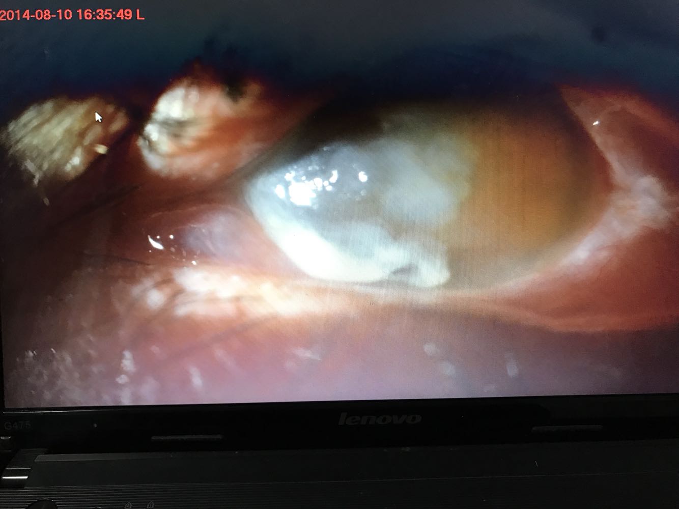 视力:右 1.0,左 眼前手动。左眼睑水肿痉挛,球结膜混合性充血+++,见大量脓性分泌物 。鼻侧角膜上皮部分脱落,基质弥漫性水肿。瞳孔大小可,对光反射迟钝,余窥不清。