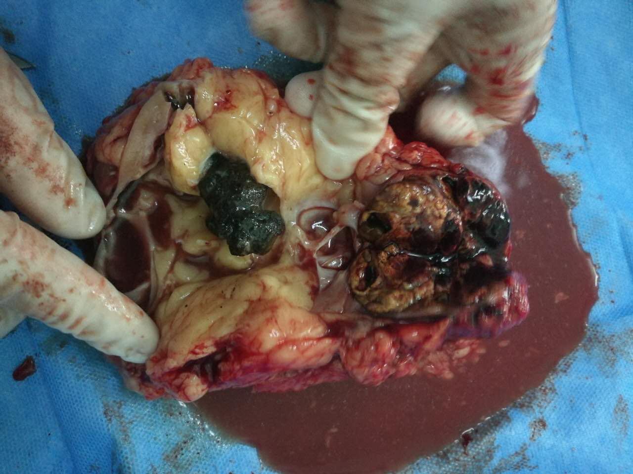 术前诊断:1、左肾癌2、左肾结石3、左肾积水4、左肾萎缩5、前列腺增生6、肺结核 入院后完善检查,拟行TURP,因发现左肾癌,改为先行肾手术。患者左肾癌,同时左肾结石,肾萎缩,决定行根治性肾切除,拟腹腔镜下手术,患者家属不同意,改开放手术,全麻下行根治性左肾切除。术后剖开标本如下图,肿瘤位于肾上极,中间黑色为结石。