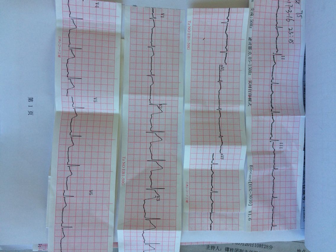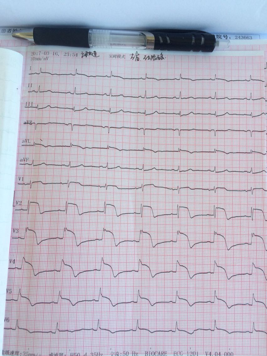 T 36℃ P 66次/分 R20次/分 一般情况可,双肺呼吸音清,心率66次/分,律齐,无杂音。腹软,无压痛、反跳痛,双下肢无浮肿。 到达急诊时心电图: