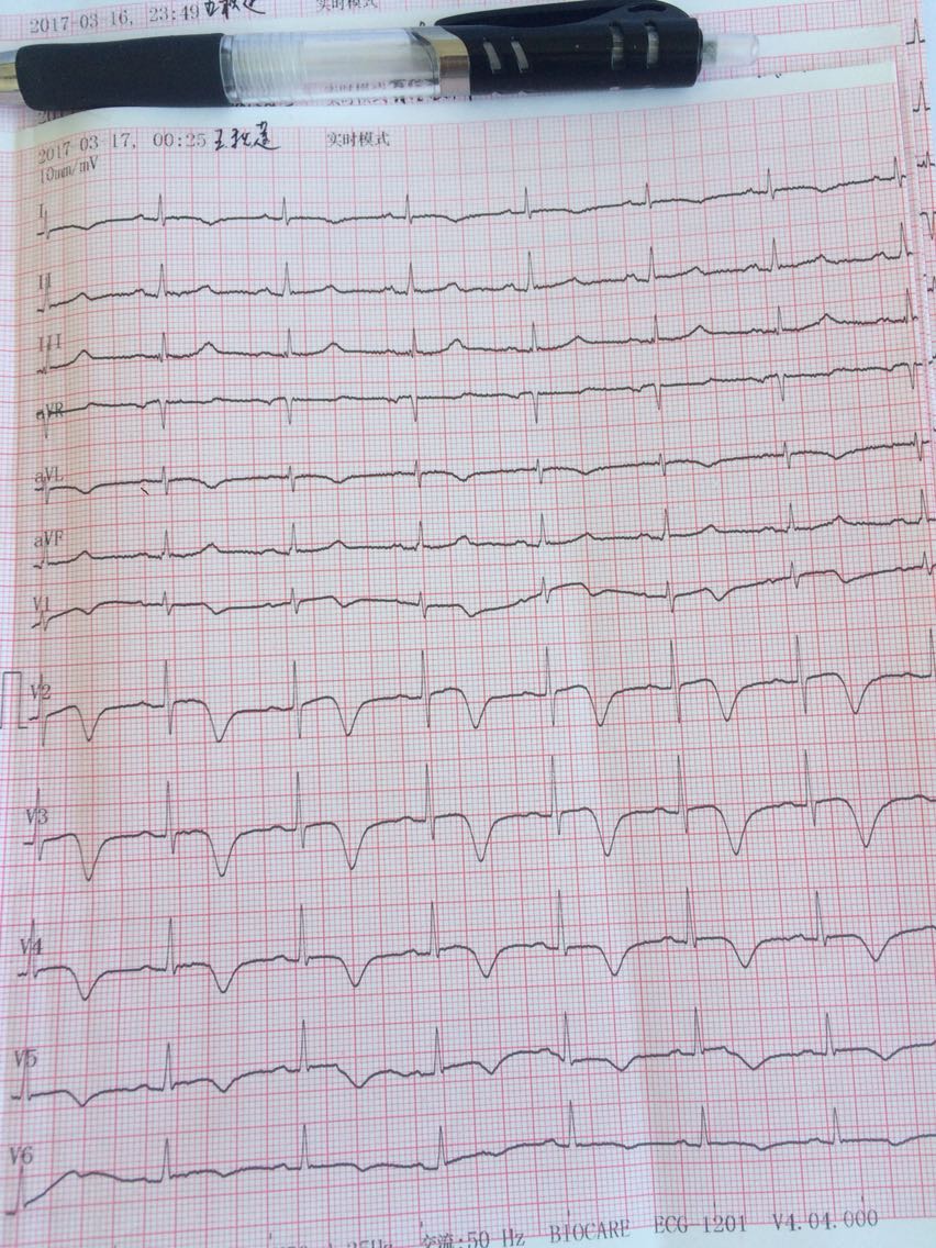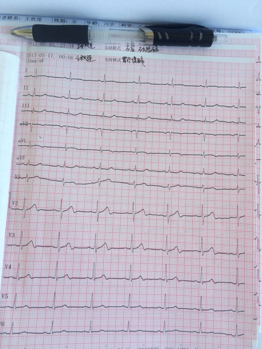 患者,女性,76岁。 阵发性胸憋5天,加重2.5小时。 患者从2017年3月11日始出现活动时胸憋,向左侧肩背部放散,持续时间不详,自服布洛芬、阿莫西林效果欠佳。15日5时胸憋发作持续约4一5小时,自行缓解。16日21时睡眠中胸憋再次发作,程度重,伴轻微出汗,无心悸、气短,无头晕,23:05就诊于我院。