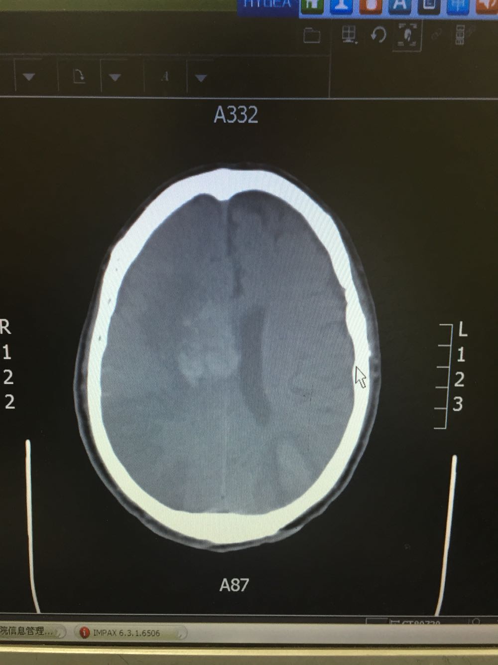 查体:血压161/106mmHg,神志清楚,言语欠流利,查体合作,双瞳孔等大同圆,对光反射存在,双眼向右侧凝视,鼻唇沟对称,伸舌居中,左侧肢体肌力0级,肌张力正常,腱反射对称,双侧痛觉对称,双下肢Babinski(+)Chaddock(+),颈强(-)克氏征(-) 头CT示:脑梗死