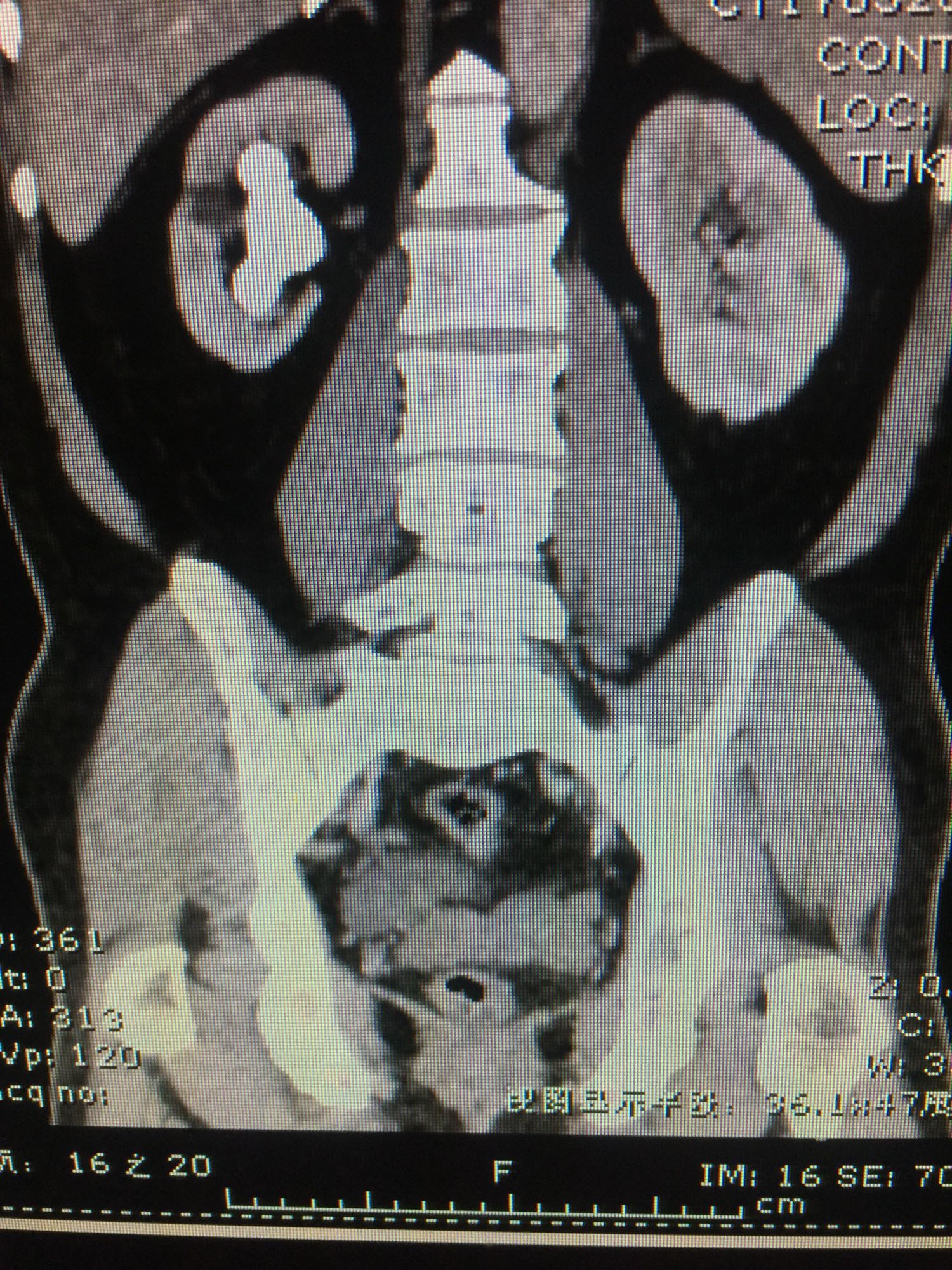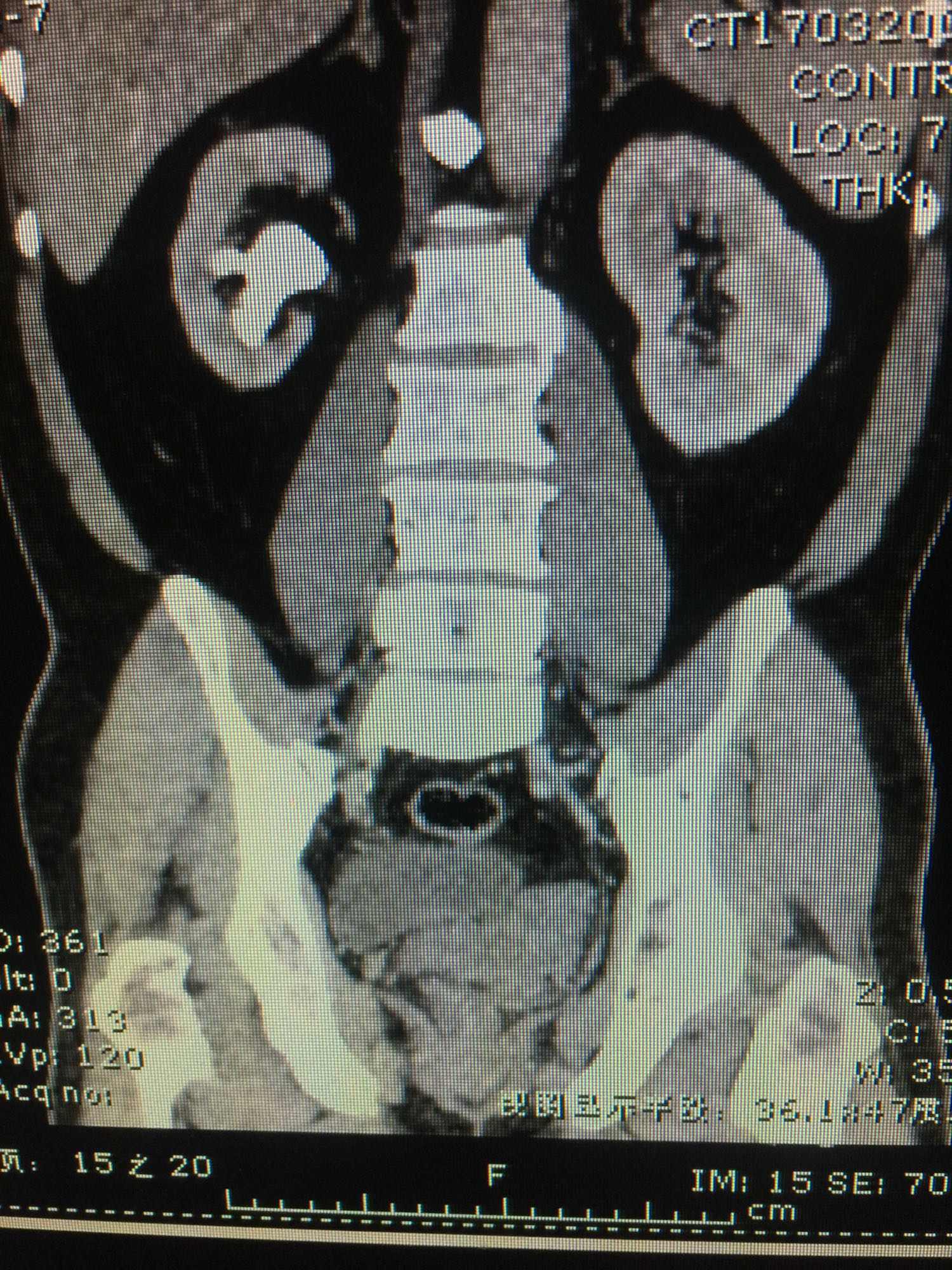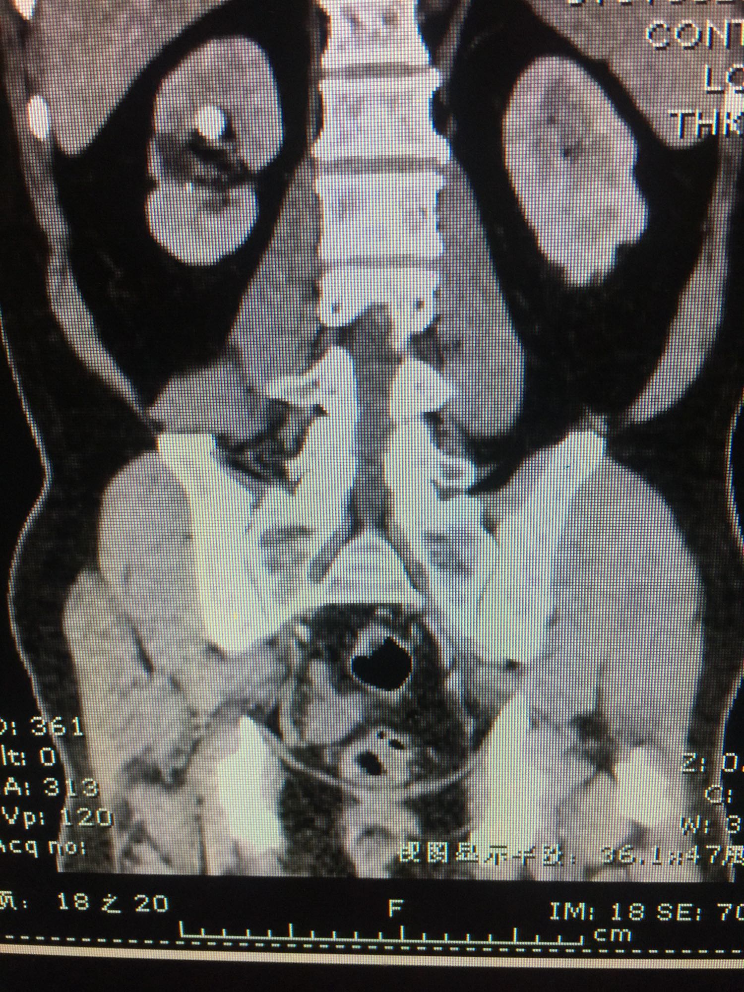 查体:双肾区无叩压痛,膀胱区无叩压痛,无叩浊,前列腺二度,质地中等,无压痛,无结节。CTU提示右肾铸型结石。ECTL 40,R14.5