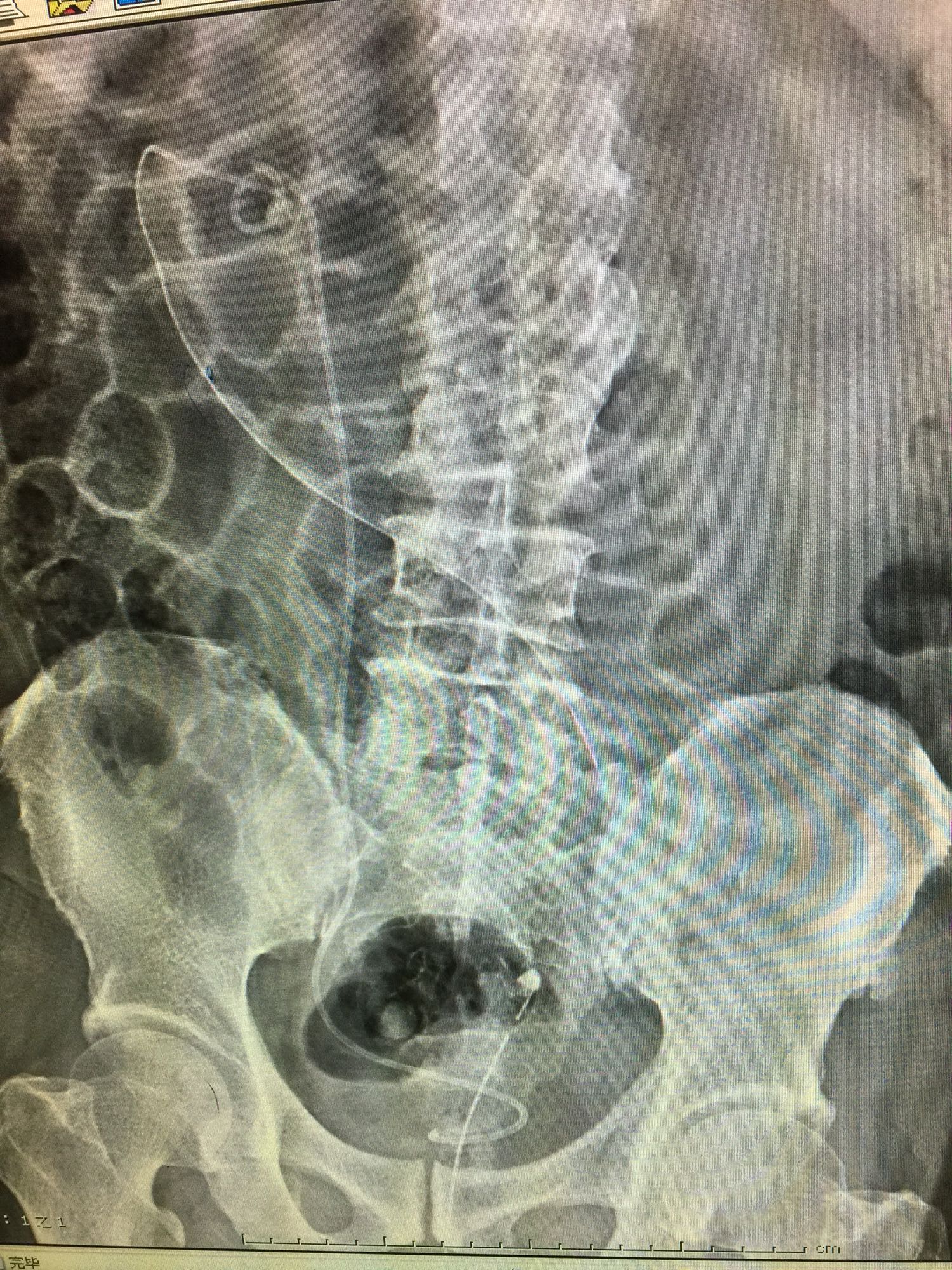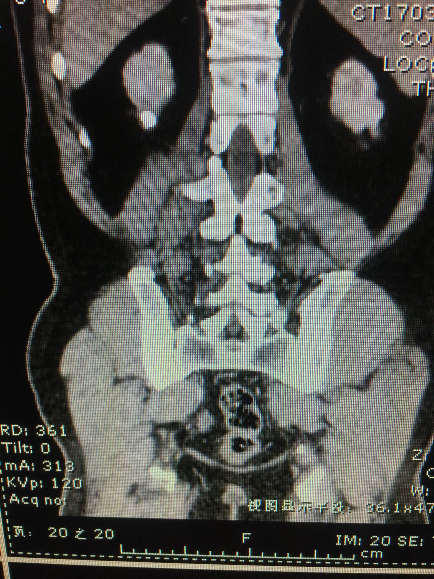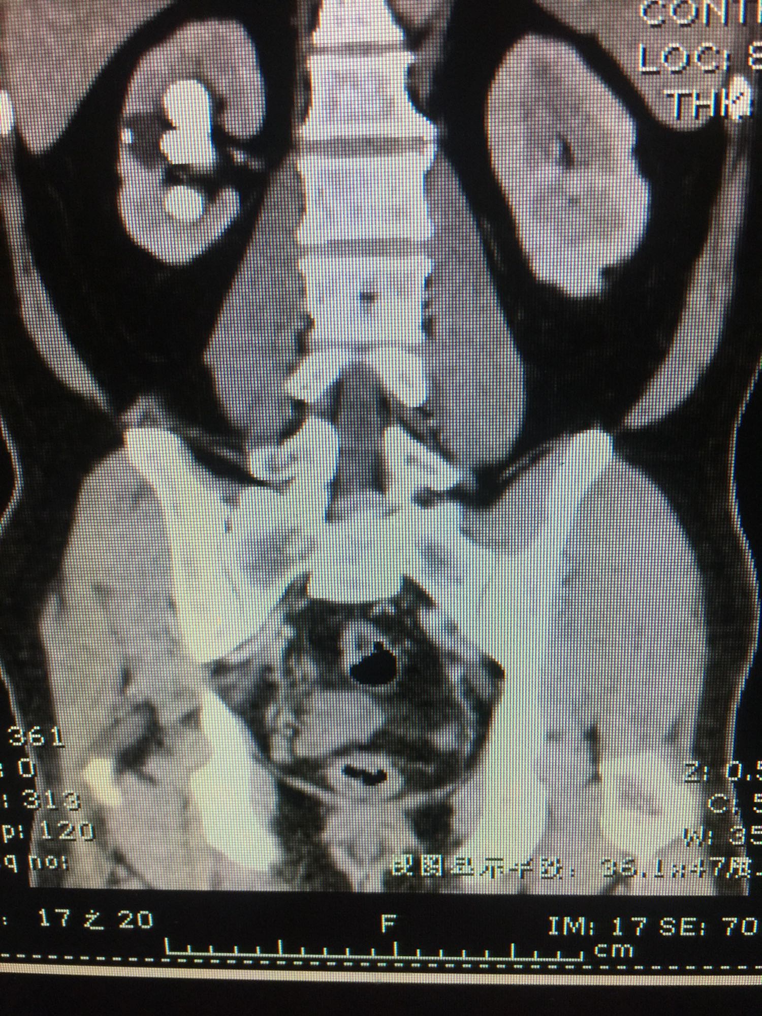 查体:双肾区无叩压痛,膀胱区无叩压痛,无叩浊,前列腺二度,质地中等,无压痛,无结节。CTU提示右肾铸型结石。ECTL 40,R14.5