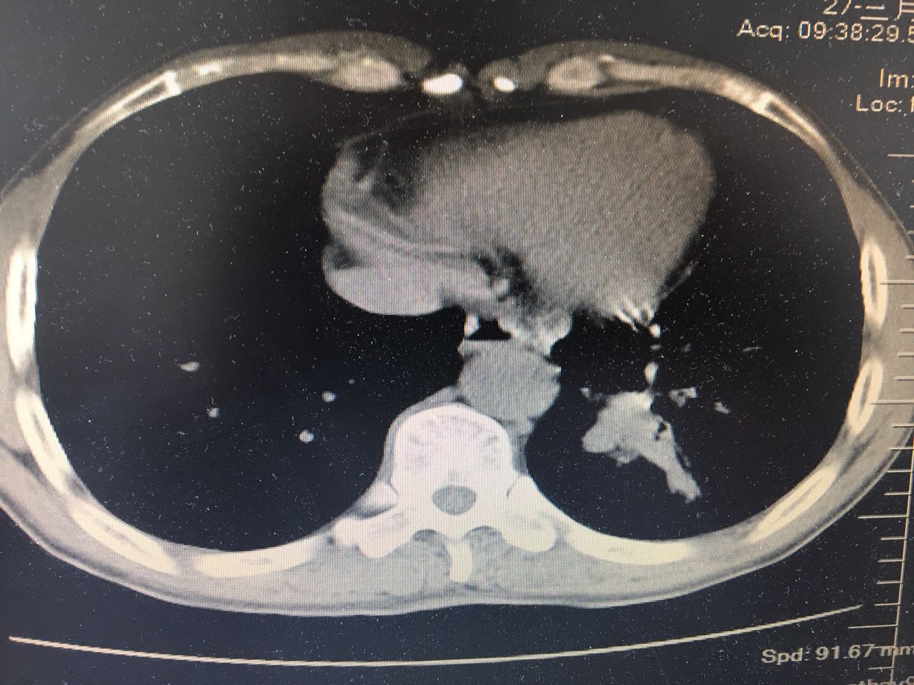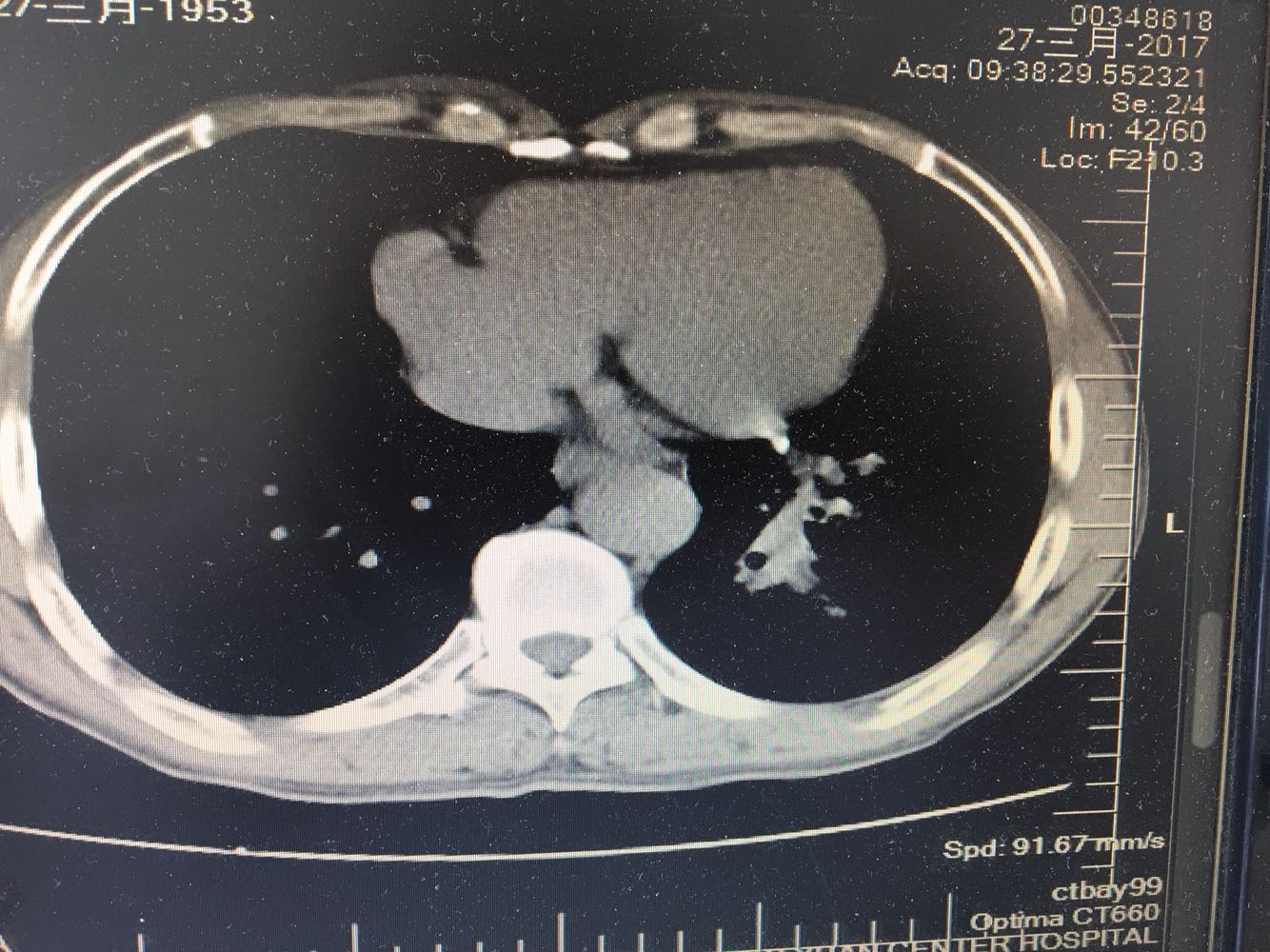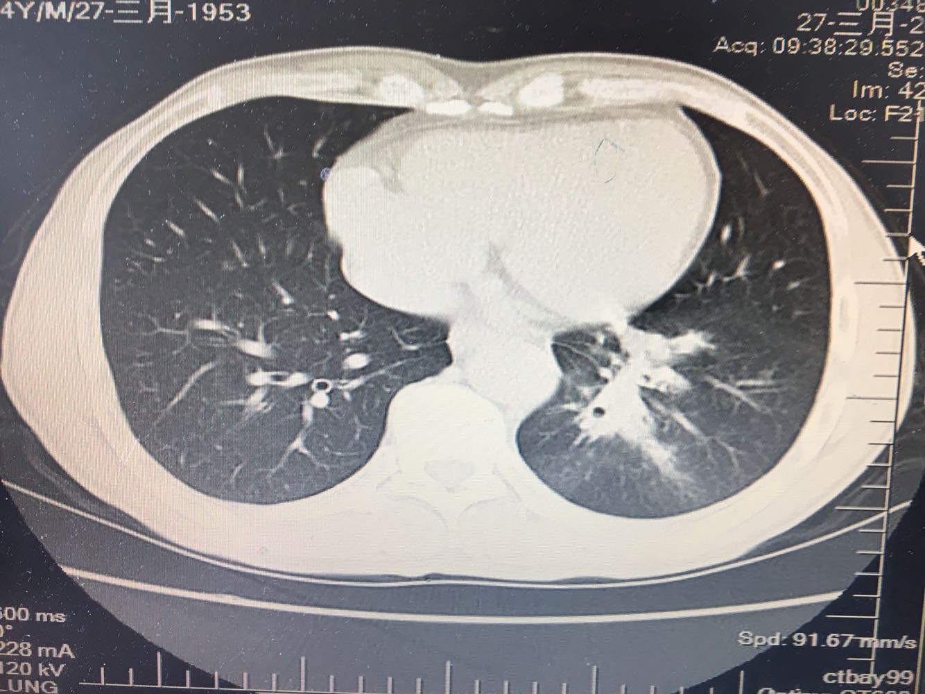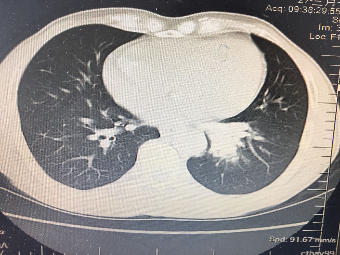 男,63岁,咳嗽1个月入院,患者自述1个月前无诱因咳嗽,阵发性干咳,无痰,时有血丝,无发热,左胸痛,活动后气短,静滴头孢13天无好转,门诊查肺CT后以 肺占位收入我科,病来饮食睡眠可,体重明显下降。既往疝气术后1年,吸烟史30年,每日1包。