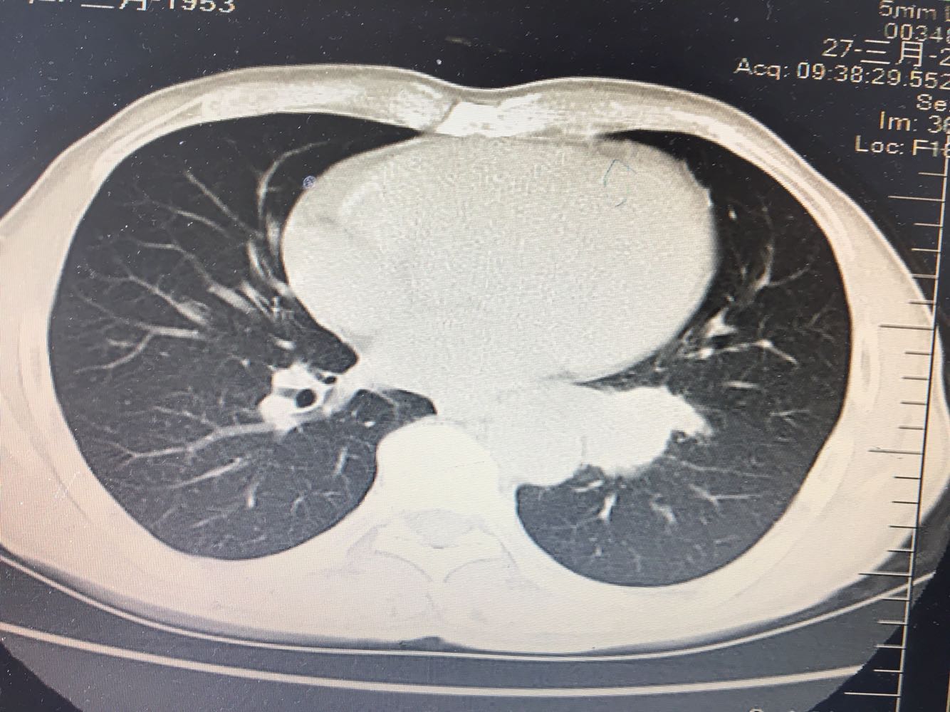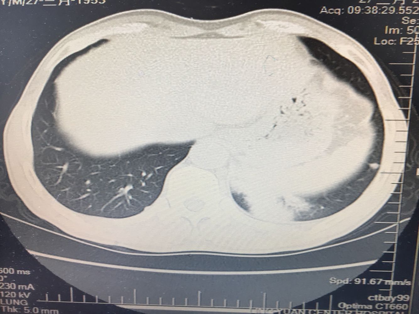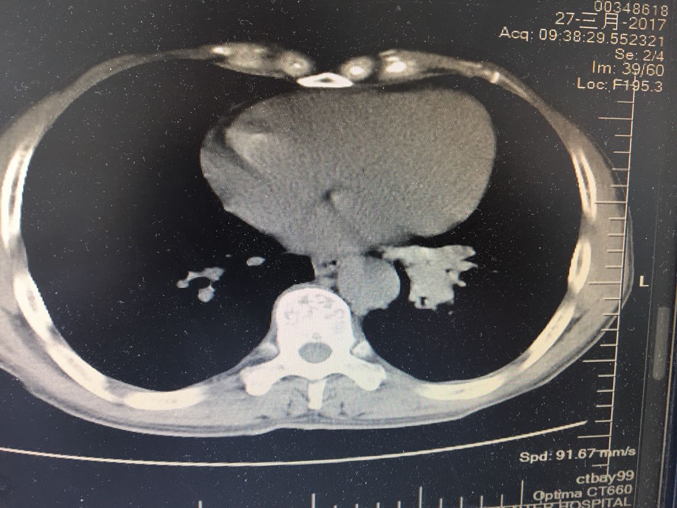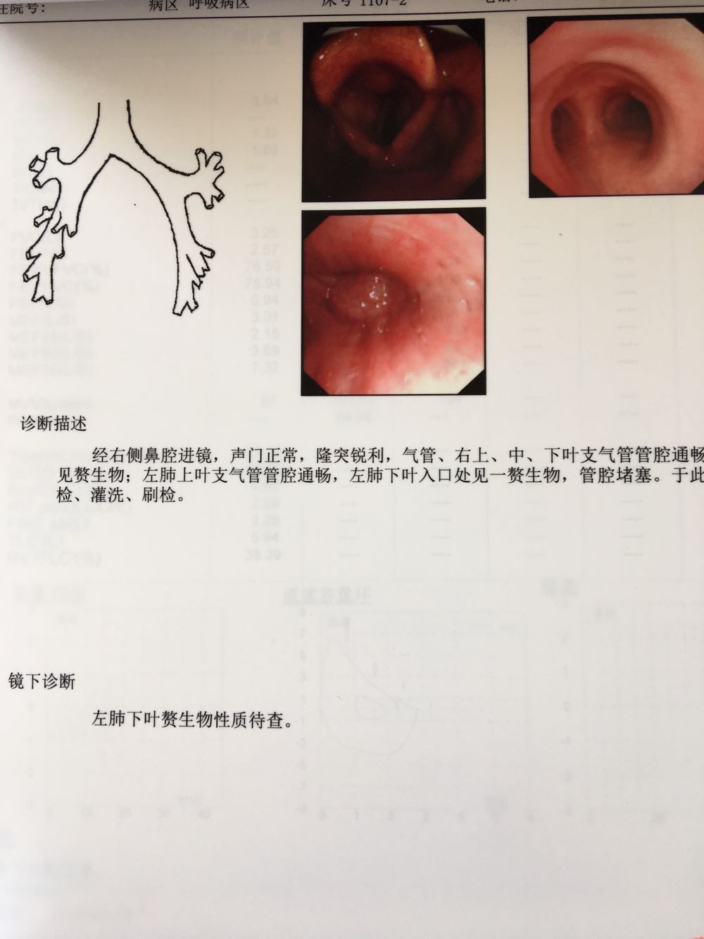 男,63岁,咳嗽1个月入院,患者自述1个月前无诱因咳嗽,阵发性干咳,无痰,时有血丝,无发热,左胸痛,活动后气短,静滴头孢13天无好转,门诊查肺CT后以 肺占位收入我科,病来饮食睡眠可,体重明显下降。既往疝气术后1年,吸烟史30年,每日1包。