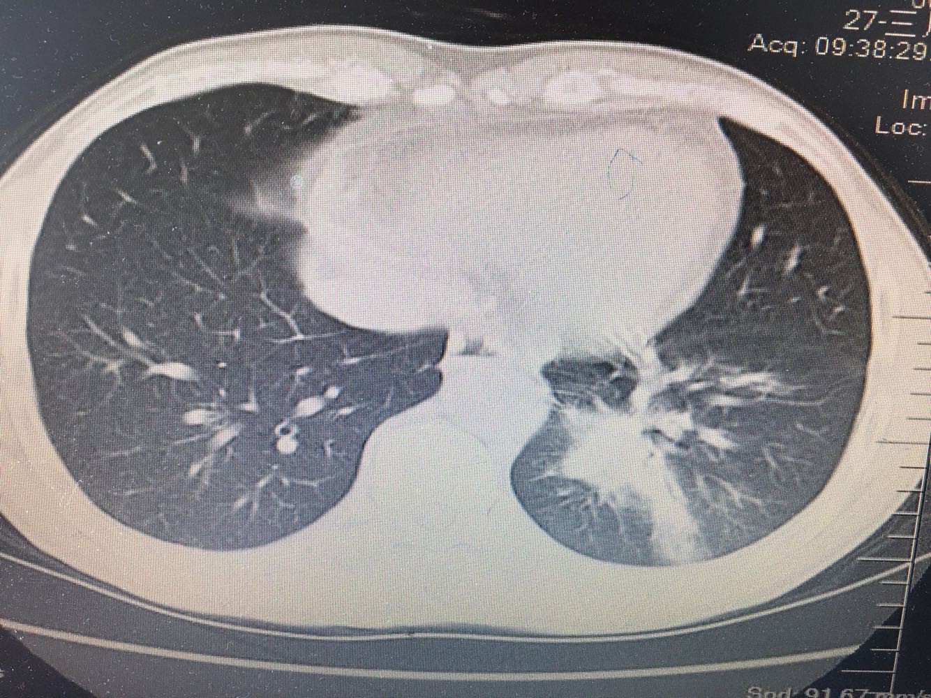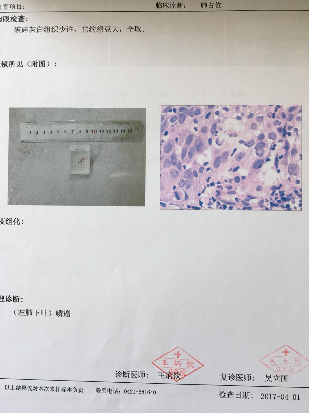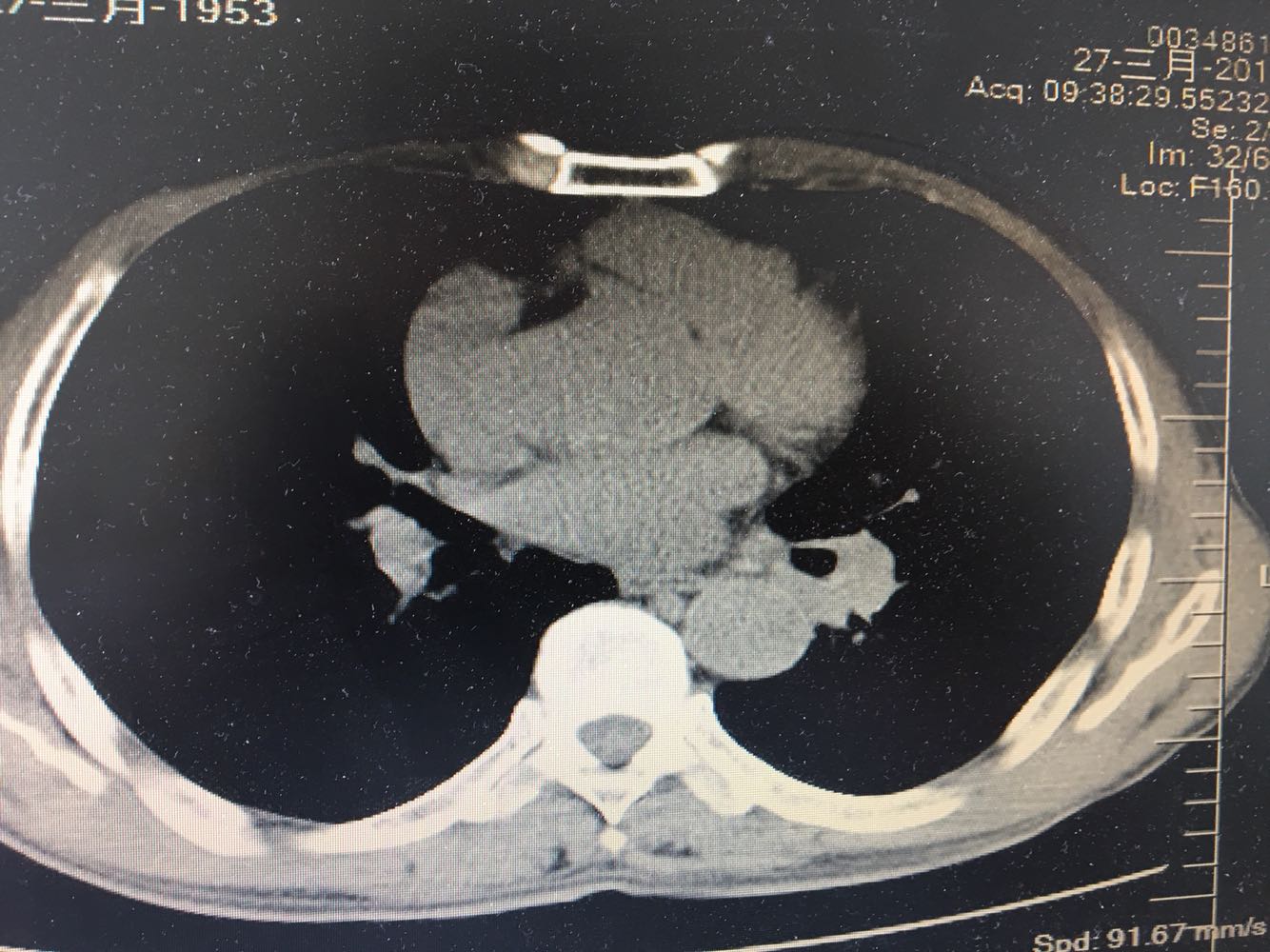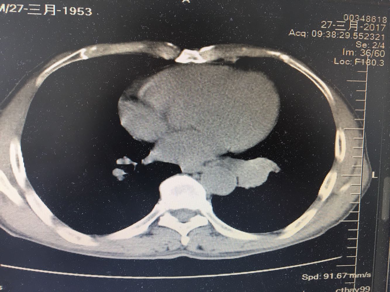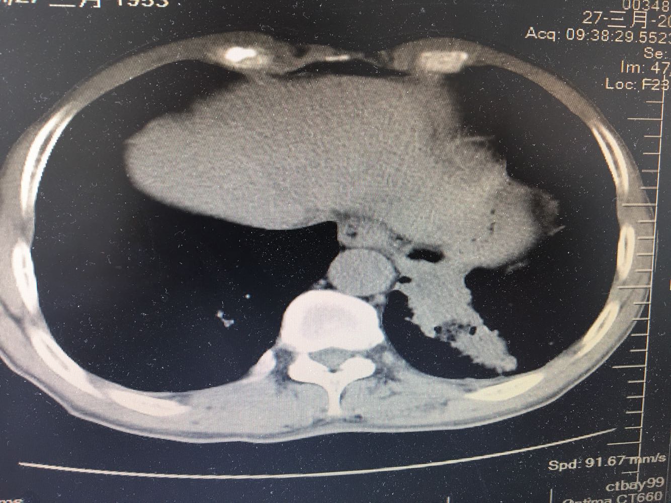 男,63岁,咳嗽1个月入院,患者自述1个月前无诱因咳嗽,阵发性干咳,无痰,时有血丝,无发热,左胸痛,活动后气短,静滴头孢13天无好转,门诊查肺CT后以 肺占位收入我科,病来饮食睡眠可,体重明显下降。既往疝气术后1年,吸烟史30年,每日1包。