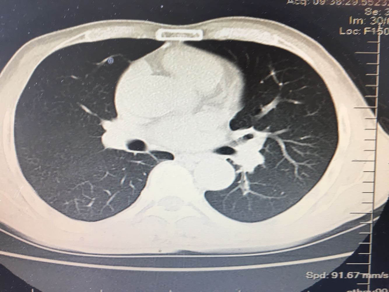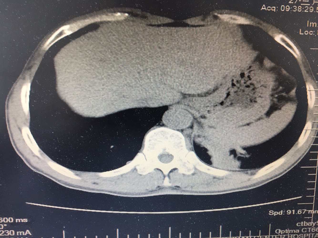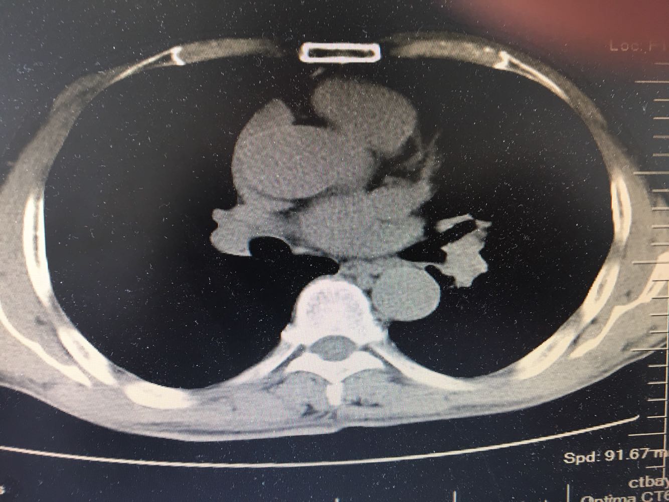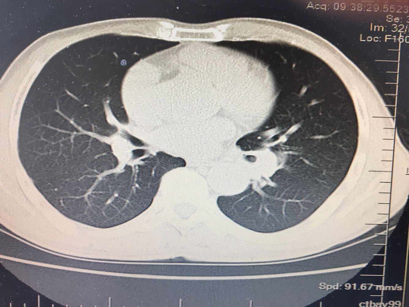 男,63岁,咳嗽1个月入院,患者自述1个月前无诱因咳嗽,阵发性干咳,无痰,时有血丝,无发热,左胸痛,活动后气短,静滴头孢13天无好转,门诊查肺CT后以 肺占位收入我科,病来饮食睡眠可,体重明显下降。既往疝气术后1年,吸烟史30年,每日1包。