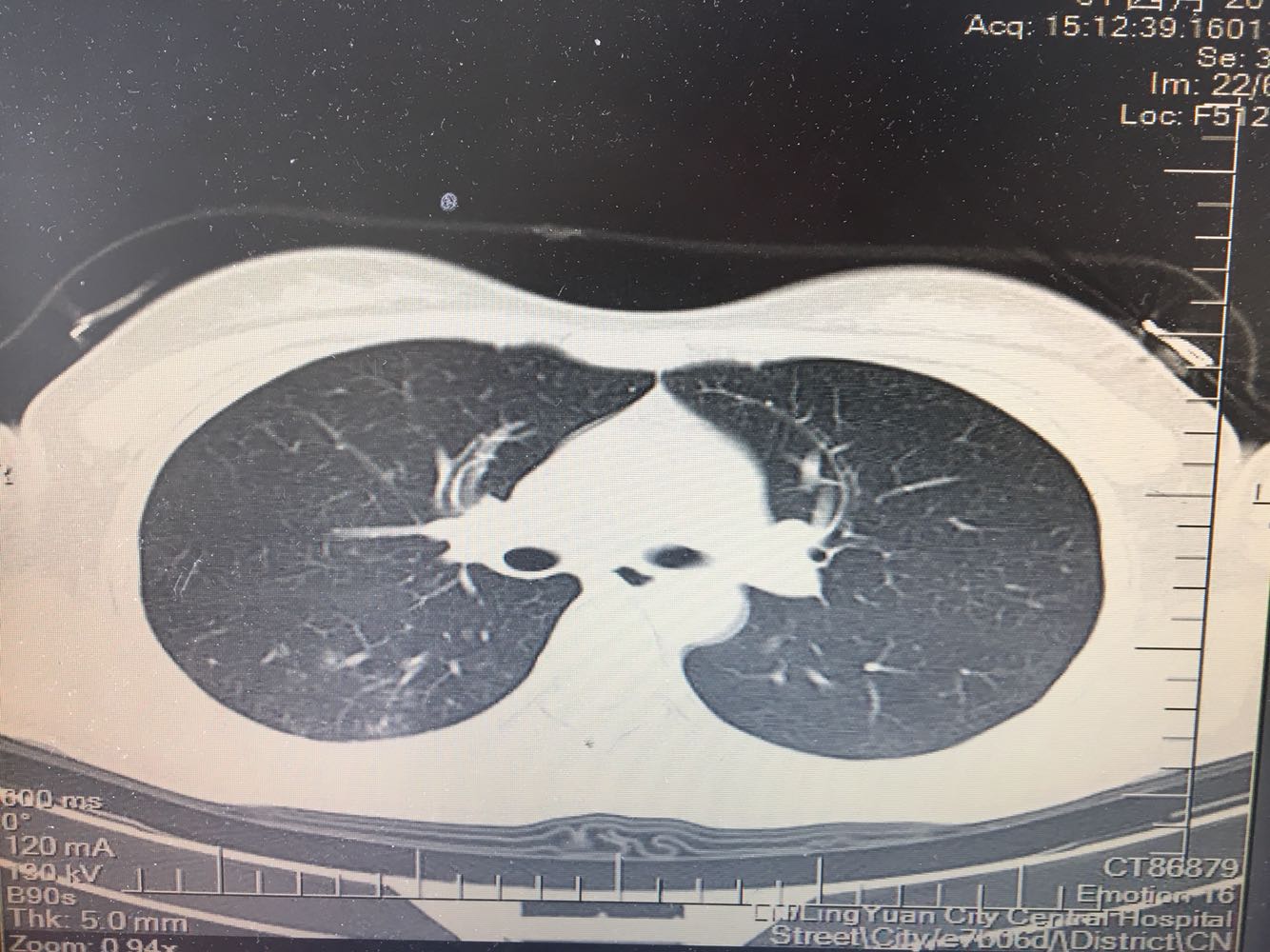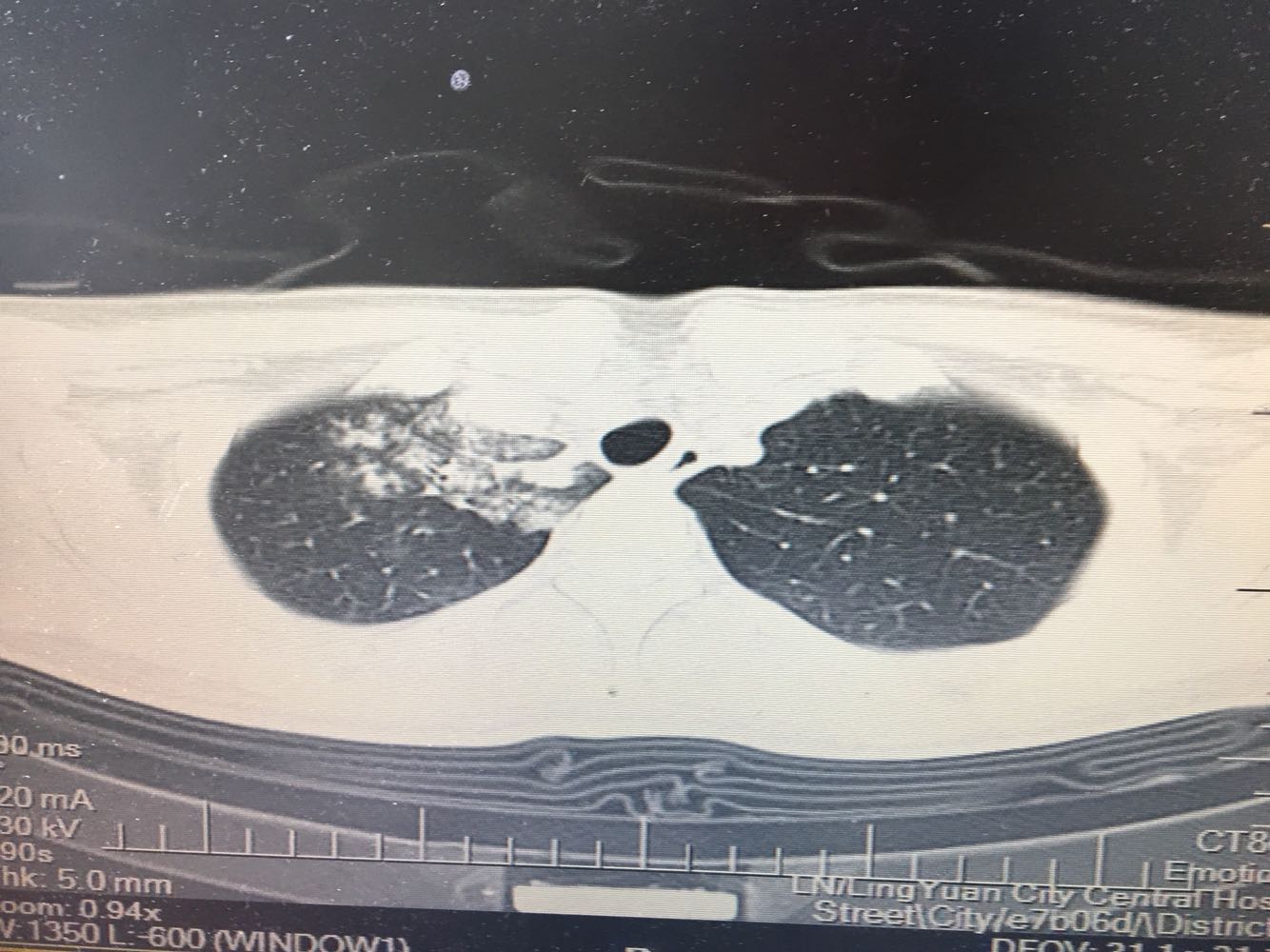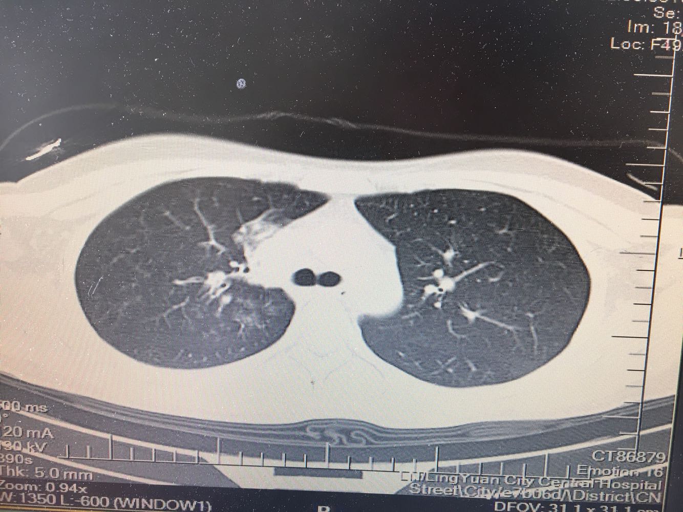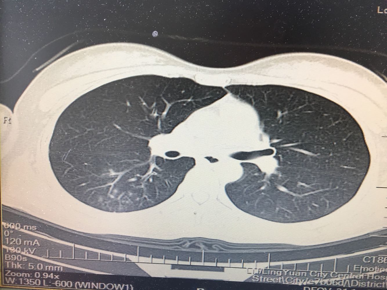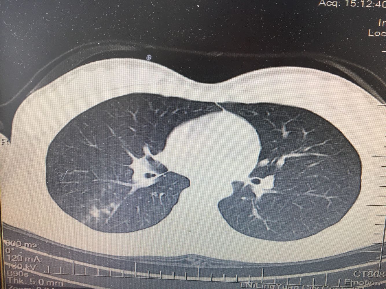 女,26岁,咳嗽1周,咳痰不畅,咽喉痒,口服阿莫西林无好转,昨日发热,体温38.5摄氏度,于门诊查肺CT后以肺炎收入院,病来无盗汗,无咳血,无消瘦及乏力,无头痛,无肢体酸痛,饮食睡眠可,二便正常