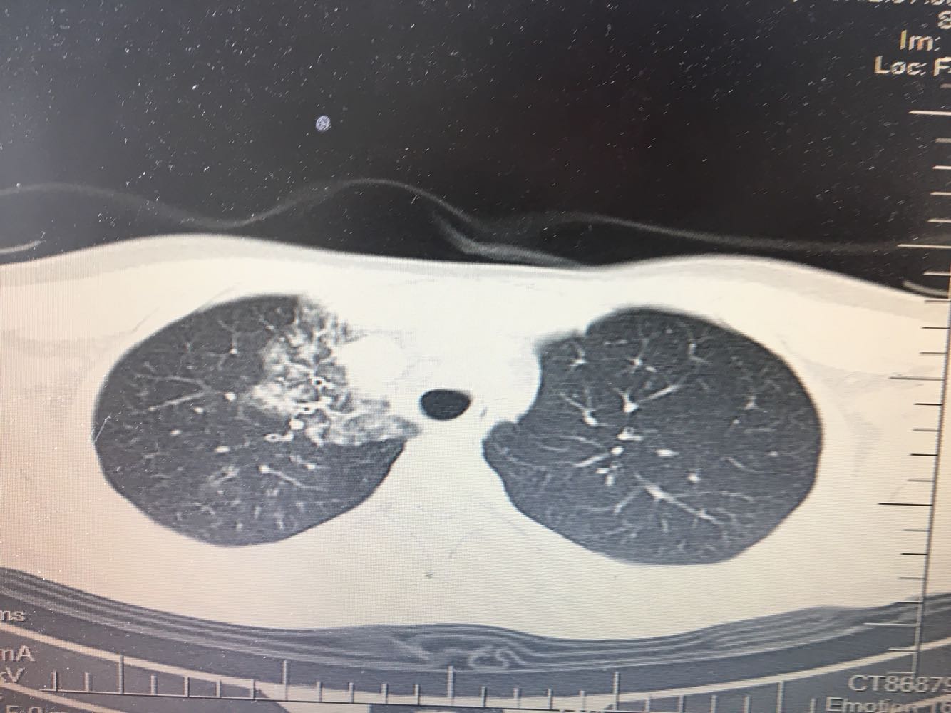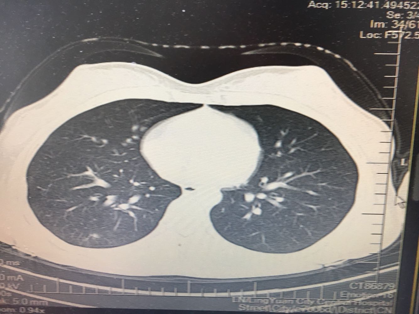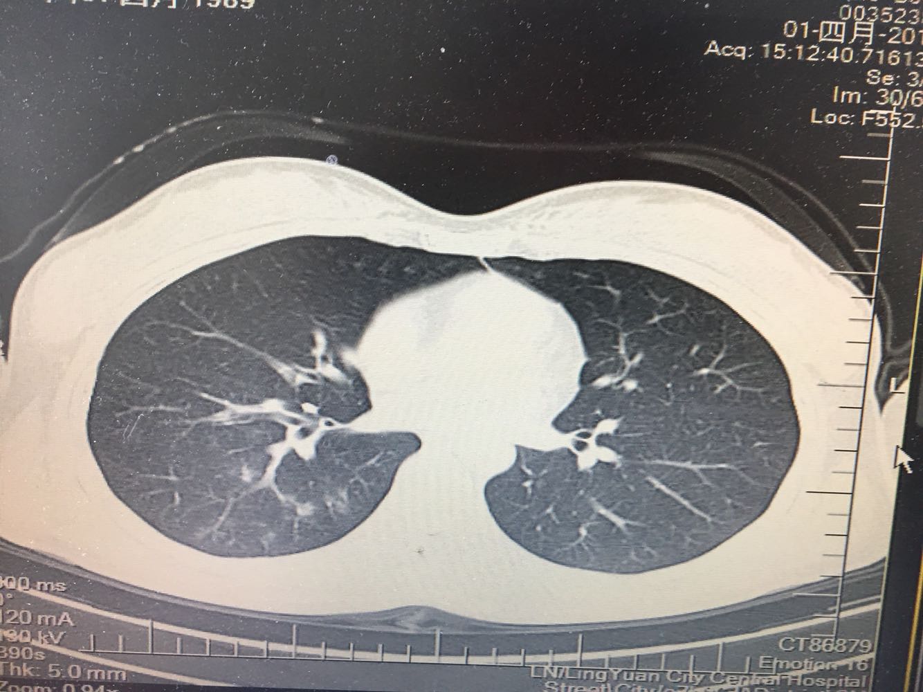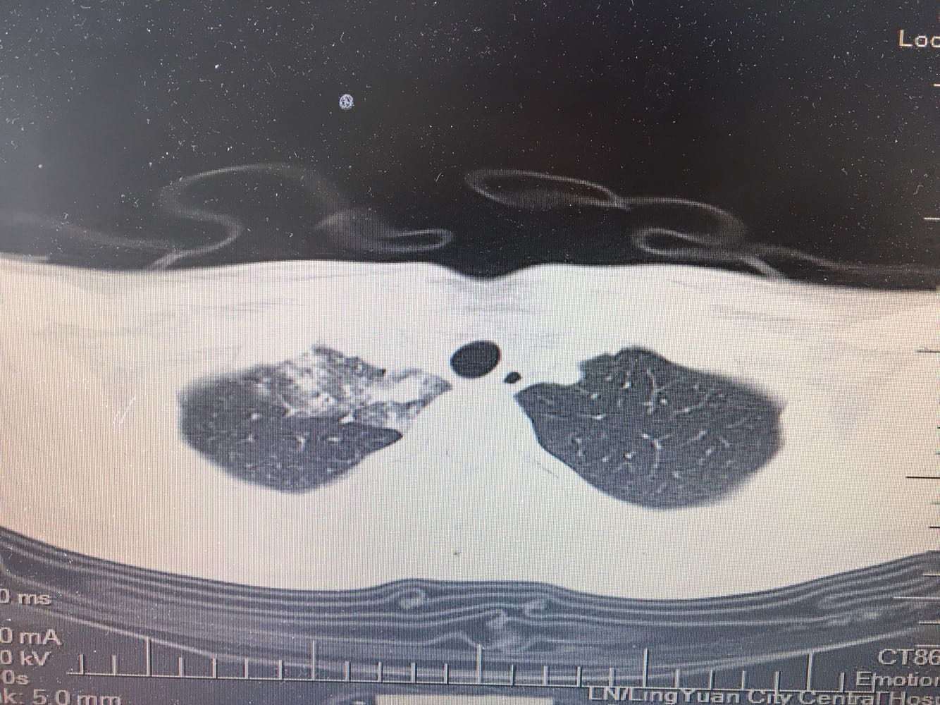 女,26岁,咳嗽1周,咳痰不畅,咽喉痒,口服阿莫西林无好转,昨日发热,体温38.5摄氏度,于门诊查肺CT后以肺炎收入院,病来无盗汗,无咳血,无消瘦及乏力,无头痛,无肢体酸痛,饮食睡眠可,二便正常