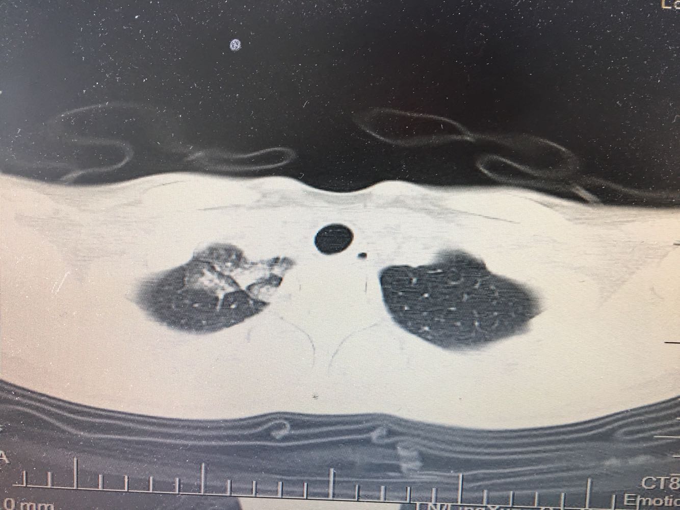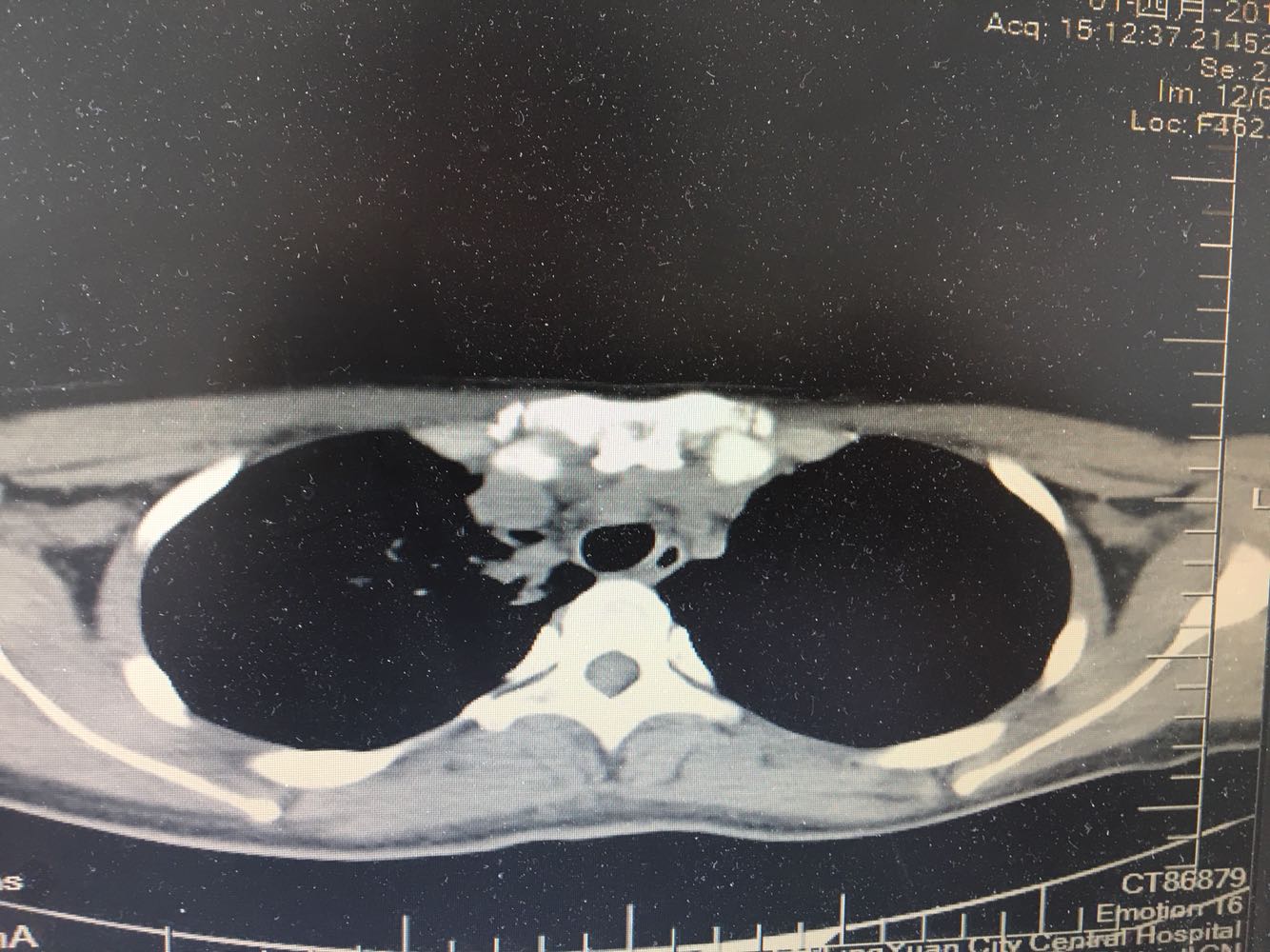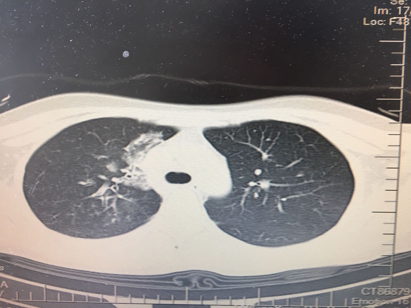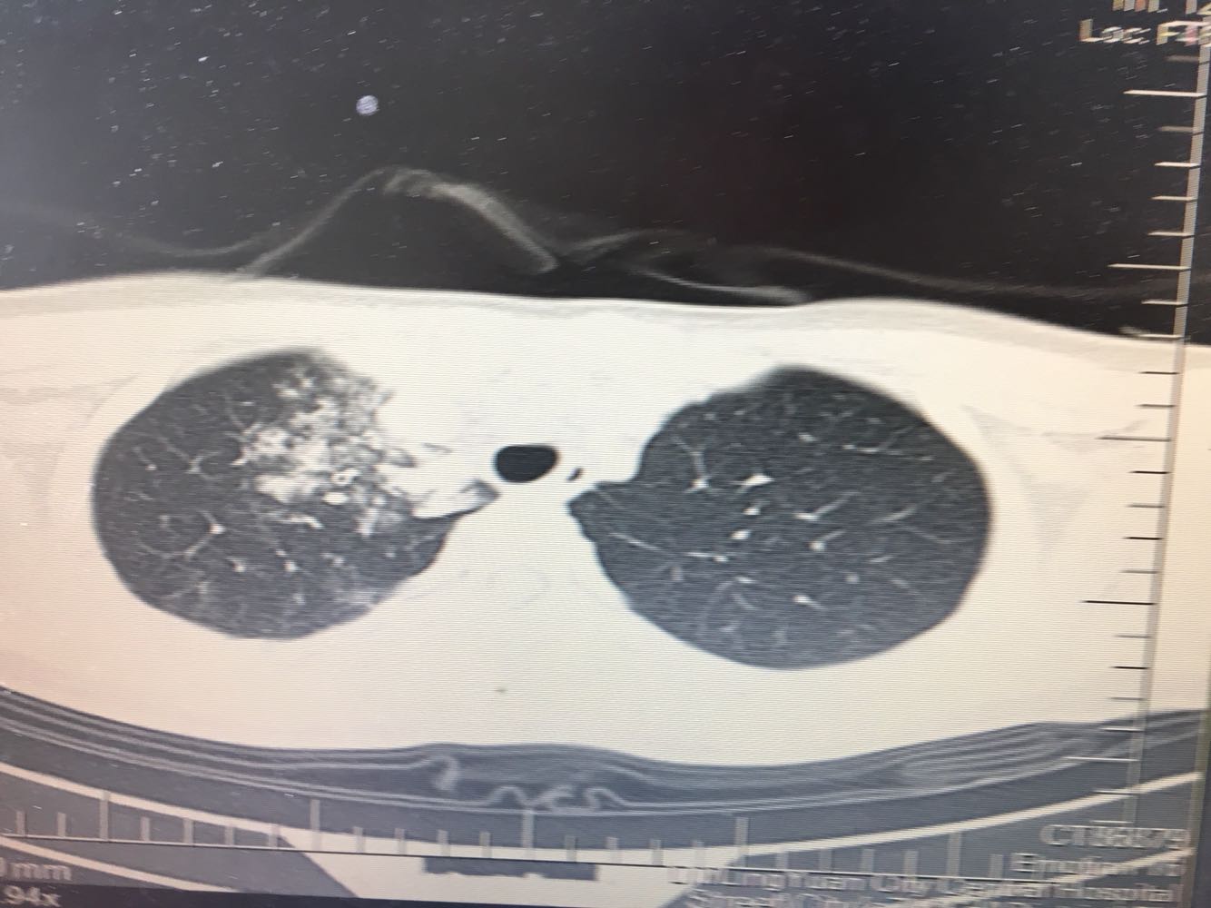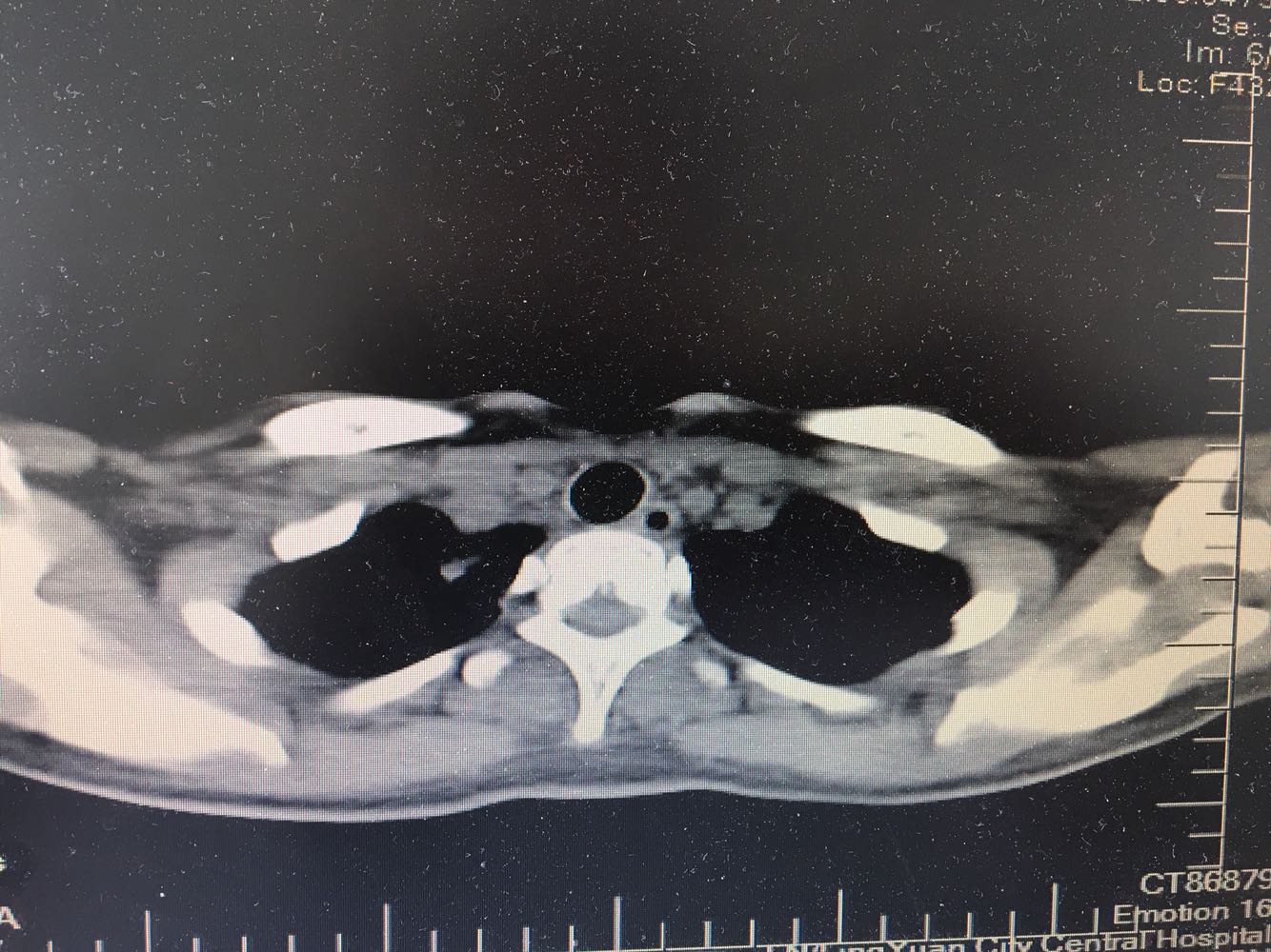 女,26岁,咳嗽1周,咳痰不畅,咽喉痒,口服阿莫西林无好转,昨日发热,体温38.5摄氏度,于门诊查肺CT后以肺炎收入院,病来无盗汗,无咳血,无消瘦及乏力,无头痛,无肢体酸痛,饮食睡眠可,二便正常