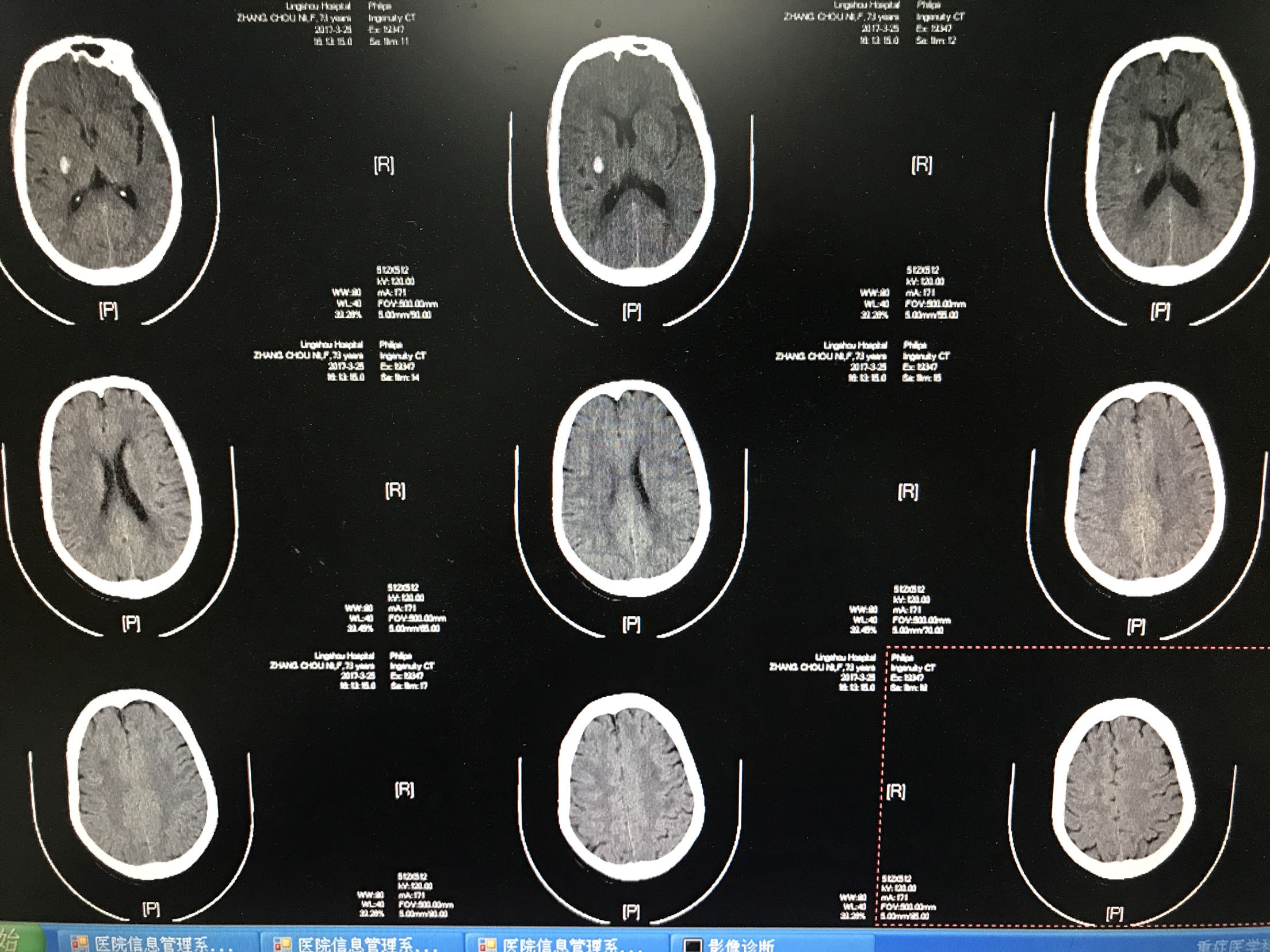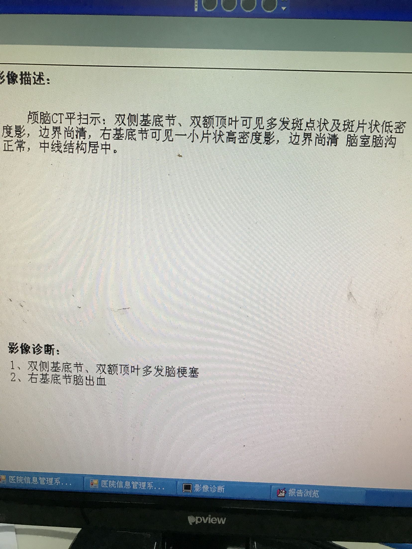 左侧肢体麻木无力1天入院,患者老年女性73岁,既往高血压病史8年,自服"得高宁",诉平时血压时高时低,"糖尿病"病史5年,平素口服"格华止和美吡达",自诉血糖控制可,否认其他病史!患者缘于1前天在家中做饭时出现左侧肢体麻木无力,左上肢尚可抬举,左下肢尚可负重,尚能独立行走,无头晕恶心呕吐,无复视及饮水呛咳,无明显言语功能障碍,无抽搐,当地卫生院考虑"脑梗死",给于"阿司匹林口服""丹红活血化瘀",及"低分子肝素钙抗凝",因病情无减轻,为进一步治疗来我院,查头Ct:1.右侧基底节脑出血2.双侧基底节,双额顶叶多发脑梗塞,为进一步治疗收住院