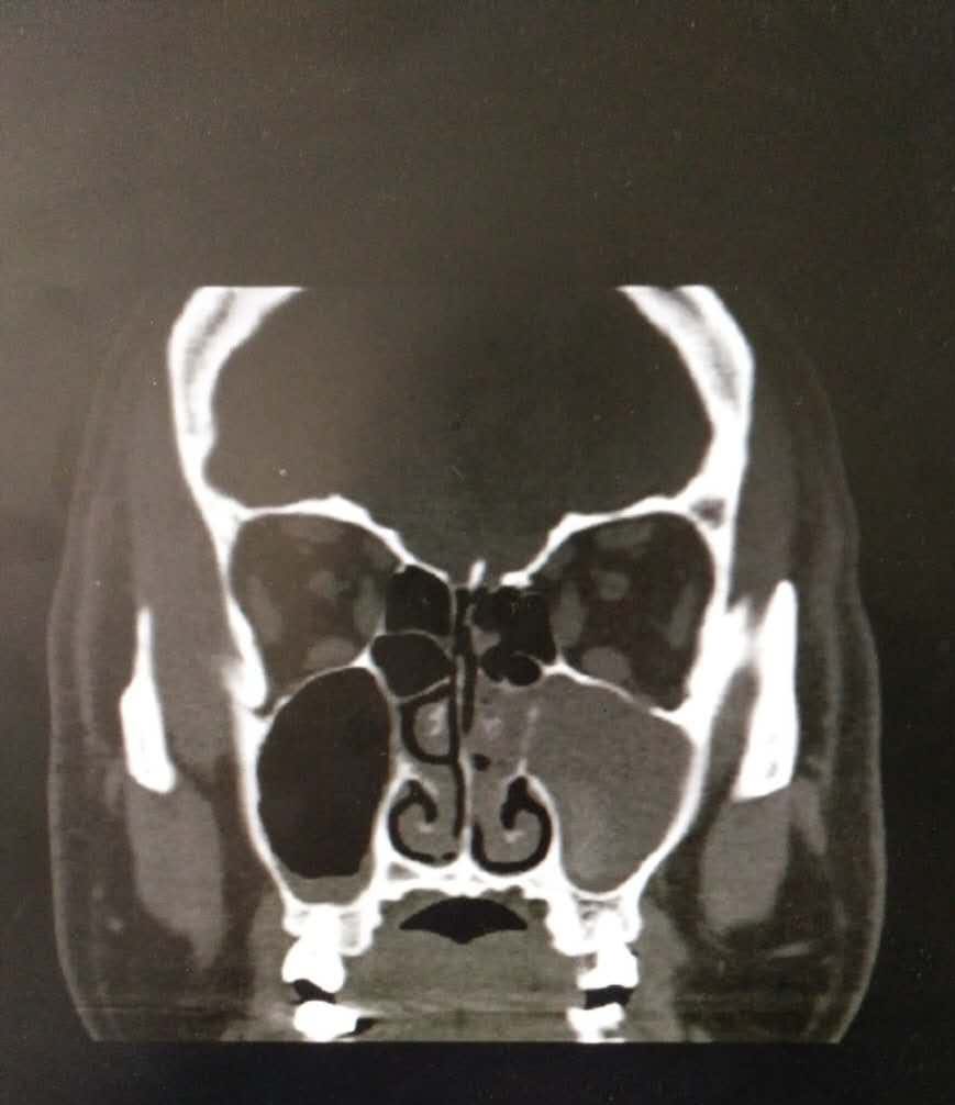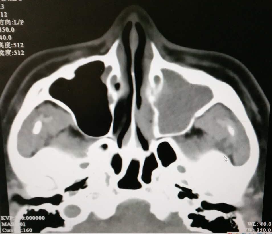 查体:鼻腔黏膜慢性充血,鼻腔内可见脓性分泌物,鼻中隔向左偏曲,双侧下鼻甲肥大。鼻内镜:双侧鼻腔可见脓性分泌物,鼻中隔左偏,进镜困难,似有中鼻道息肉,鼻咽部黏膜光滑,无新生物。鼻窦CT:双侧上颌窦、筛窦及鼻腔内炎症改变。
