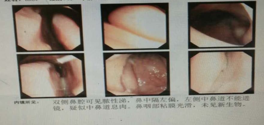 主诉:鼻塞、流涕3年,加重4个月。现病史:3年前患者“感冒”后出现间断性鼻塞伴流脓涕,无鼻出血,无明显嗅觉减退,无打喷嚏,无发热,无呼吸、吞咽困难。自服头孢类药物(具体不详)及比复健喷鼻治疗,症状减轻。后症状反复发作,4个月前“感冒”后再次鼻塞、流脓涕,为进一步诊疗今来我院就诊,门诊检查后以“鼻息肉、鼻中隔偏曲”收入院。