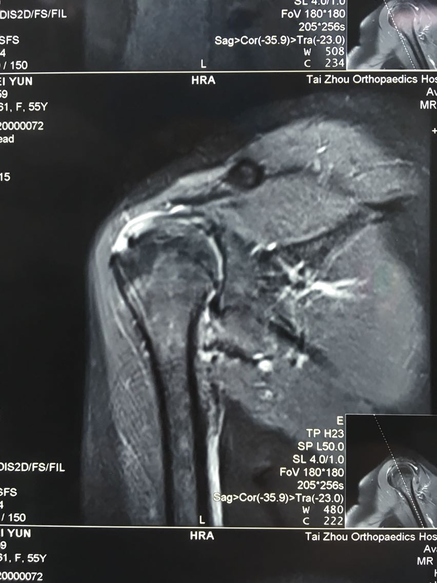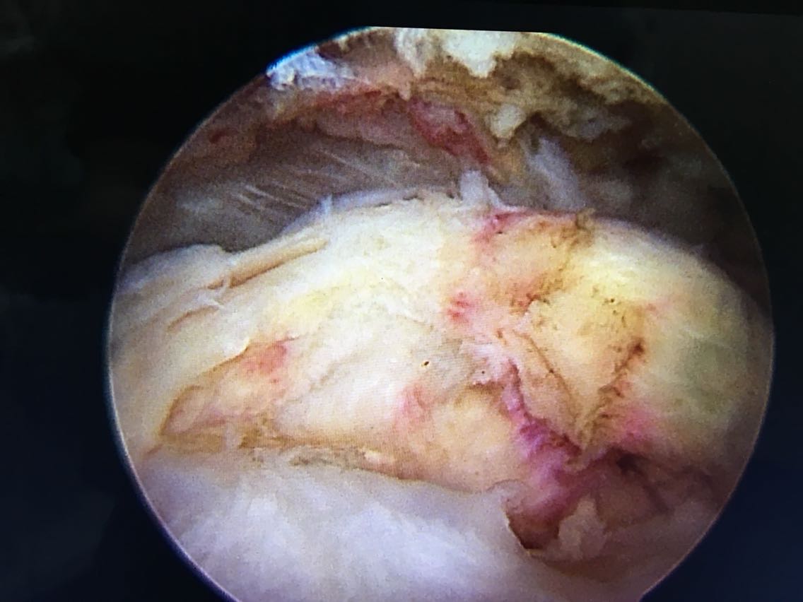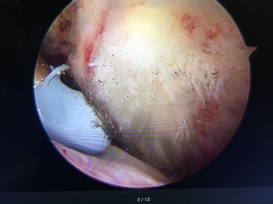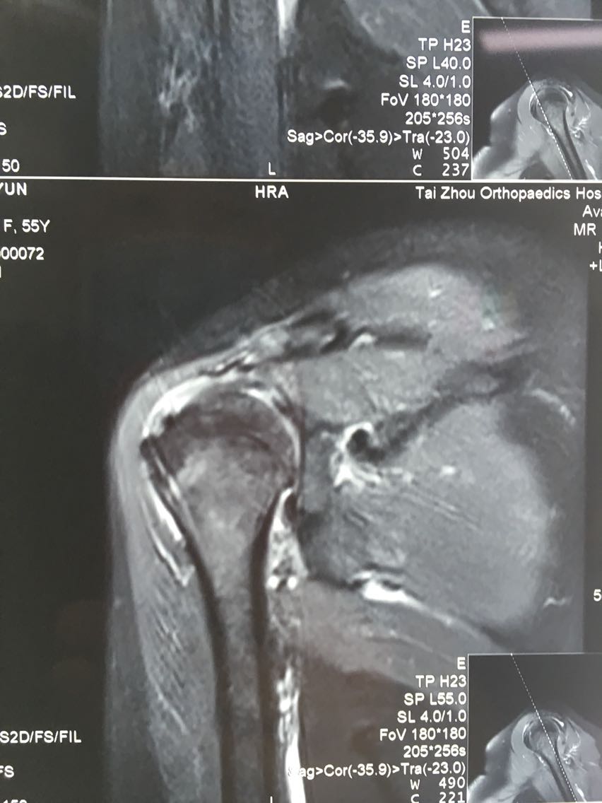 诊断:右肩袖撕裂 肩峰撞击症 冻结肩 治疗:关节镜下清理 肩峰撞击成形 肩袖撕裂修补手术。