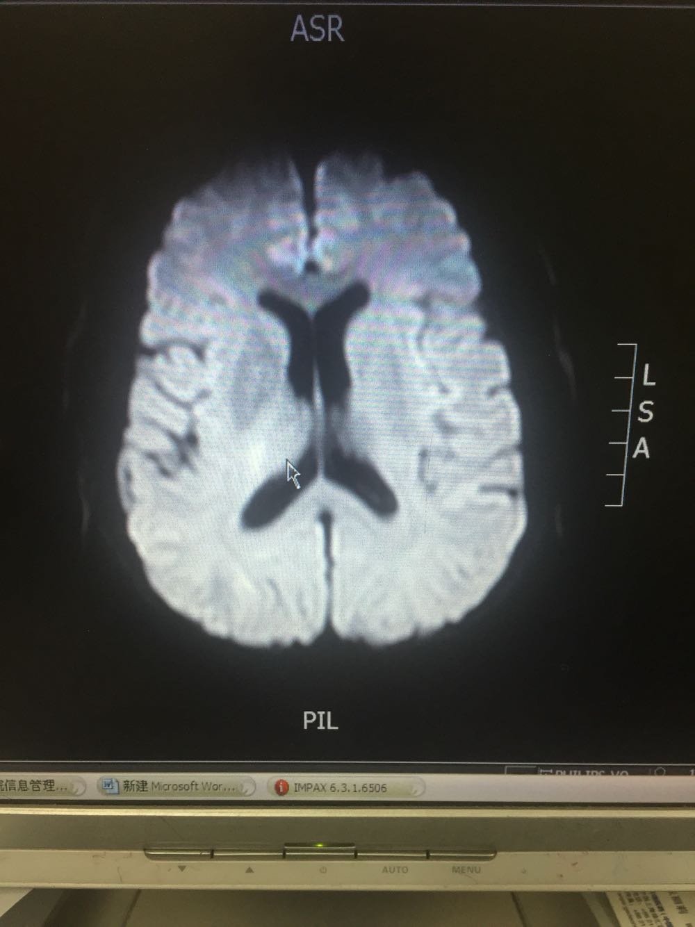 患者于入院后第二日晨起时突发左侧肢体无力伴抽搐发作,查体:神志模糊,言语含糊,双侧瞳孔等大同圆,对光发射存在,左侧肢体肌力3级,左下肢Babinski(+)Chaddock(+) 不伴有尿便失禁。给予安定肌肉注射,急检血凝及头CT。血凝、头CT回报未见明显异常。患者发病1.5小时与家属沟通建议溶栓治疗,家属同意。患者体重约75kg。给予6mg爱通立静脉推注,随后60分钟内爱通立54mg静脉滴注。患者恢复良好,肌力恢复正常。查头DWI示:右侧侧脑室后脚可疑新发梗死。