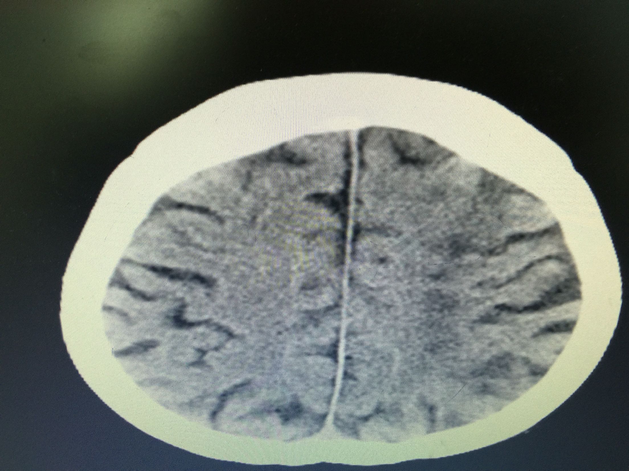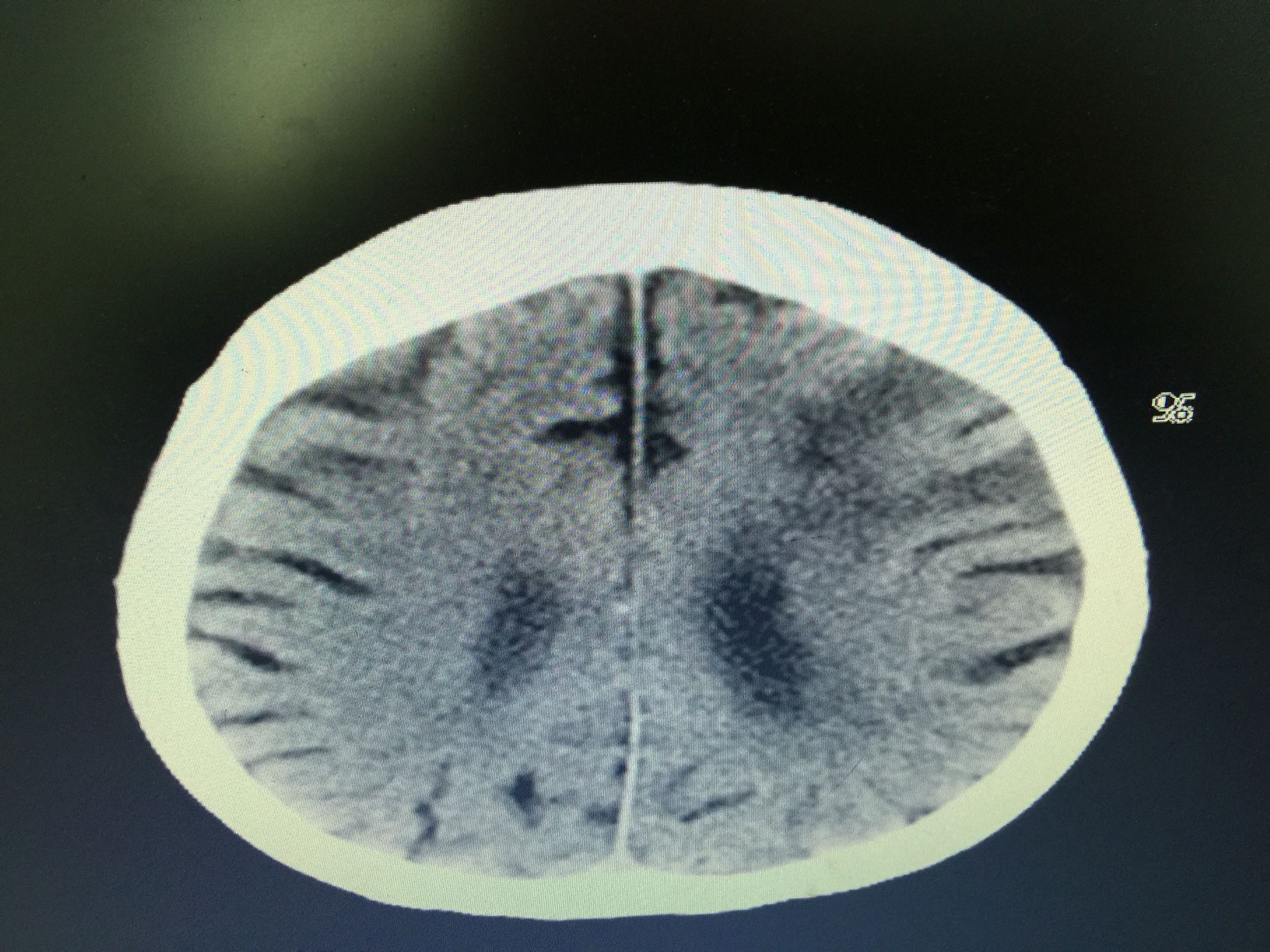 查体:血压:136/80mmHg,意识清,不全运动性失语,右侧中枢性面瘫,右侧肢肌力1级,Babinski征左-右+。