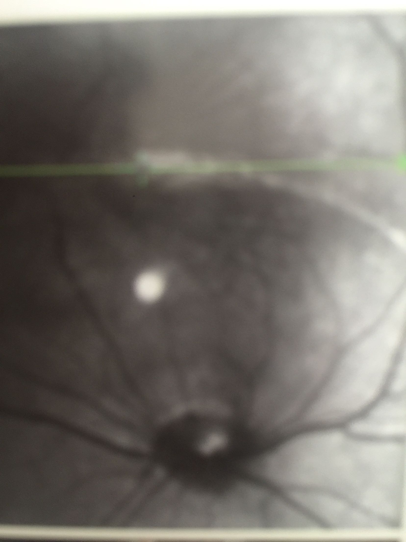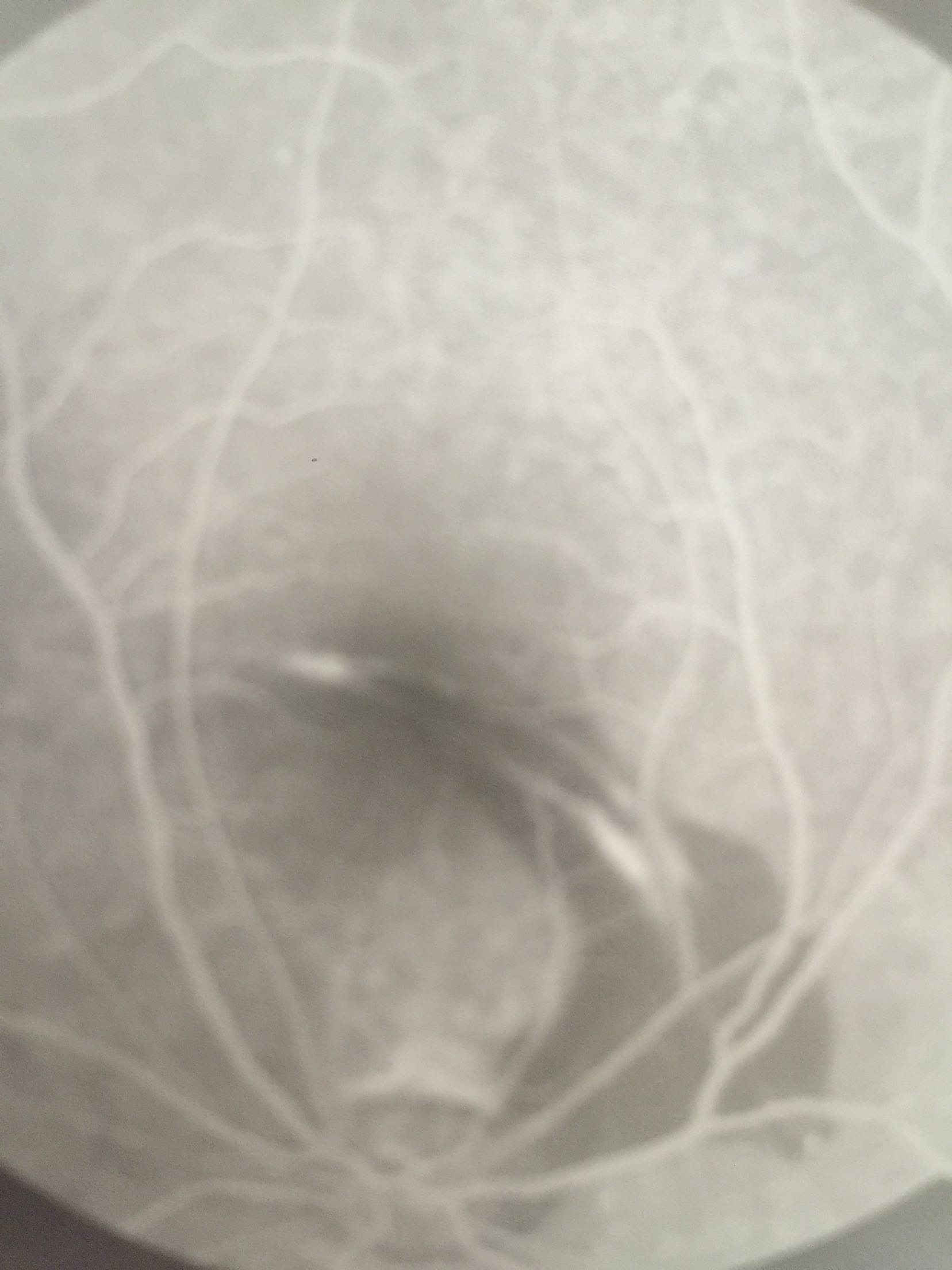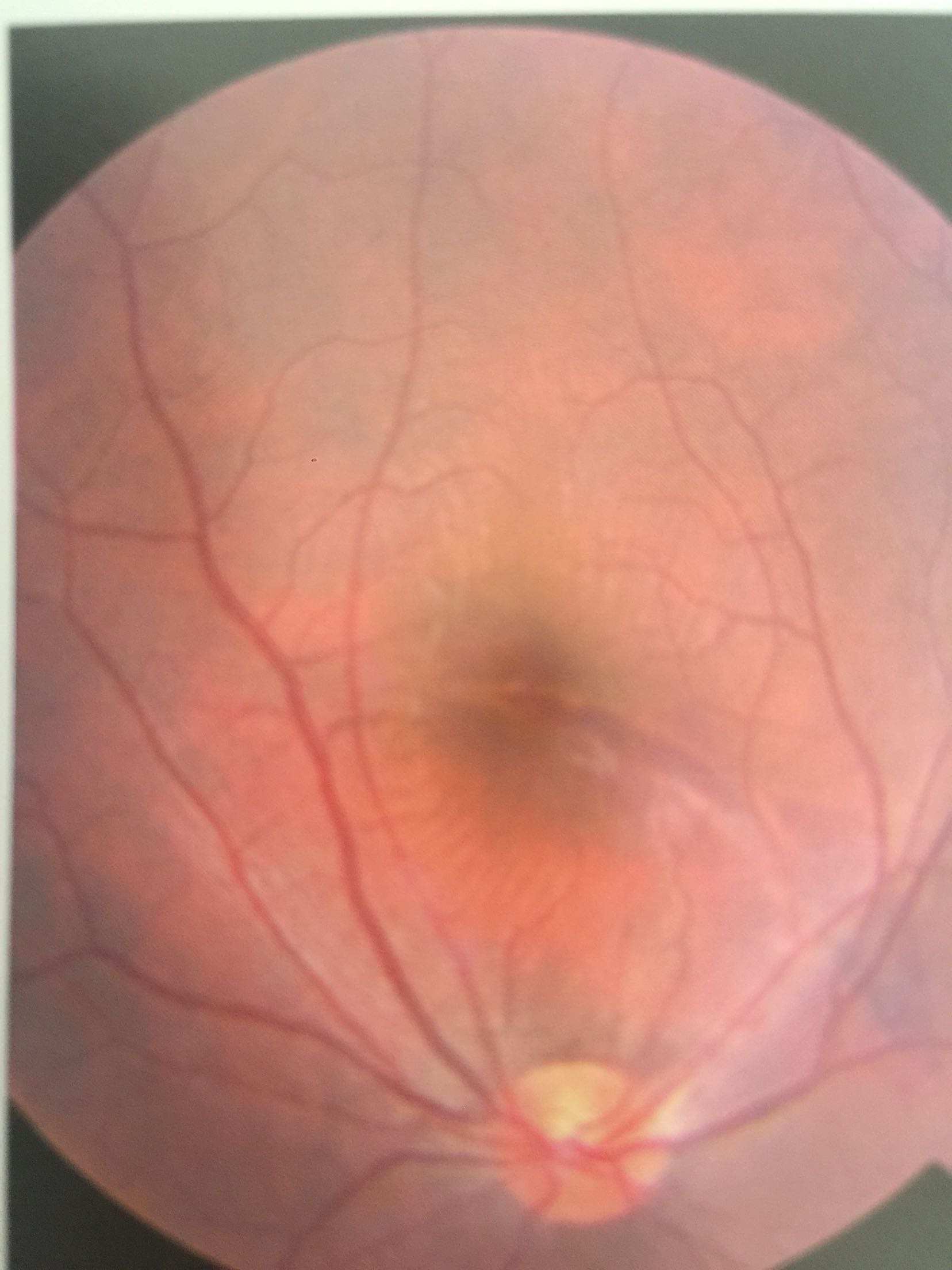 视力:右眼 0.2不能矫正 左眼1.0 眼压:16/19mmhg右眼结膜充血+角膜透明,前房3.0CT。晶体玻璃体透明。眼底视盘界清色可,颞上方血管弓与黄斑区之间可见一弧形脉络膜裂伤,裂伤处及其周围视网膜下可见浓厚出血。