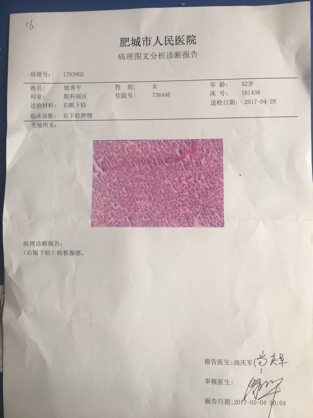 行右下睑肿物切除术 术后病理:右下睑睑板腺癌