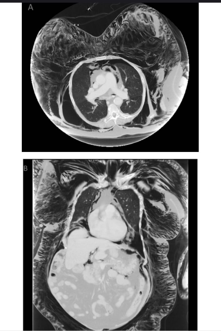 体格检查显示,患者意识不清,面部、颈部、躯干和肢体都有明显的肿胀和捻发音。胸腹及盆腔CT(图A和B)显示弥漫性皮下气肿,纵隔积气和左侧气胸。需行紧急气管切开术,确诊气管后壁裂并进行修补。2天后,尽管患者接受了机械通气,但皮下气肿自行消失。