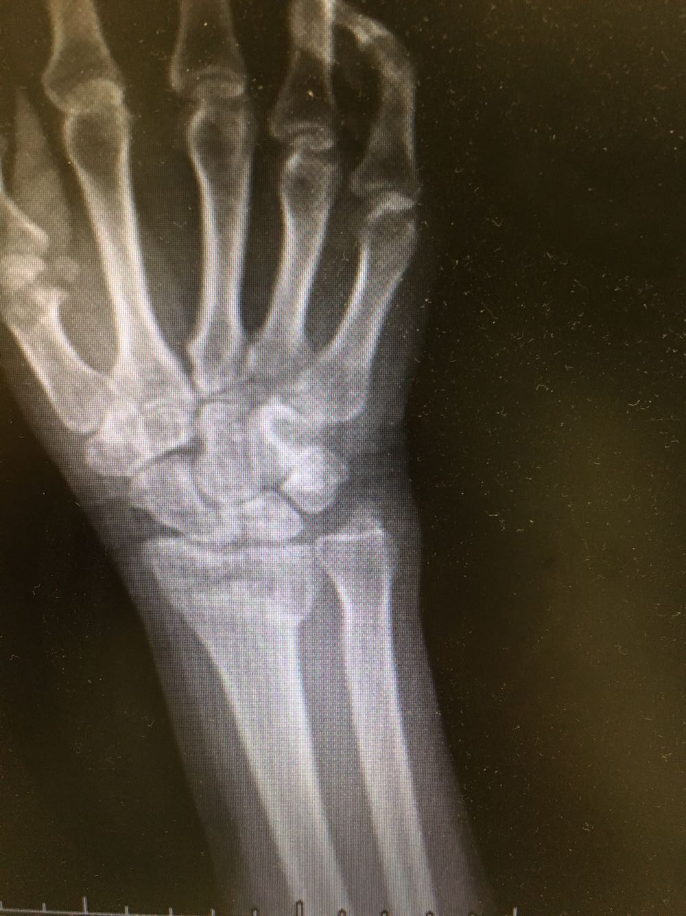 查体:右侧腕部肿胀,压痛阳性,伴活动受限,远端肢体感觉及运动正常。 辅检:见现病史
