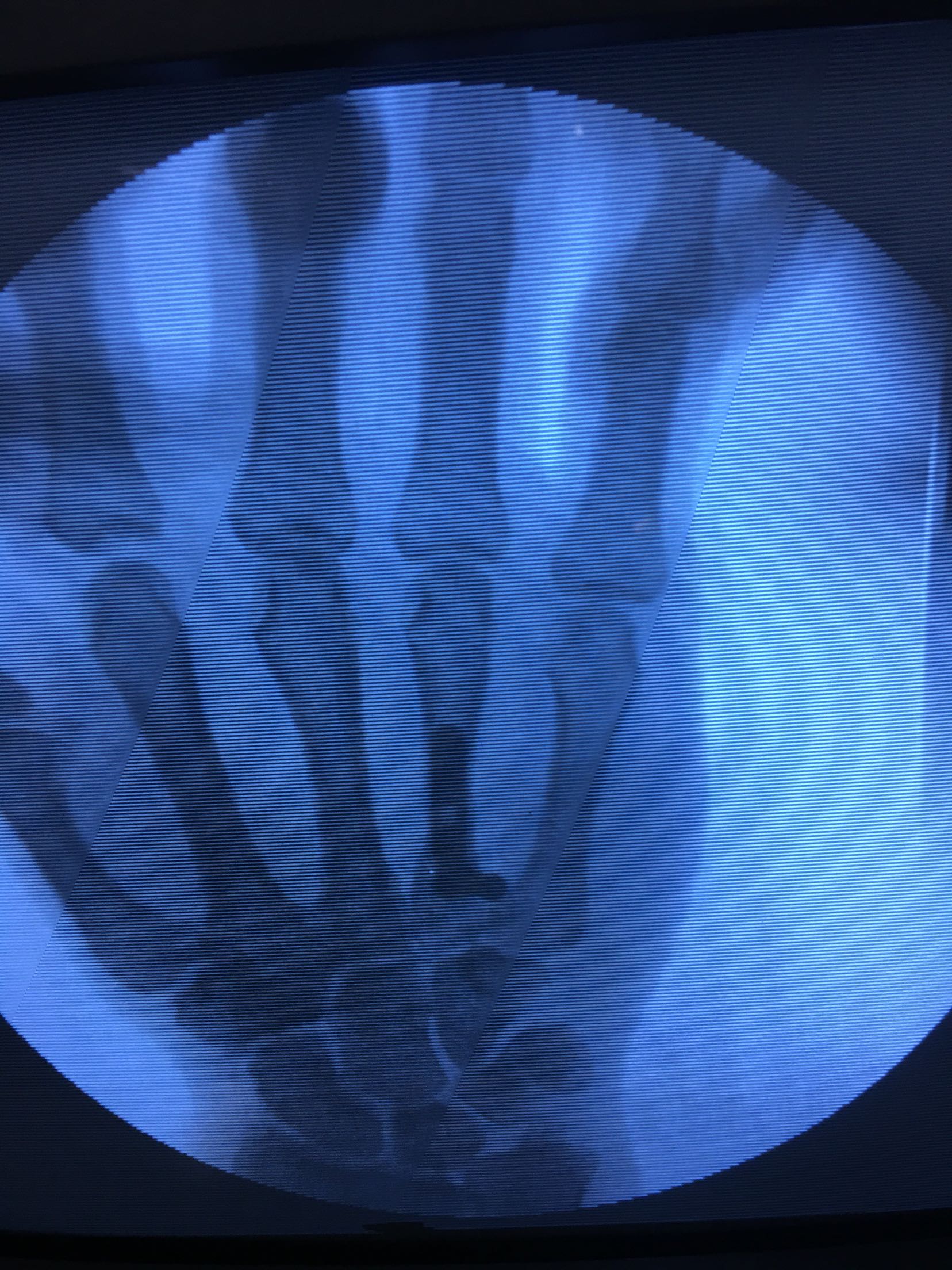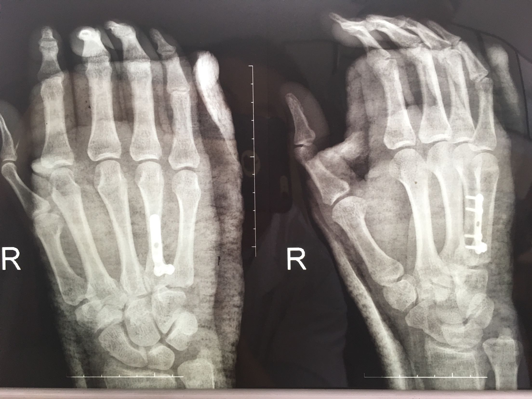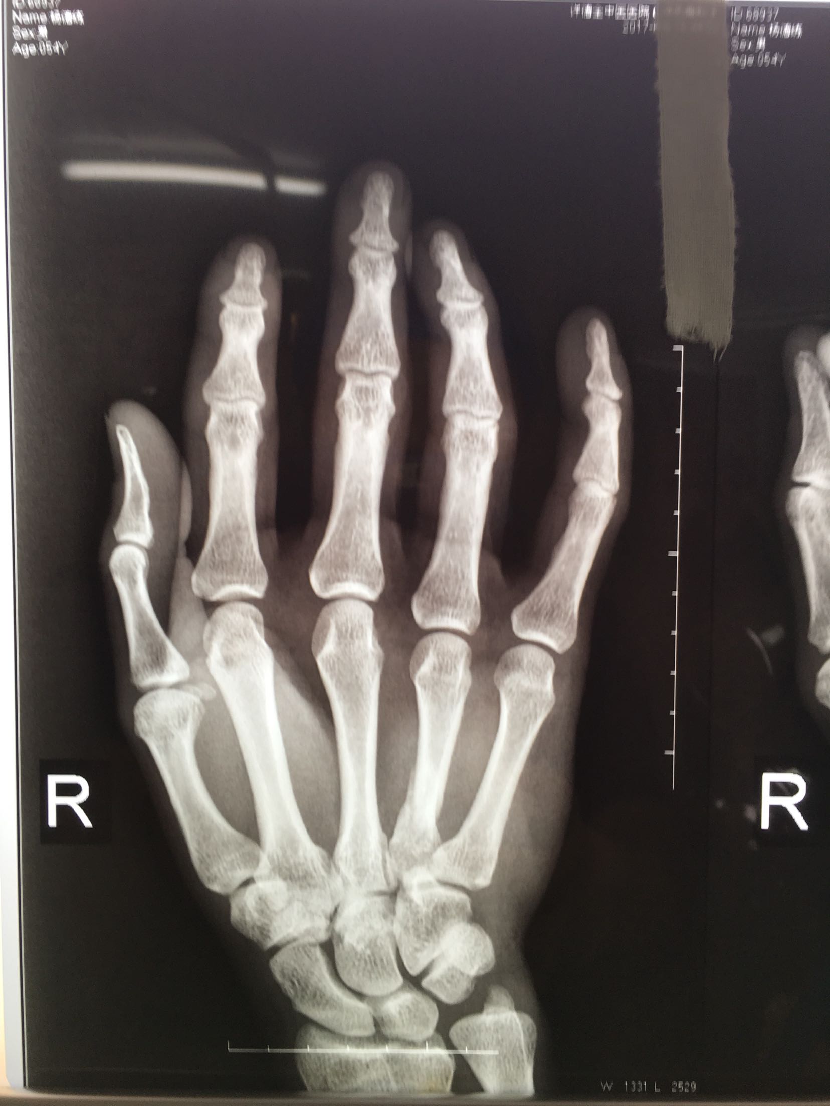右手掌肿胀明显,皮色皮温正常,局部压痛,纵叩痛阳性,可及骨擦感,第四掌指关节活动受限,末梢血运感觉正常。