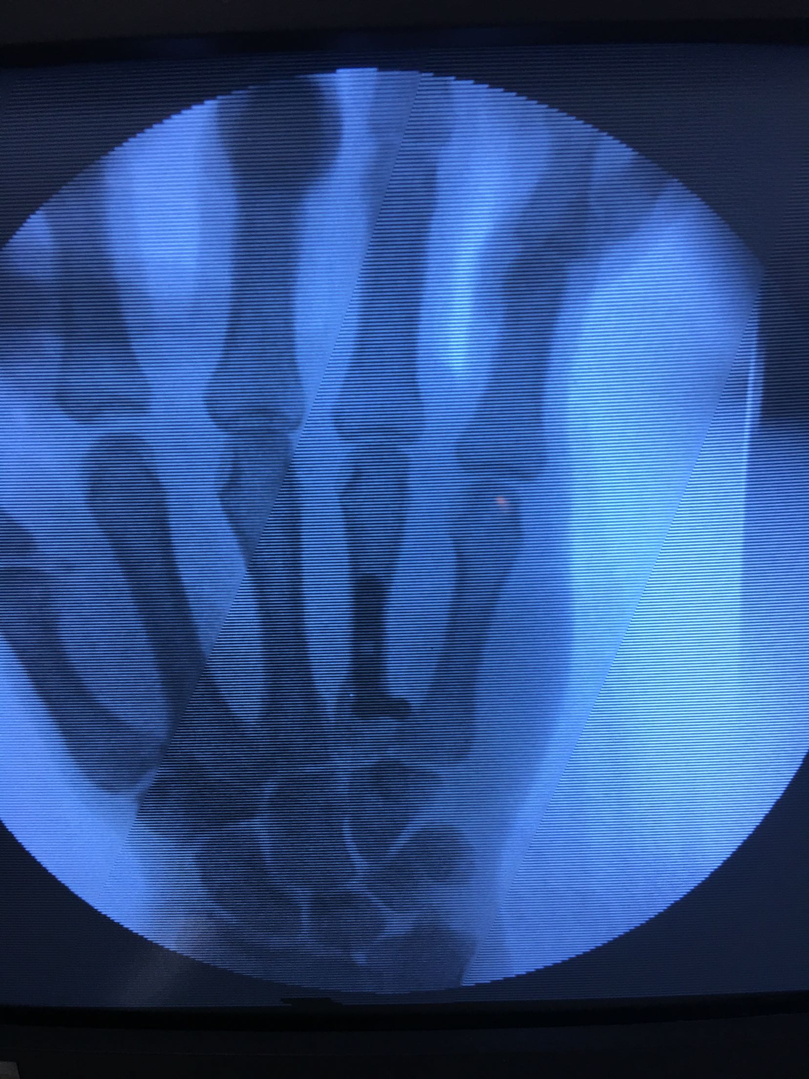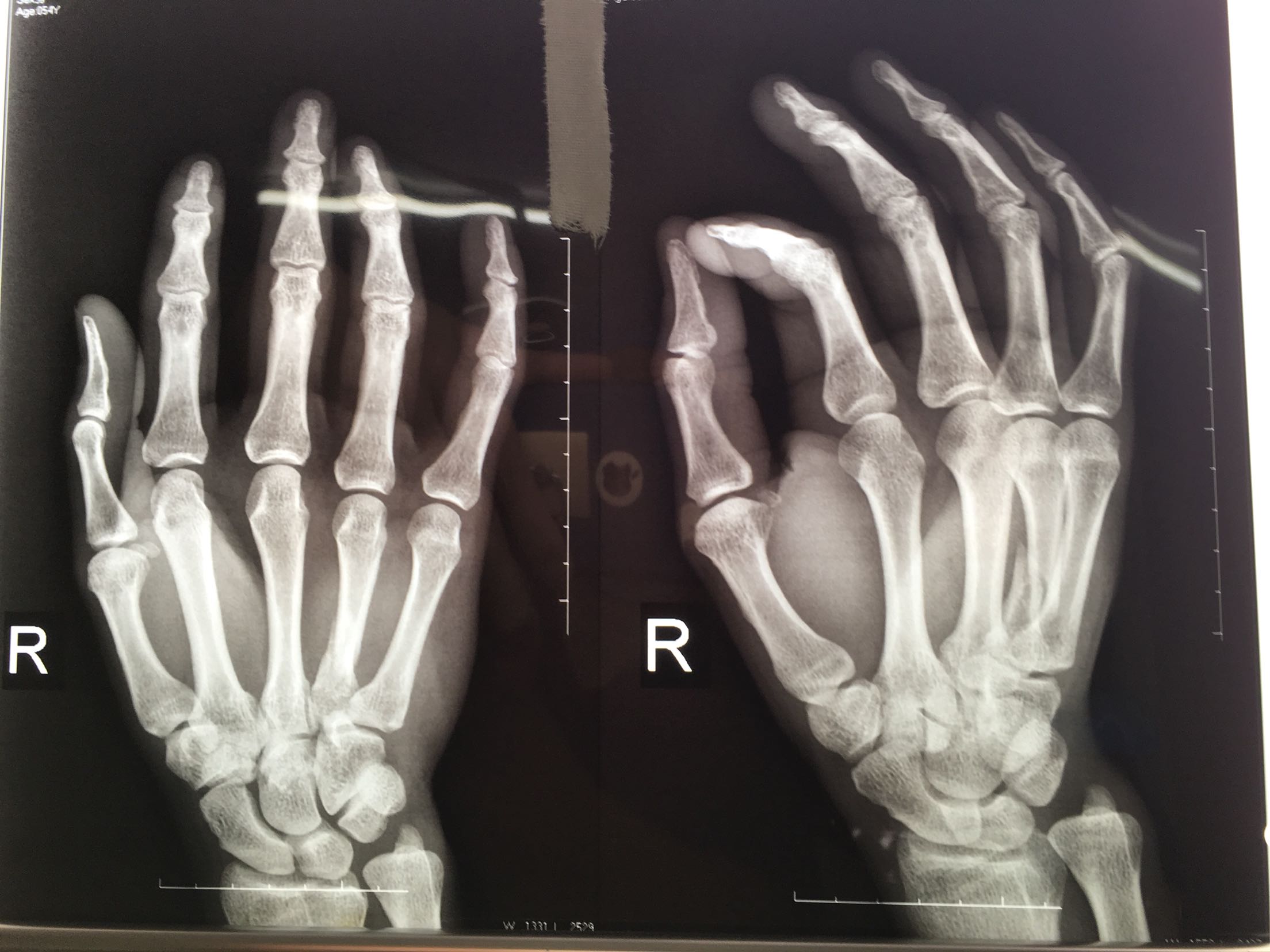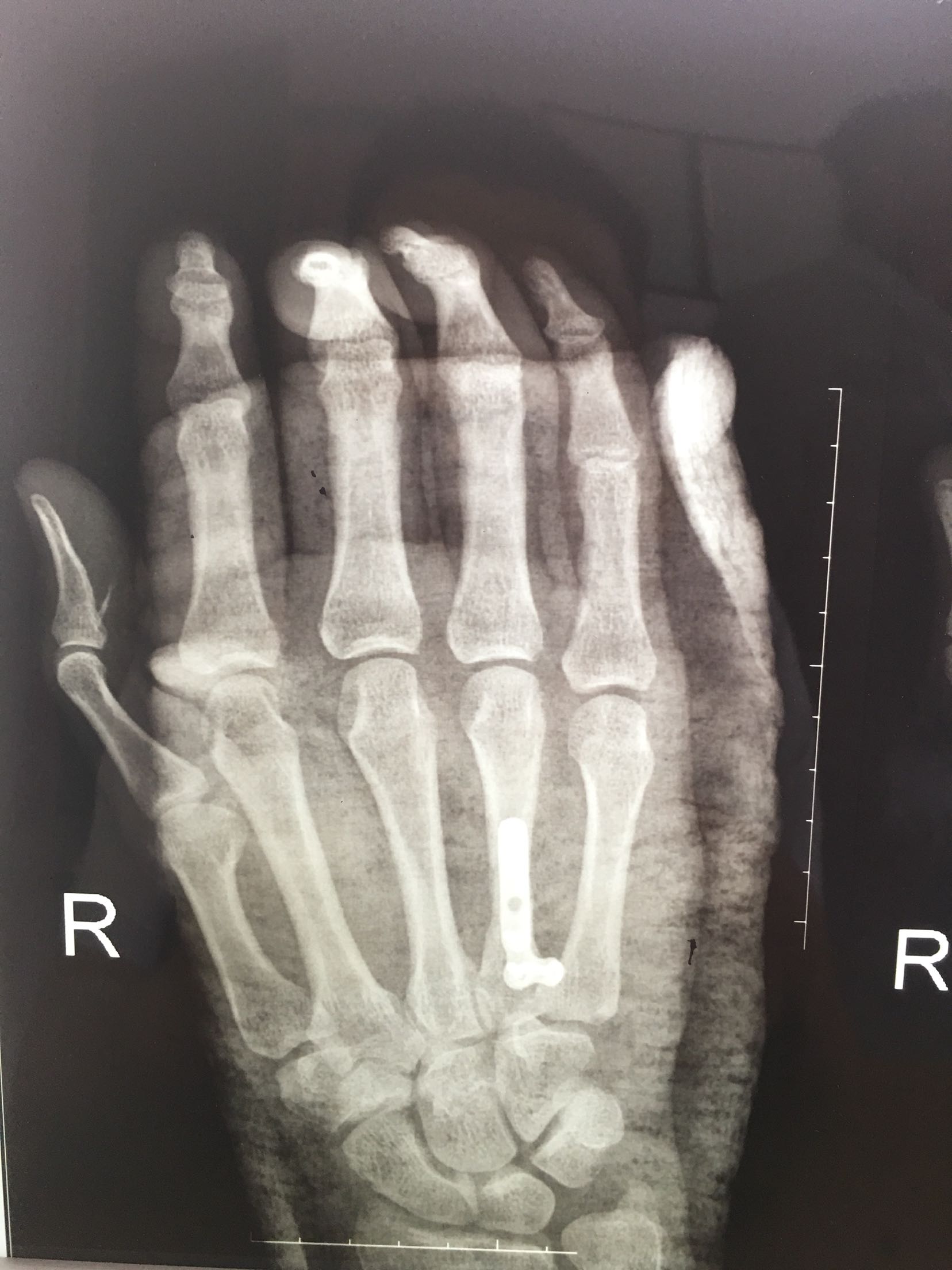 右手掌肿胀明显,皮色皮温正常,局部压痛,纵叩痛阳性,可及骨擦感,第四掌指关节活动受限,末梢血运感觉正常。