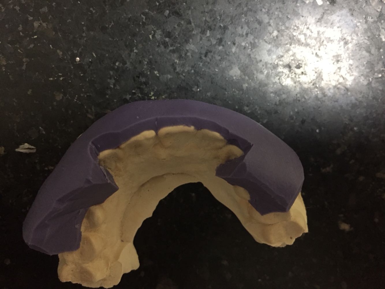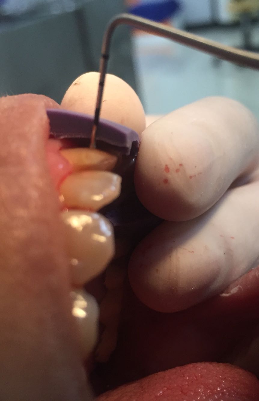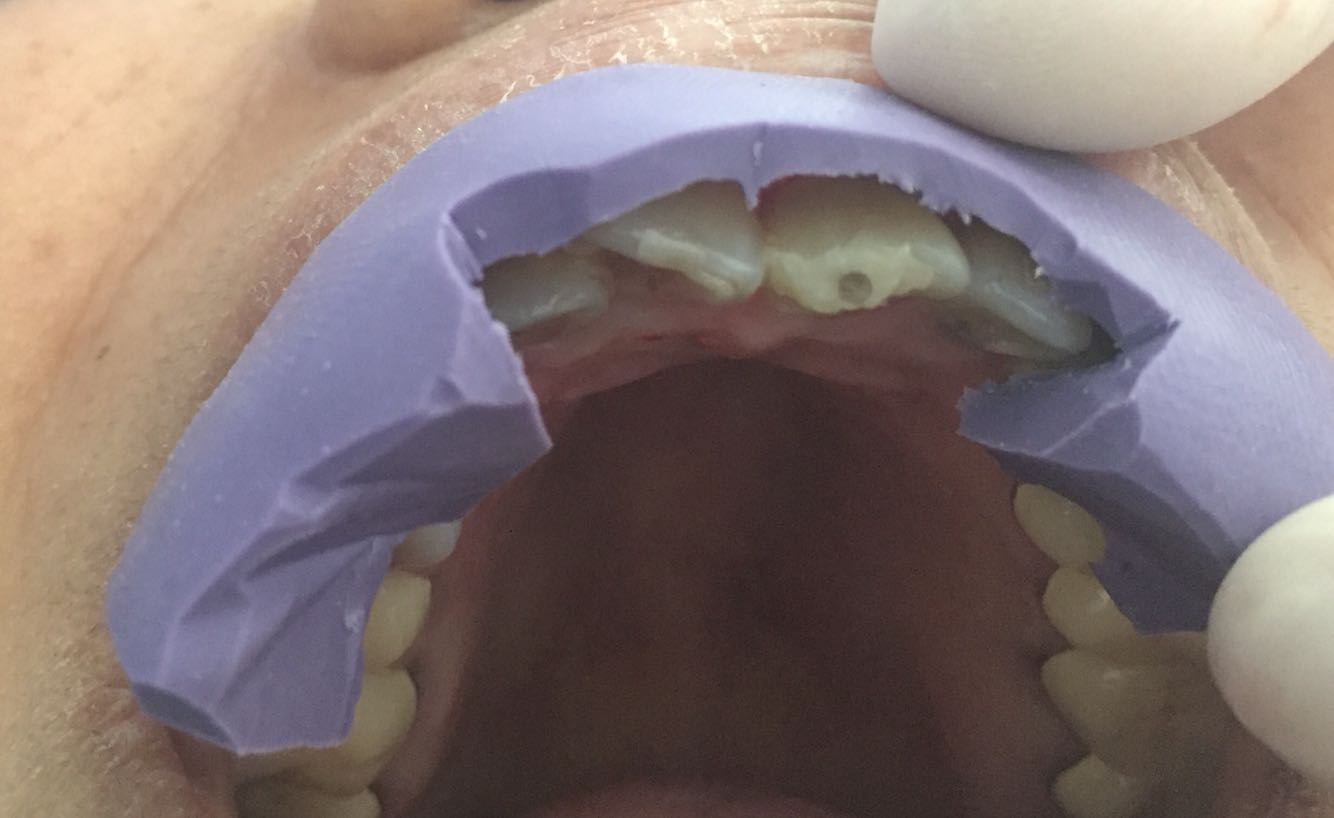 21置入纤维桩后行11,21牙体预备 先预备11远中轴面,露髓后行一次法根充,预备至硅橡胶导板可顺利就位时,以导板做目标修复,再次预备牙体,术中硅橡胶反复对比把控预备量