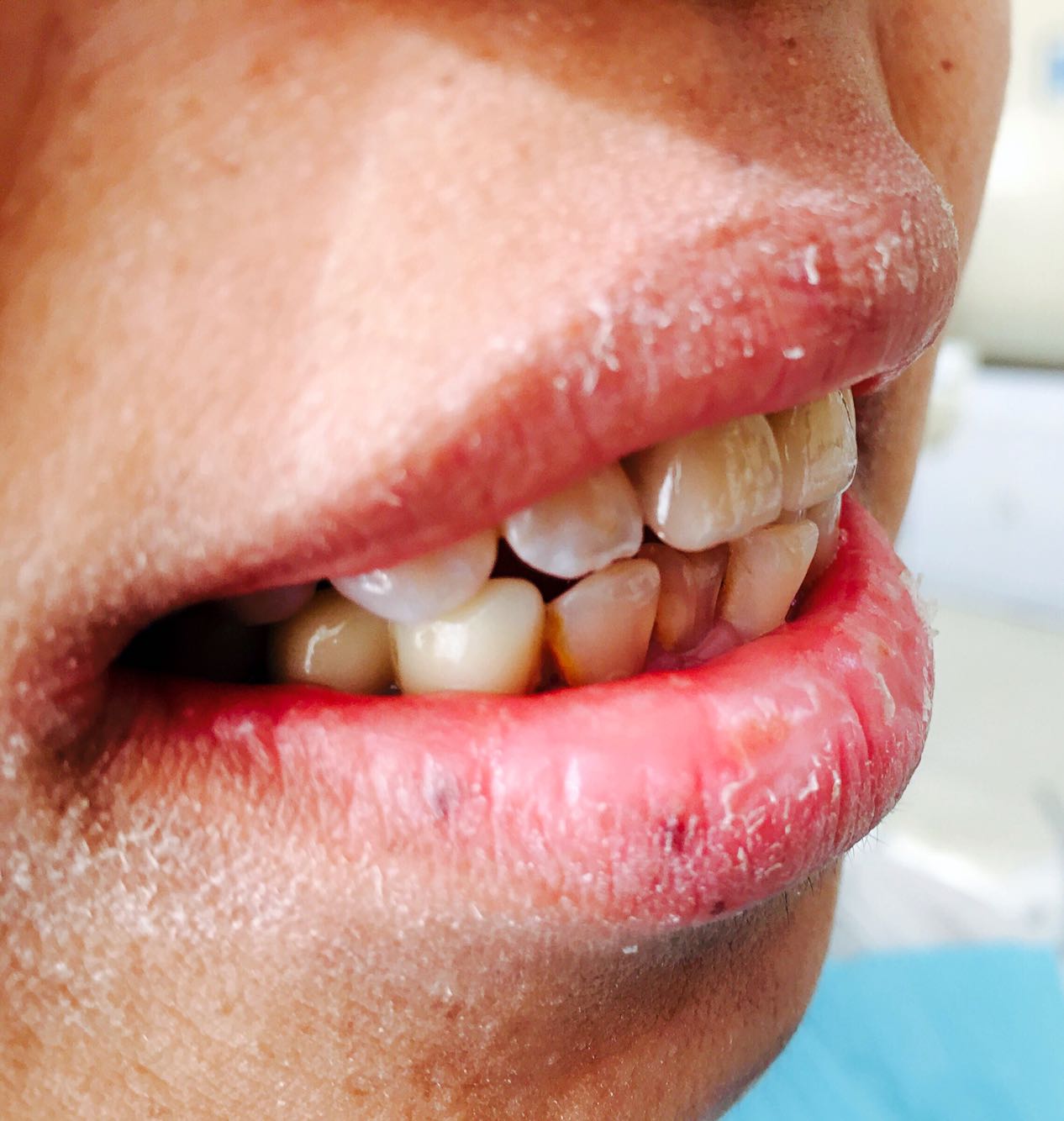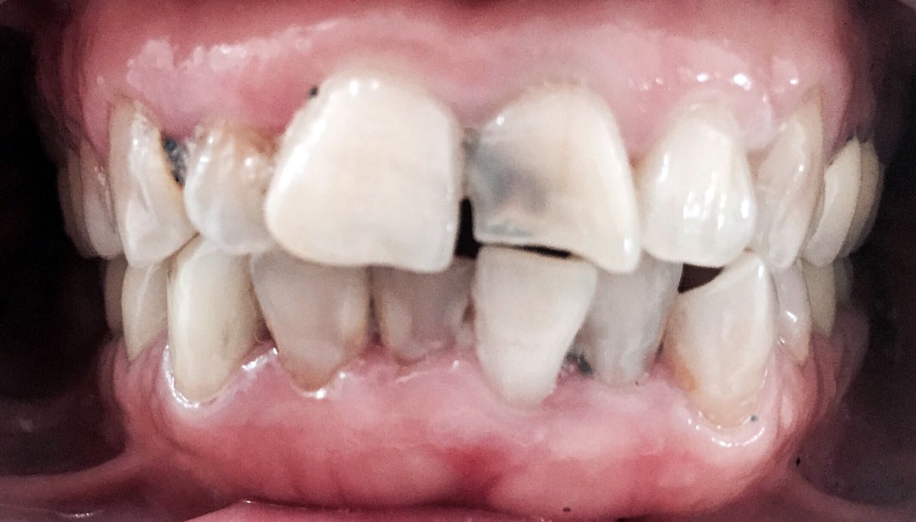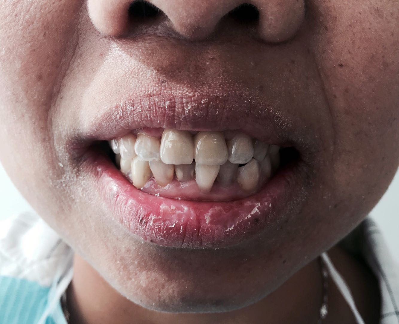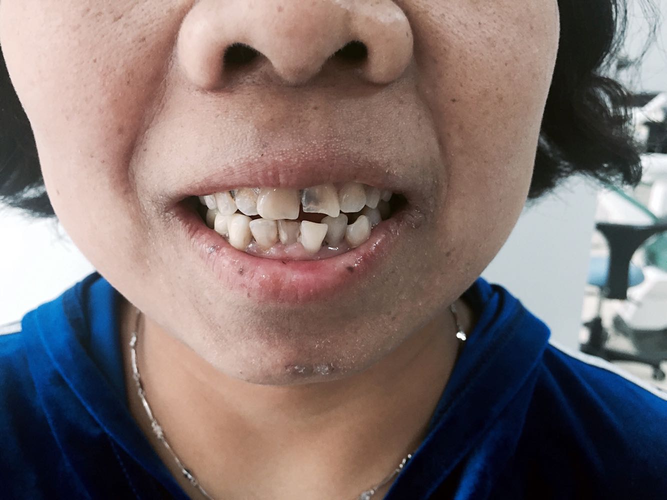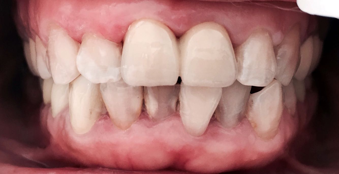 三诊,试戴全瓷冠,边缘密合,颜色尚可。冠粘接前对12,13行树脂修复已改善前牙美学效果。冠粘接术后即刻照。