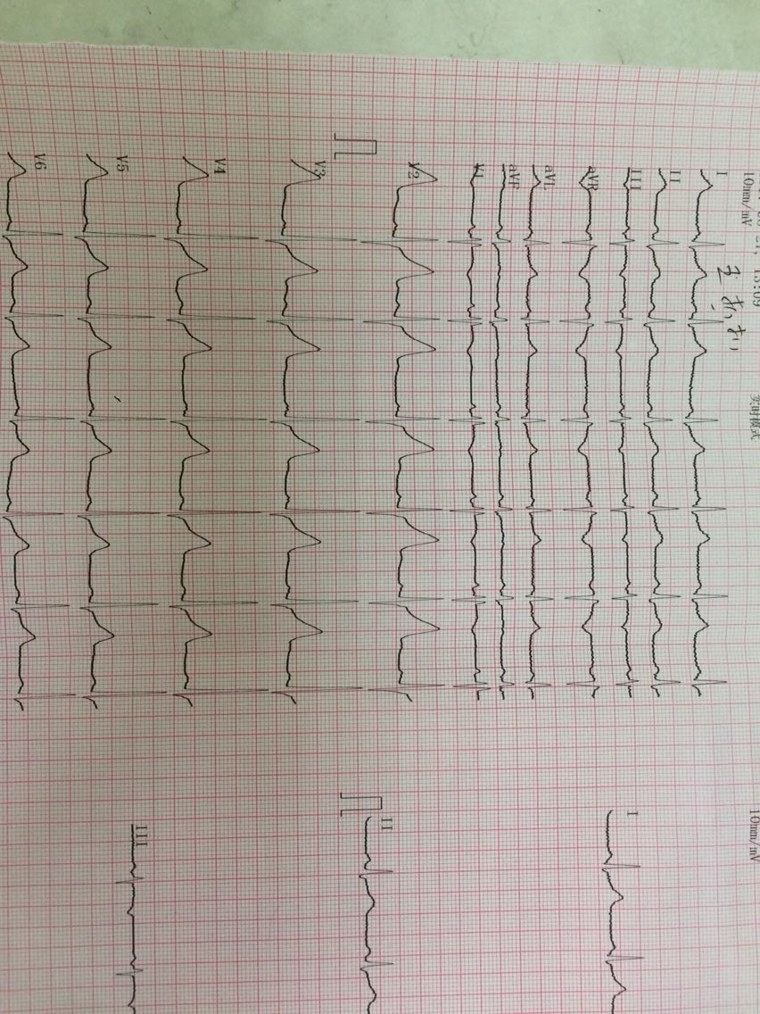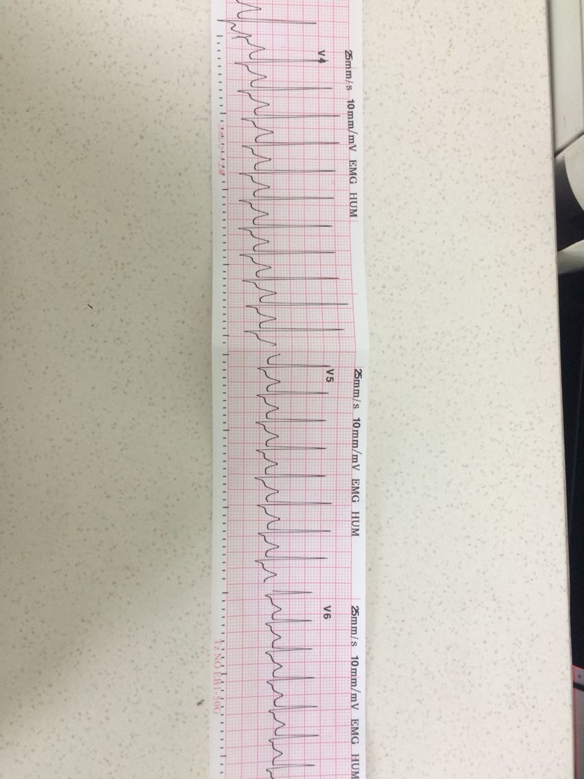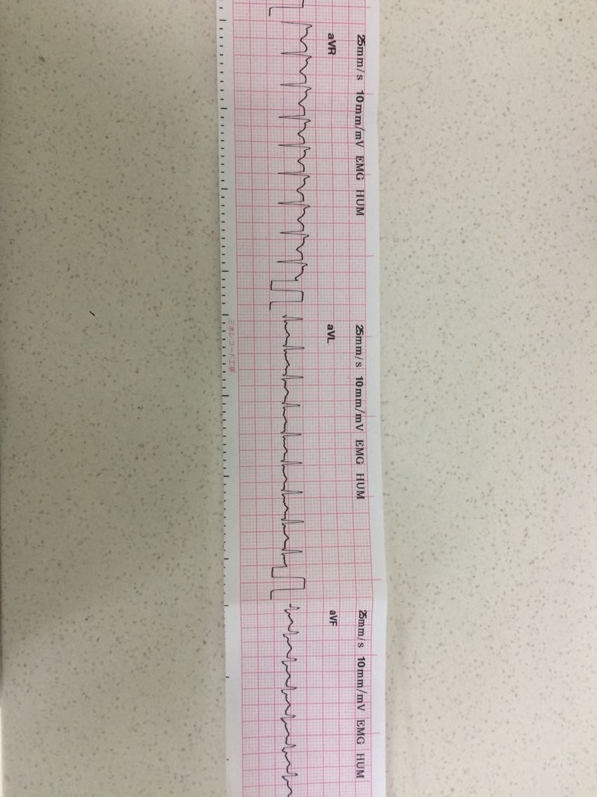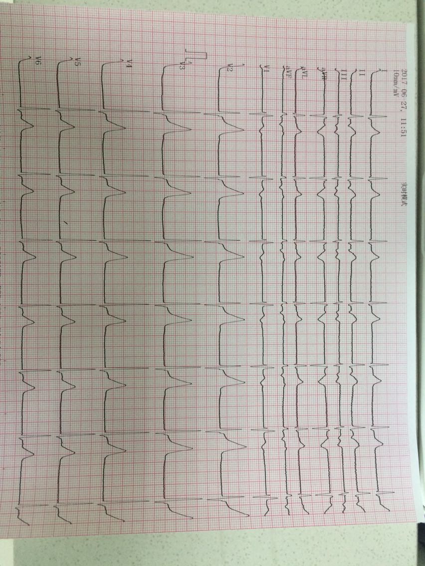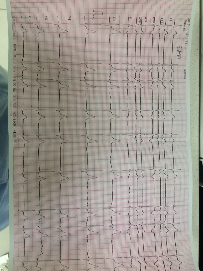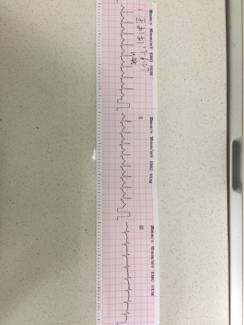 诊断:心律失常 阵发性室上性心动过速 低血压状态 治疗:予普罗帕酮70mg缓慢静推后心率下降至135次/分,予葡萄糖250ml+普罗帕酮140mg 10滴/分静点数分钟后心界监护呈逸搏心律,室率35一45次/分,停普罗帕酮后逐渐转为窦性心律,室率60次/分左右,仍有房早、窦停现象。