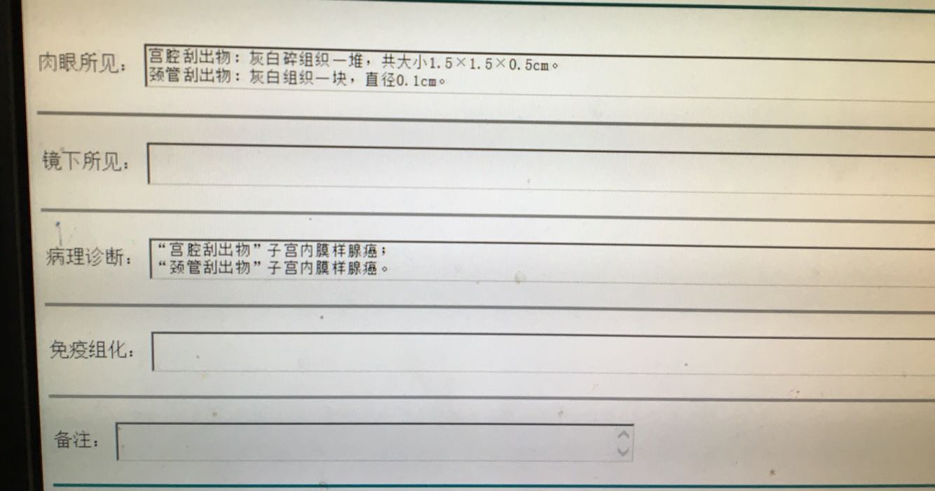 妇科检查: 妇科检查: 外阴(-);阴道畅,少量血性分泌物;宫颈轻糜,无活动性出血;宫体中位,常大,质中,无压痛;附件未及异常,无压痛。 辅助检查:我院 【ECG】ST段改变。 【妇科B超】内膜双侧厚:16,回声不均匀,内引出血流信号,与周围肌层分界不清。诊断意见:子宫内膜增厚,回声不均匀,Ca待查,请结合临床。