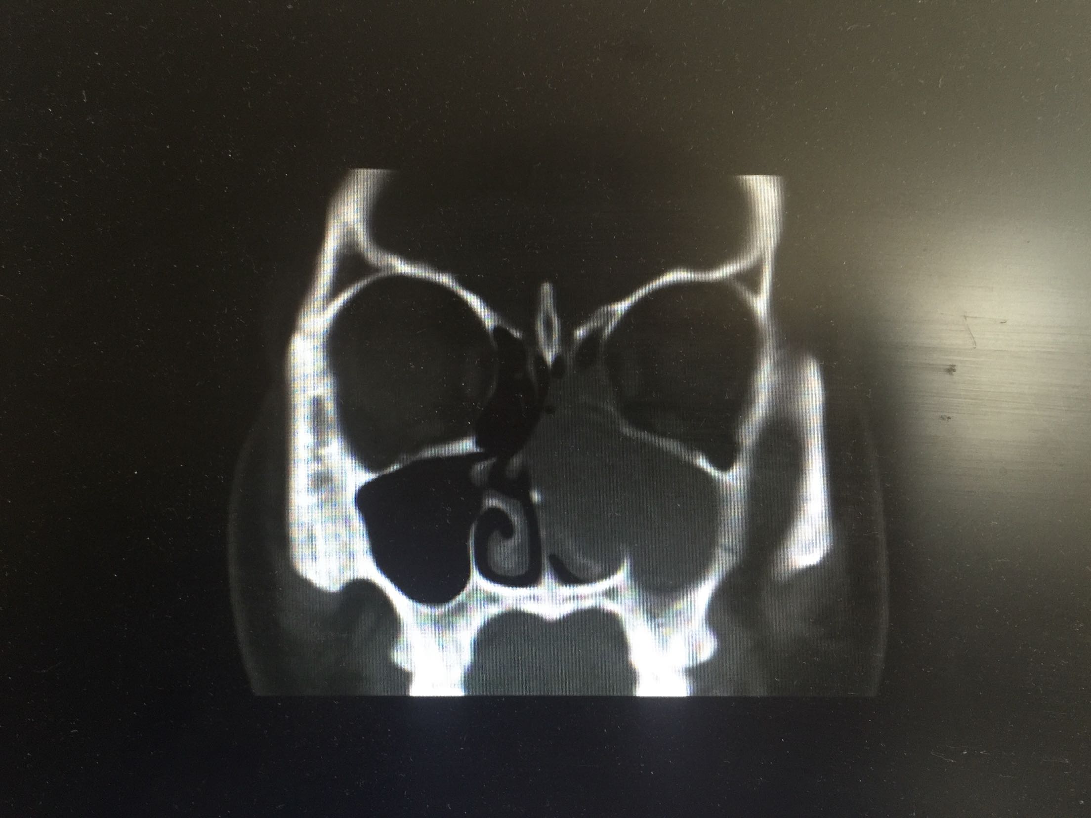 查体:鼻腔黏膜慢性充血,双侧下鼻甲、中鼻甲肥大。鼻内镜:左侧中鼻道可见少量息肉样新生物。鼻窦冠状位CT:左侧上颌窦占位性病变,不排除内翻性乳头状瘤。