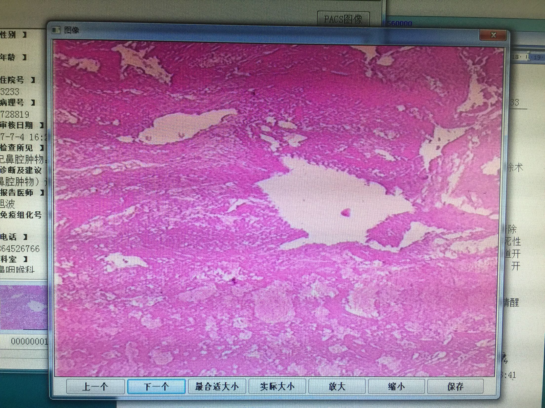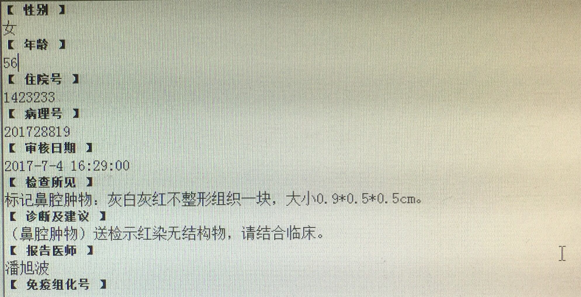 术后病理结果:坏死无结构组织。 诊断:上颌窦出血坏死性息肉(左) 讨论:出血坏死性息肉临床上较少见,是发生于鼻-鼻窦的一种良性病变,但其在临床表现、影像学及病理上易与恶性肿瘤、血管瘤、内翻性乳头状瘤等相混淆,故容易误诊。临床上其命名尚不一致,因其多发于上颌窦,较多命名与上颌窦相关联,如:“以出血坏死为特征的上颌窦炎”、“上颌窦海绵样血管瘤”、“慢性出血坏死性上颌窦炎”、“上颌窦出血坏死性息肉”等;尚有“血管瘤性息肉”、“出血性鼻-鼻窦息肉”、“栓塞性血管瘤性鼻息肉”、“血管扩张性鼻息肉”、“血管性肉芽肿”、“炎症性毛细血管扩张性肉芽肿”等命名。国内目前较常用的命名是出血坏死性息肉,国外较常见的为血管瘤性息肉。Y fantis和Shea-han等认为血管瘤性息内是炎症性鼻-鼻窦息肉其中的一种类型,较多见于上颌窦后鼻孔息肉的进一步发展,但也可见于其它类型的鼻-鼻窦息肉;国内较多报道认为出血坏死性息肉是发生于上颌窦的一种以出血坏死为特征的息肉或黏膜慢性炎症,认为其是一种特殊类型的上颌窦炎,也有报道发生于鼻腔的出血坏死性息肉。病因及发病机制出血坏死性息肉的病因尚不明确,一般认为可能与感染有关。 该患者以鼻塞为主要症状,无鼻出血,就诊于当地医院影像学检查误以为恶性肿瘤。最近阿宝的父亲在当地被误诊为“主动脉夹层”有人问“事后家属对县医院的CT诊断没有提出过一丁点的质疑或不满?”阿宝回答“CT诊断取决于多方面因素,包括仪器设备先进程度和图像分辨率,不是所有的医院都有最先进分辨率最高的CT机。”每一个医生都是尽力救治患者,有时条件有限,理解万岁。 该患者目前术后二周,恢复良好,无不适。
