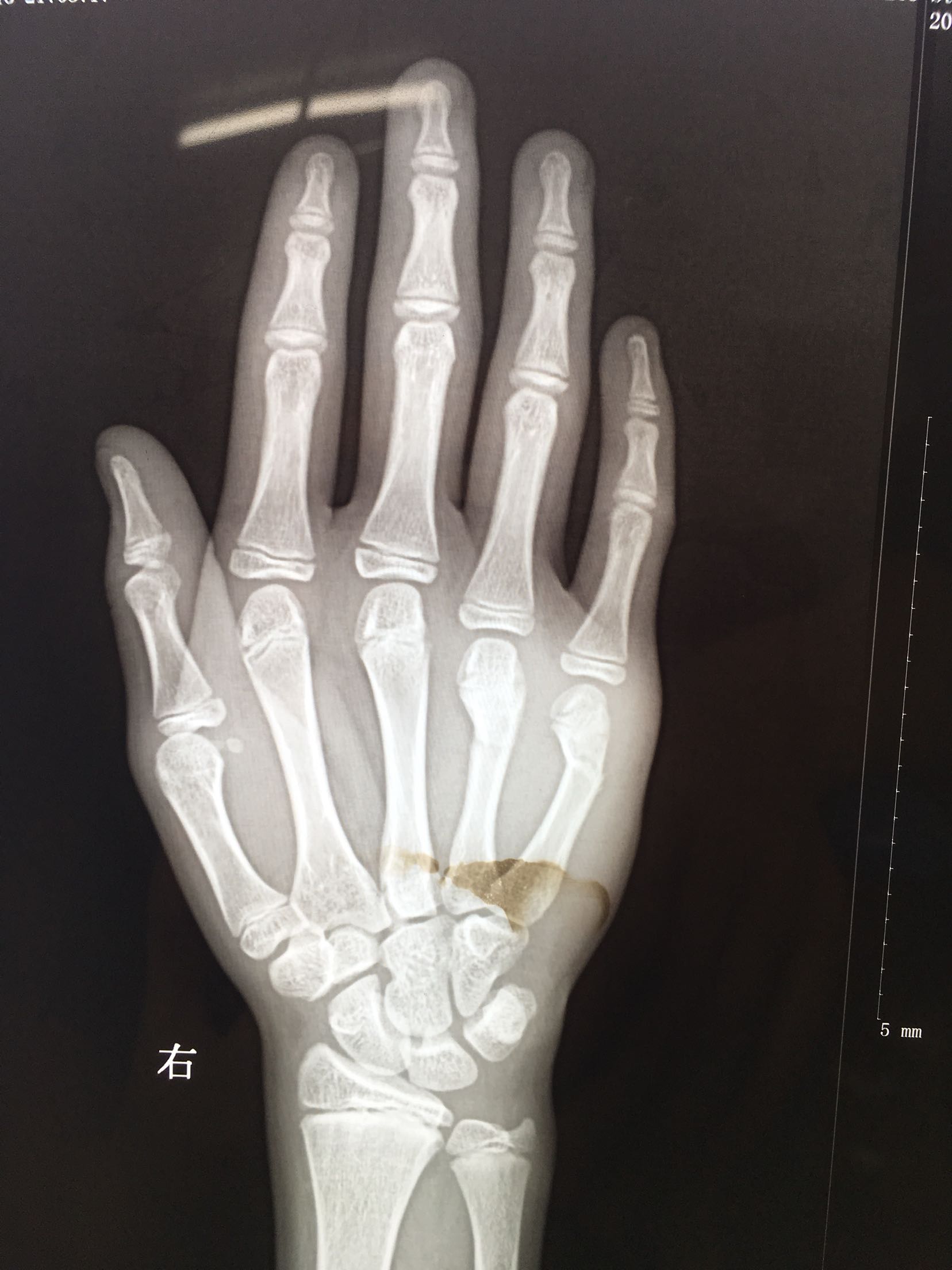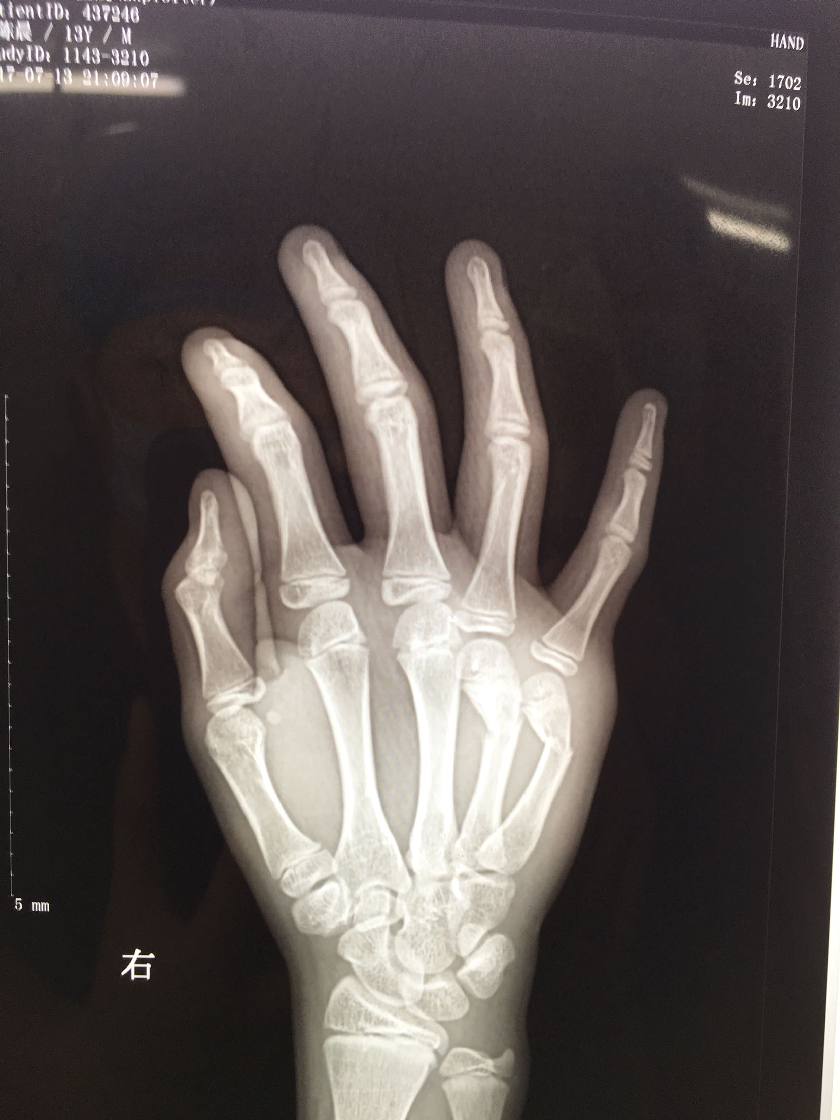 患者,男,13岁,撞伤后右手肿痛,活动受限1天入院。