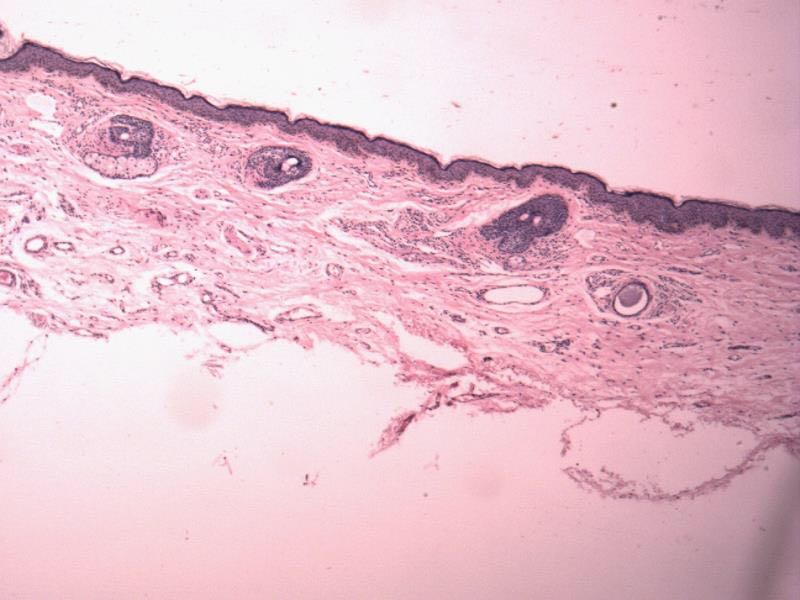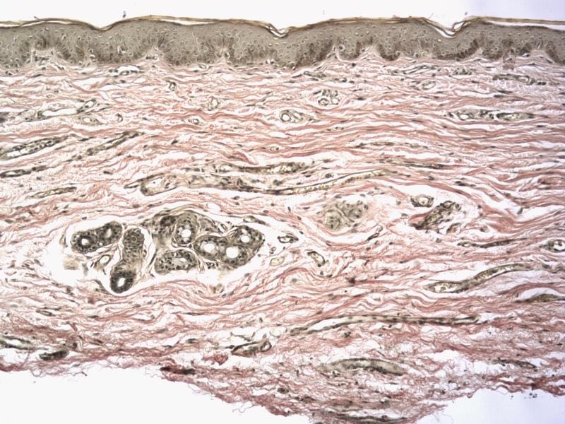 发育正常,体型偏瘦,智力正常。甲状腺无肿大,全身各系统检查无异常。皮肤科情况:双上眼睑松弛下垂,未遮盖瞳孔,皮肤萎缩变薄,呈淡红色,可见明显毛细血管扩张,双上睑边缘皮肤轻度肿胀。双下睑无明显异常,眼球不突出。双上睑内侧对称分布黄豆大小黄色斑块,边界清楚,质地柔软。上唇肥厚肿大呈双唇表现(图1)。实验室检查:血常规、尿常规及大便常规均正常,肝功能、肾功能、血脂全套正常,甲状腺功能五项正常,甲状腺超声检查示双侧甲状腺未见异常。取右上睑外侧皮肤行组织病理检查示:表皮大致正常,真皮明显萎缩变薄,真皮内毛细血管扩张、增生,血管及附属器周围多少不等的炎性细胞浸润(图2)。Verhoff染色示:正常一侧真皮弹性纤维大致正常,病变一侧真皮弹性纤维明显减少或缺失(图3,图4)。