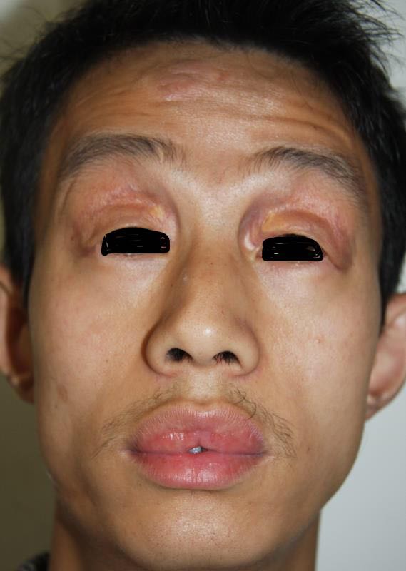 患者男,29岁,主诉双上睑下垂、黄斑伴口唇肿胀10年。患者出生后双眼睑及口唇正常。10年前无明显诱因出现双上睑反复水肿,开始时约2~3天消退,曾多次就诊于当地医院,考虑为“过敏”,给予抗组胺药口服治疗,眼睑水肿仍反复发作。约半年后水肿不能自行消退,双上睑皮肤逐渐变薄,上睑下垂,睑内侧出现界限清楚地黄色斑块,同时口唇轻度肿胀,无明显自觉症状,视力无异常变化,不伴有其他全身症状。未进一步行特殊诊治。随年龄增长,双上睑皮肤明显变薄,其上黄色斑块逐渐增大且高出皮面,口唇明显肿胀,以上唇明显。患者系足月顺产,一般情况良好,智力正常,近年在外地打工,无特殊不良嗜好。父母非近亲结婚,家族中无类似疾病患者,无特殊遗传疾病病史。
