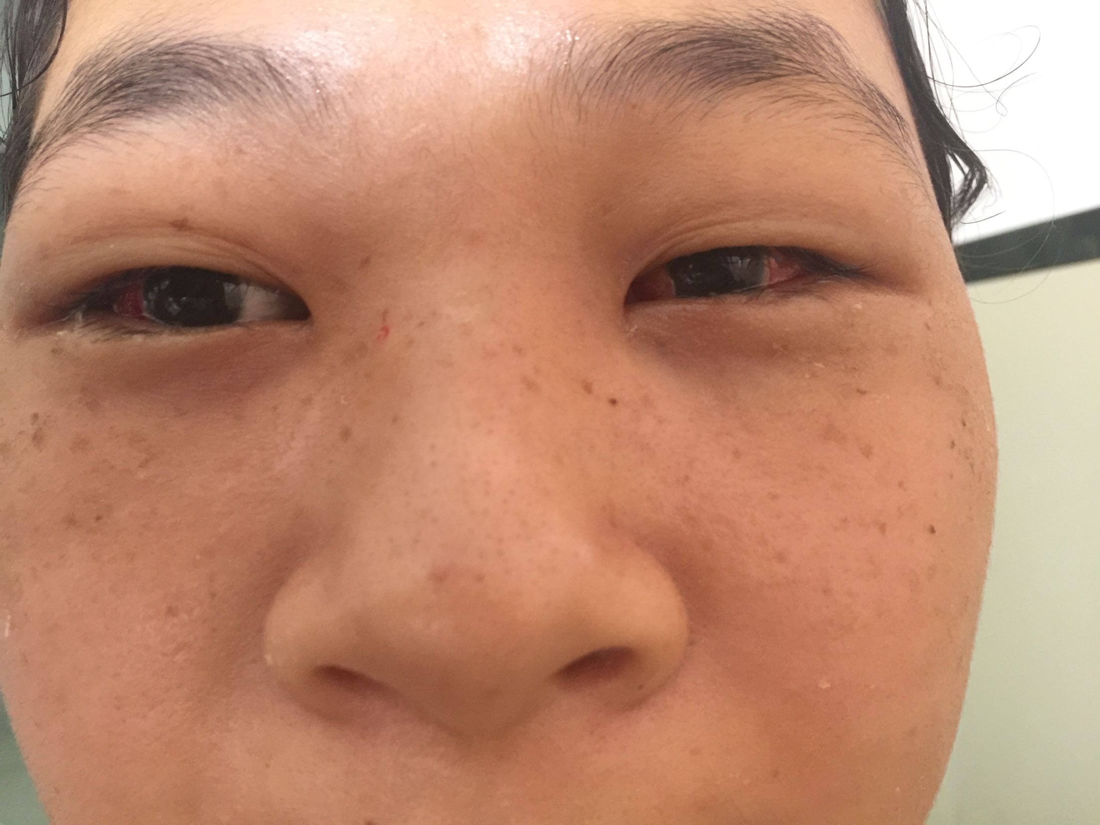 患者手术后第一天,诉眼睛疼睁眼困难。球结膜充血,切口对合齐整缝线在位,角膜透明。33厘米照影,基本正位。共同性外斜视,分为分开过强型,基本外斜型,集合不足型和类似外展过强型。