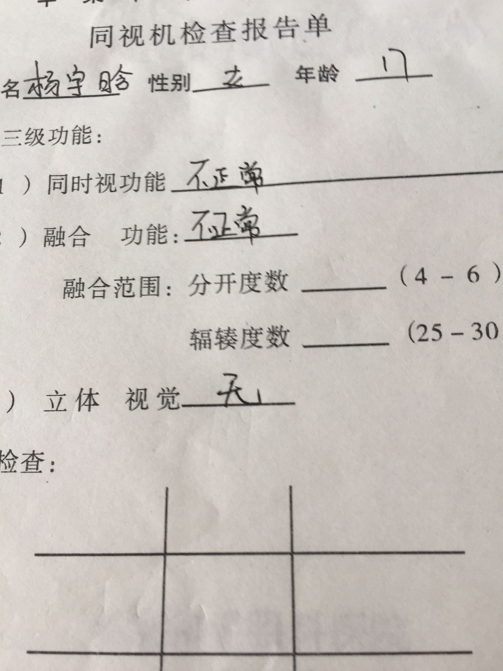 眼斜16年。患者于16年了出生后其母发现眼斜,未做任何治疗,今为矫正眼位而来我院并收入院。既往体健。否认全身病史,眼药过敏史及外伤史。足月顺产。