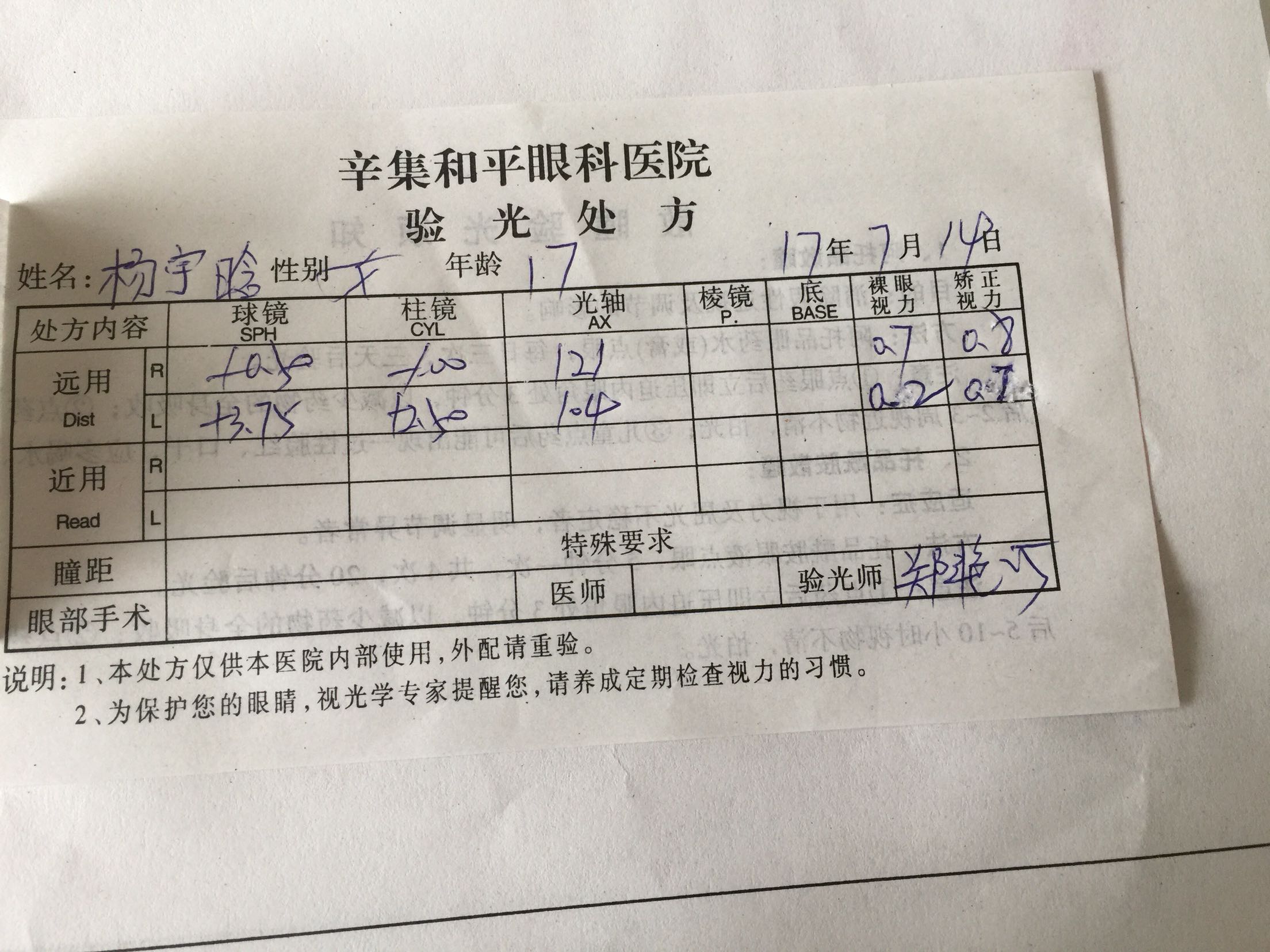 人院查,视力右眼0.7矫正0.8。左眼0.2矫正0.7。双眼前节及眼底未见异常。眼位检查33厘米照影右眼注视左眼-45度,左眼注视右眼-45度。5米照影右眼注视左眼-45度,左眼注视右眼-45度。交替遮盖双眼均由外至正,双眼球转动均到功能位。