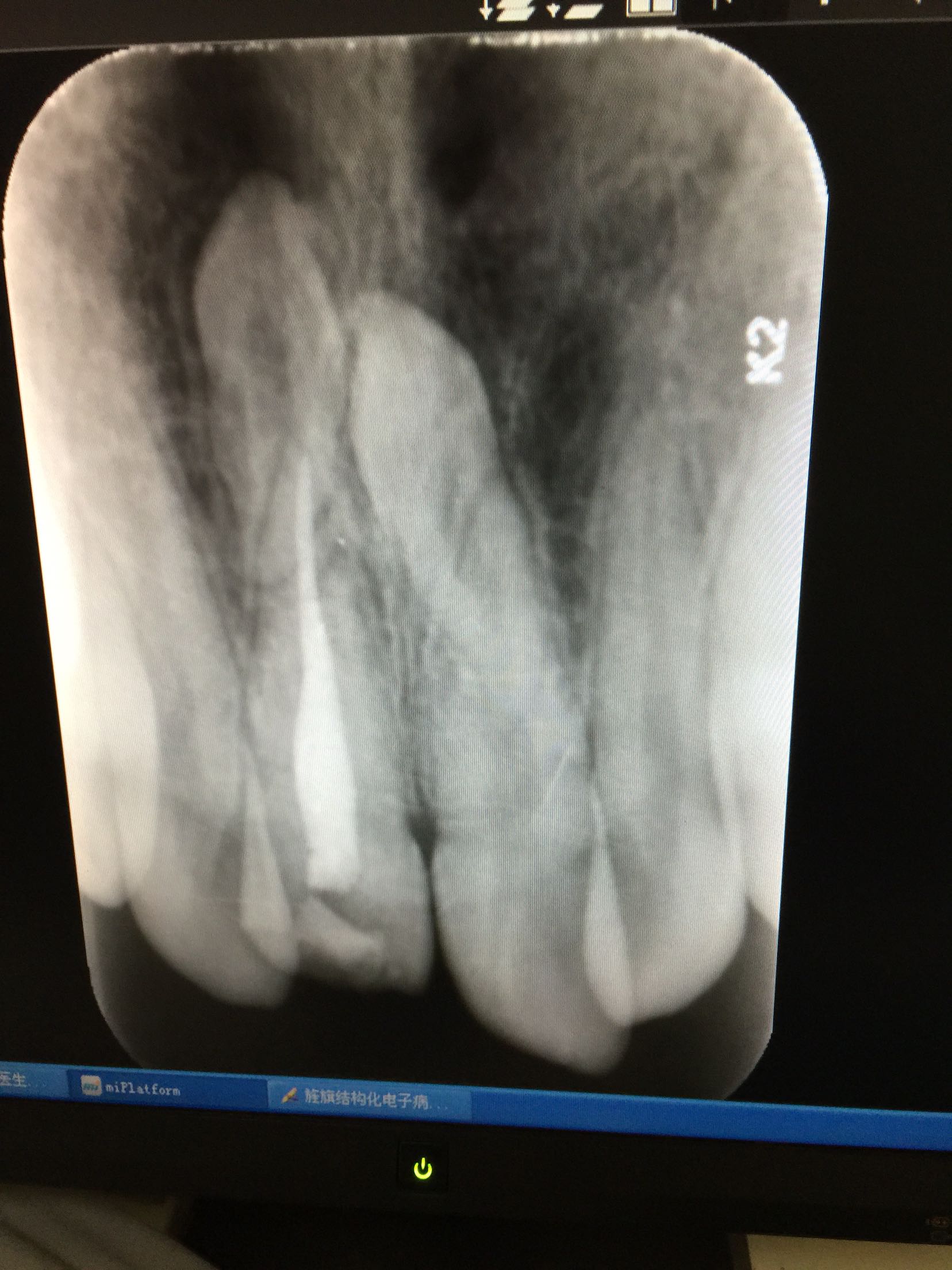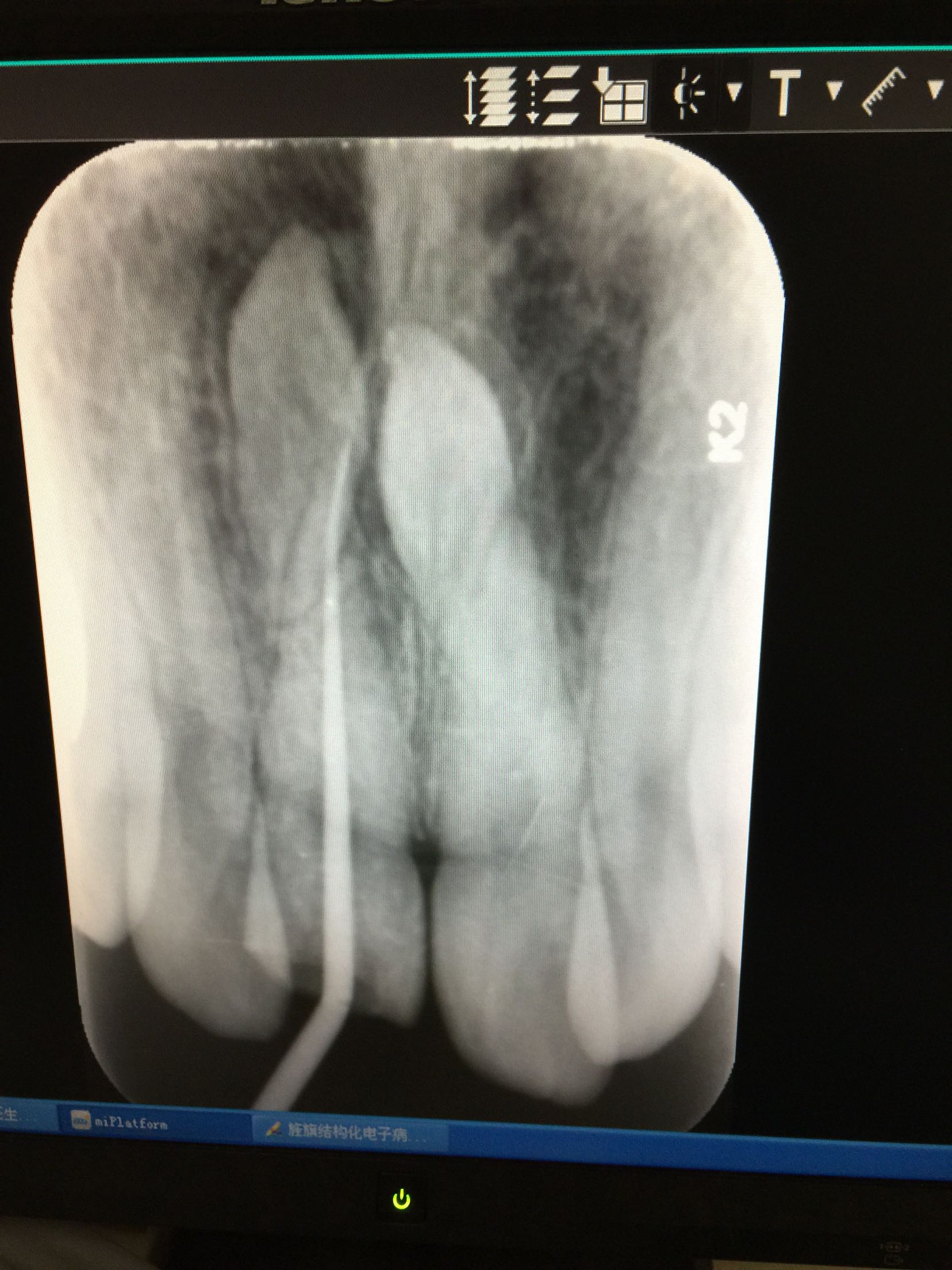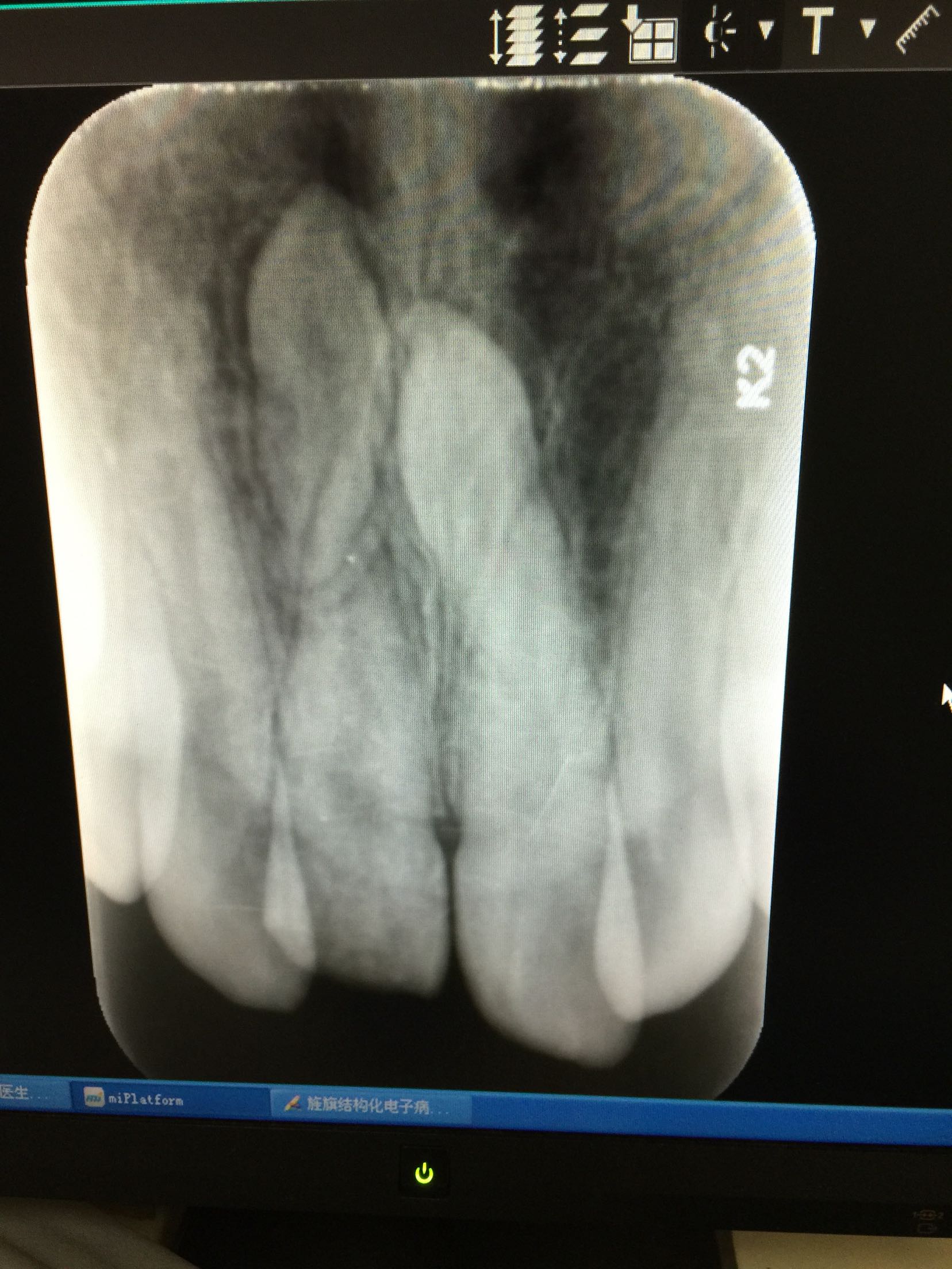 诊断:11牙冠折 治疗计划:11牙行根管治疗+树脂美容修复 治疗:碧蓝麻局部浸润,11牙开髓揭髓顶,牙髓摘除,测长,根管预备,冲洗,消毒,试尖,热充,暂封,约复诊。