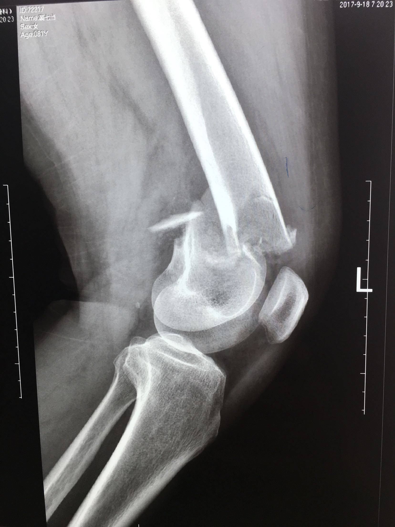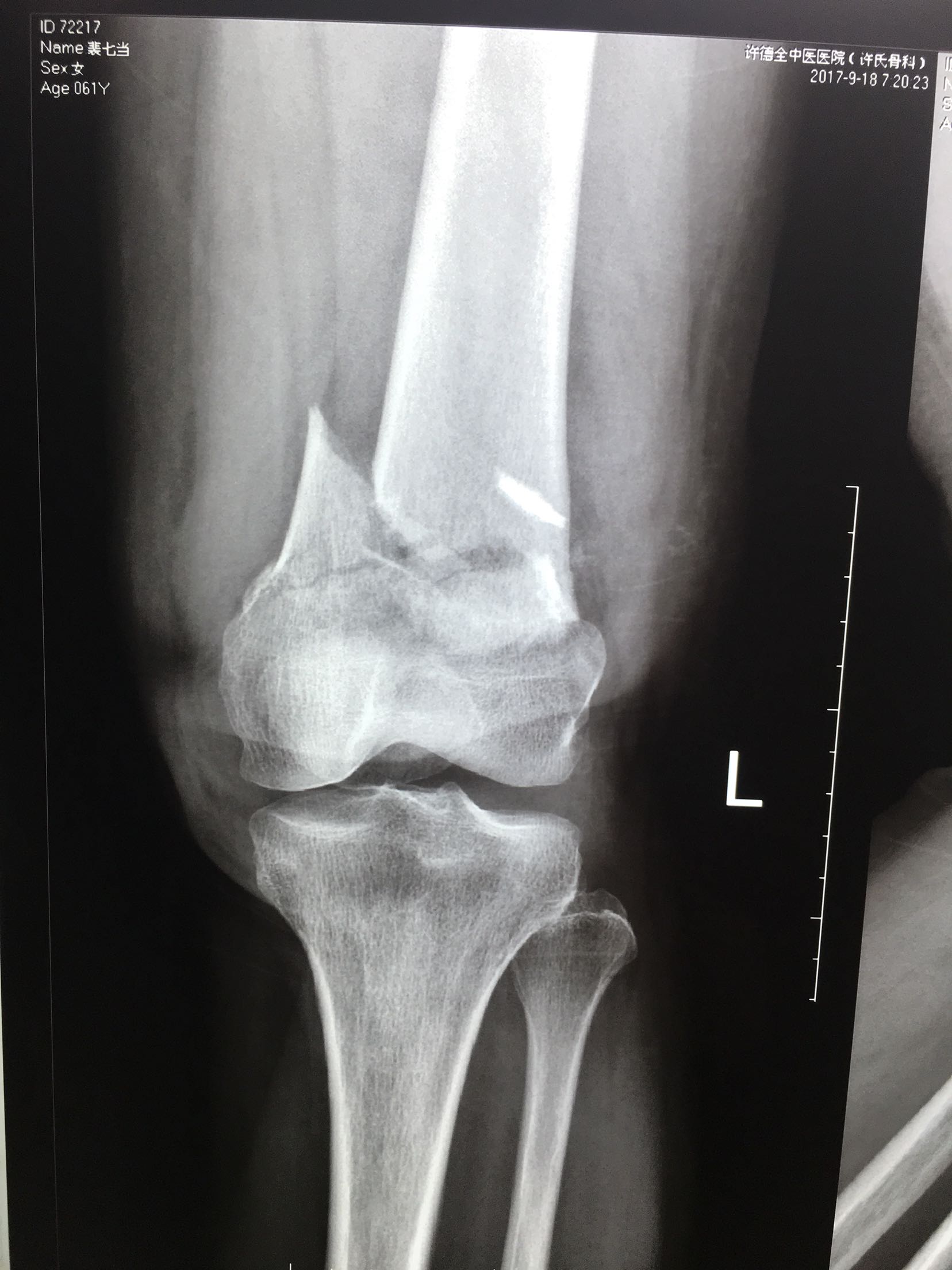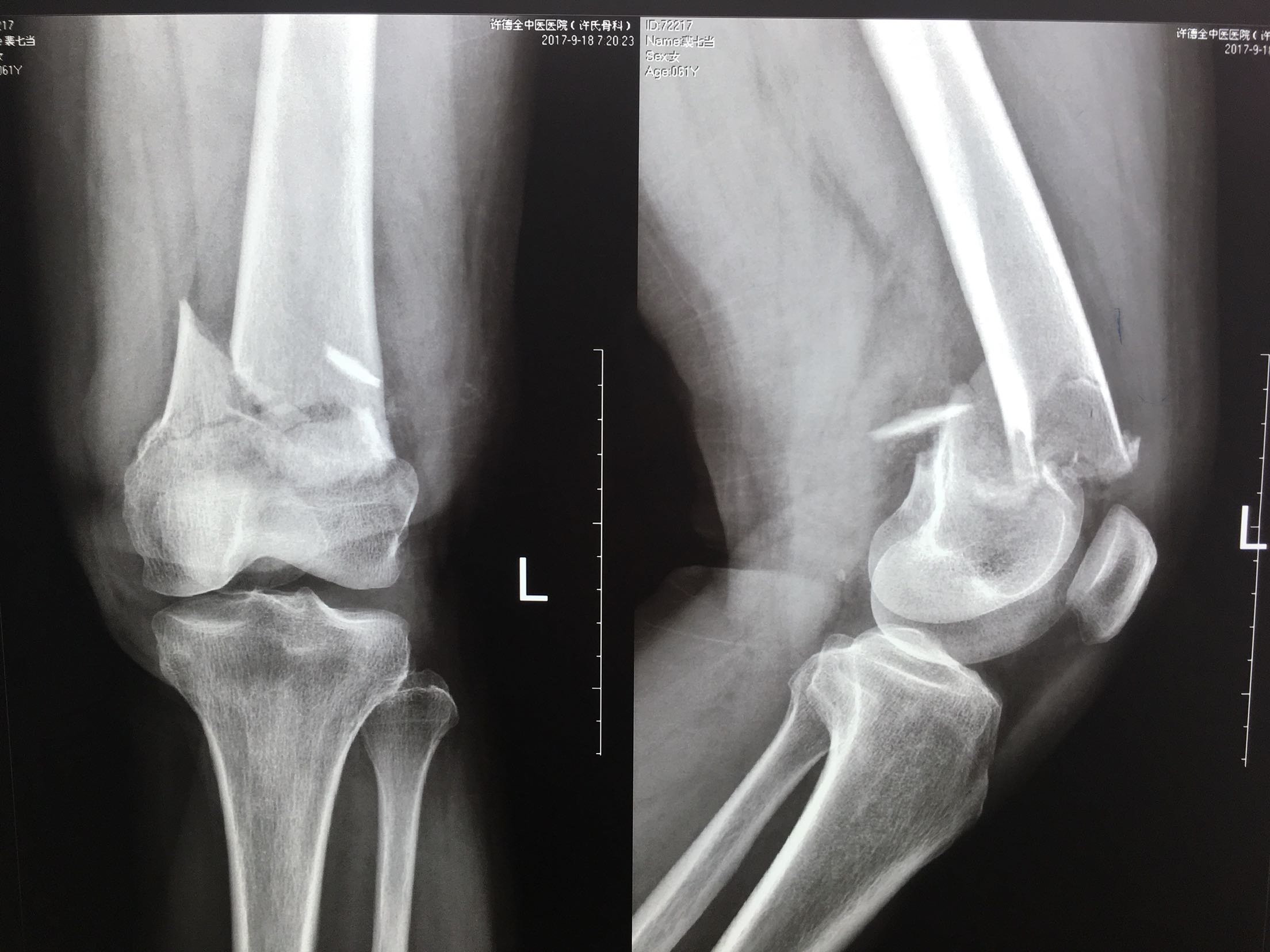 完善检查,急诊在局麻下行胫骨结节骨牵引术。术后一周,病情平稳,在腰麻下行切复内固定术,考虑骨折粉碎,骨质疏松,拟行双钢板固定。术后抗炎,对症治疗,嘱咐一周后早期膝关节微动锻炼。