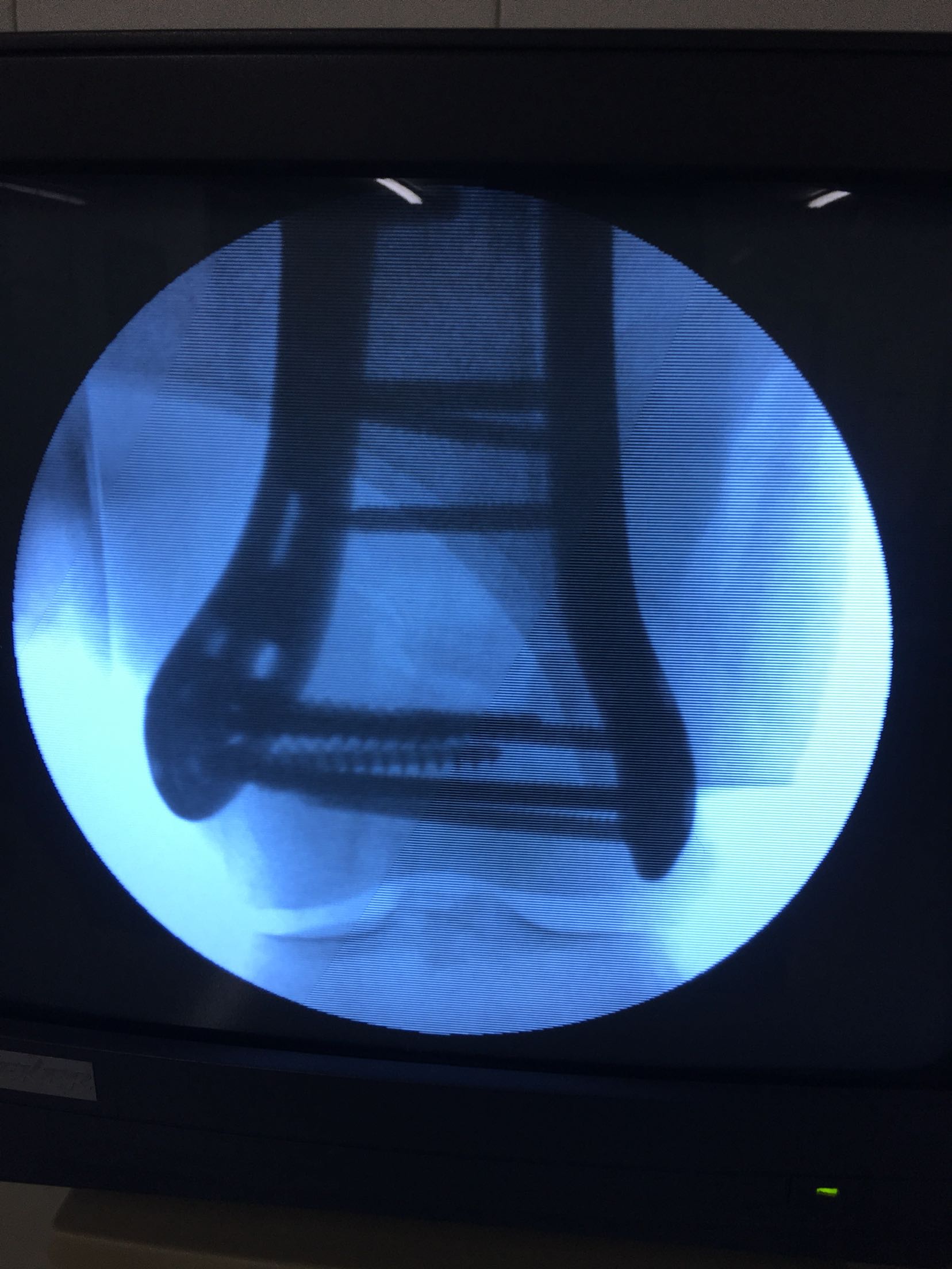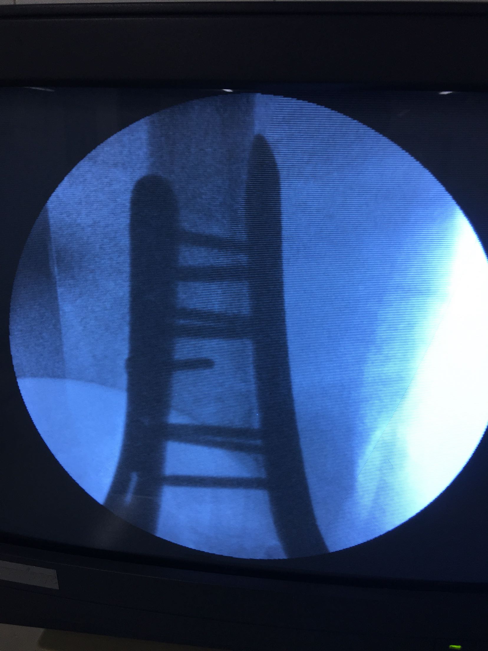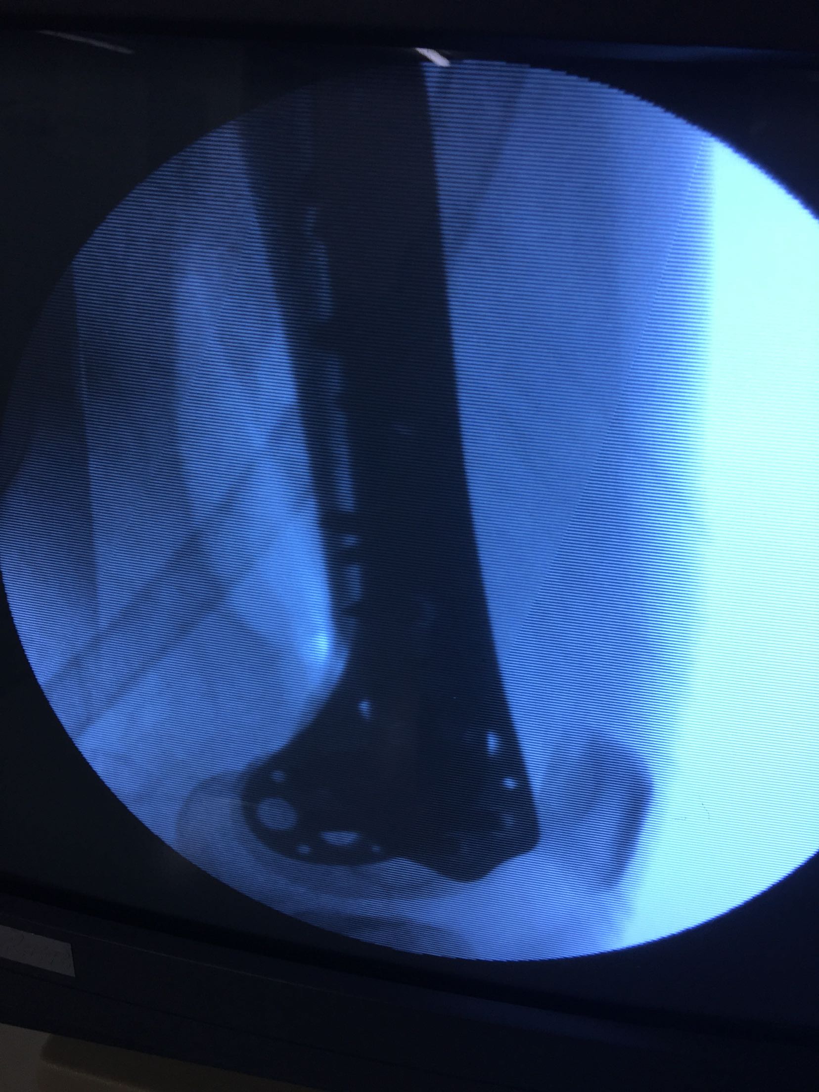 完善检查,急诊在局麻下行胫骨结节骨牵引术。术后一周,病情平稳,在腰麻下行切复内固定术,考虑骨折粉碎,骨质疏松,拟行双钢板固定。术后抗炎,对症治疗,嘱咐一周后早期膝关节微动锻炼。